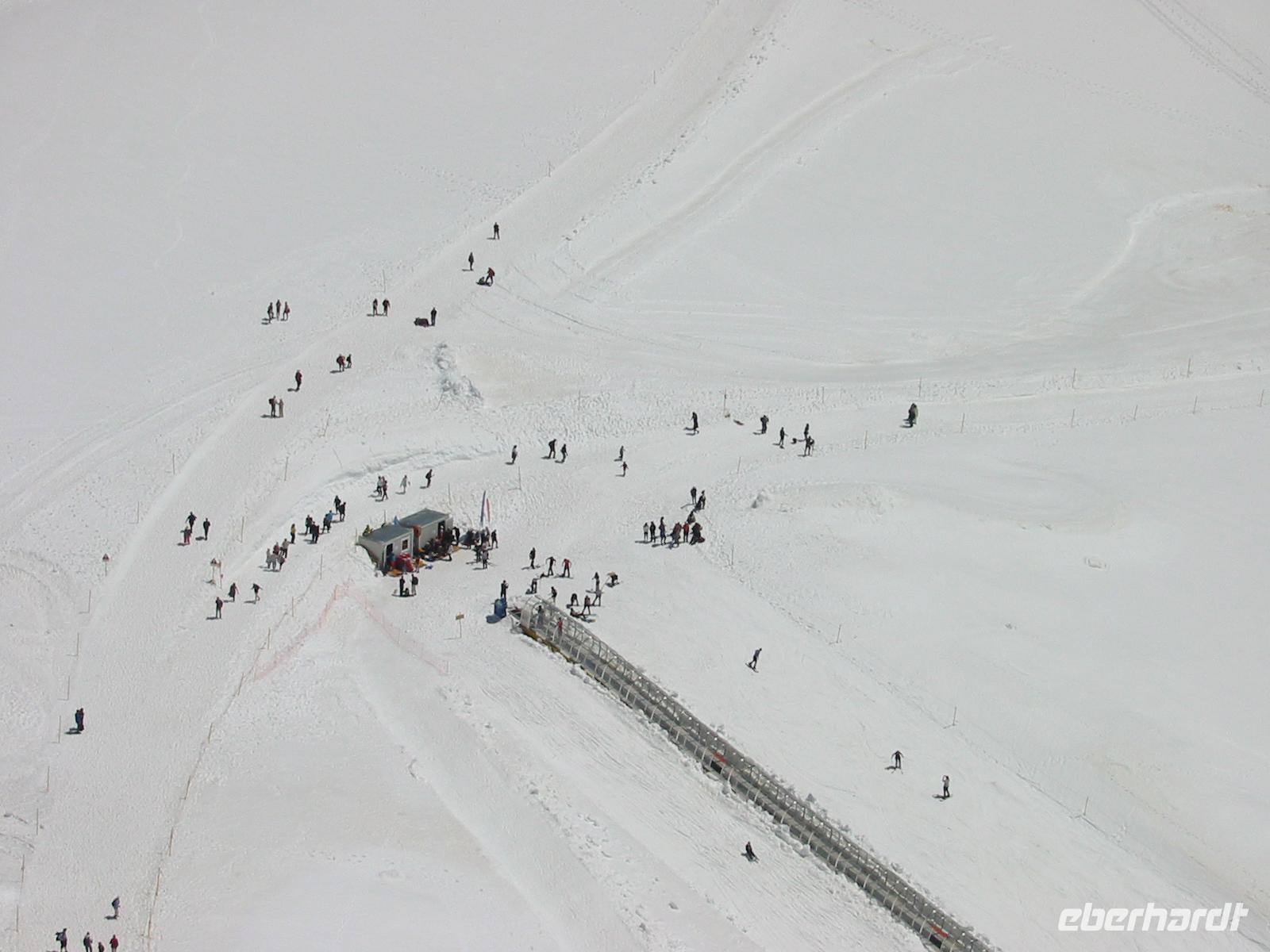 Im Eispalast befanden wir uns 20 Meter unter dem Aussichtsplateau, an der Wasserscheide Europas. Dort türmen sich die Eismassen, die langsam Richtung Norden wandern und deren Wasser einmal in die Nordsee fließen wird. Vor uns öffneten sich lange Gänge höhlenartig, weiten sich zu Räumen und Hallen. In Nischen tauchten die ersten Eisskulpturen auf, bläulich schimmert eine ewige Welt aus Eis. Wieder oben angekommen.