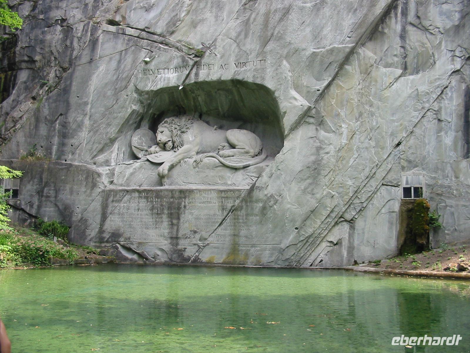 Unweit von Luzern konnten wir Luzerns Hausberg, den Pilatus, deutlich sehen. In Luzern angekommen, fuhren wir auf den Parkplatz am Inseli, ganz in der Nähe vom KKL (Kultur- und Kongresszentrum) und unsere Stadtführerin stieg in den Bus und wir fuhren zum Löwendenkmal. Der sterbende Löwe erinnert an die 1792 beim Tuileriensturm in Paris gefallenen Schweizergardisten. Die Inschrift zeigt die Namen der gefallenen und geretteten Offiziere der Schweizergarde und gibt die ungefähre Opferzahl (DCCLX = 760) und die ungefähre Anzahl der überlebenden (CCCL = 350) Soldaten an.