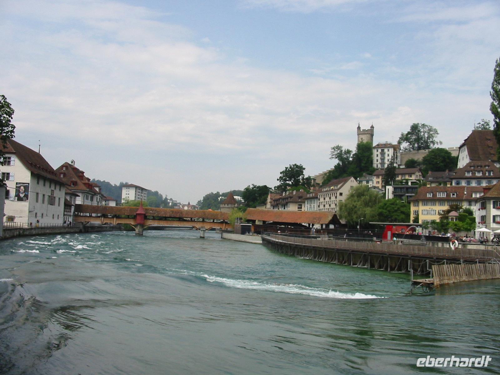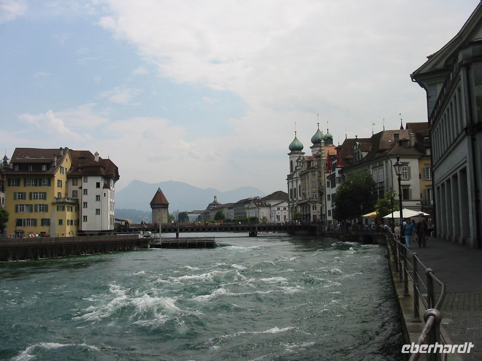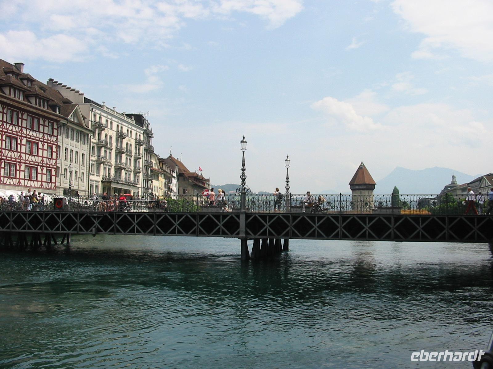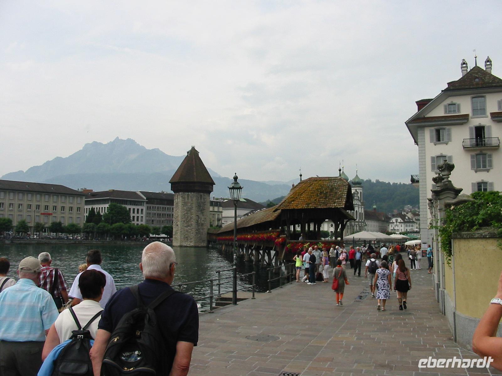 Nach der Besichtigung der Altstadt kamen wir zur Kappelbrücke, dem Wahrzeichen von Luzern. Die Brücke selbst brannte 1993 nieder und wurde nachher komplett wiederaufgebaut. Allerdings sind viele der bekannten Malereien innerhalb der Brücke verloren gegangen. In der Mitte der Brücke trohnt der Wasserturm.