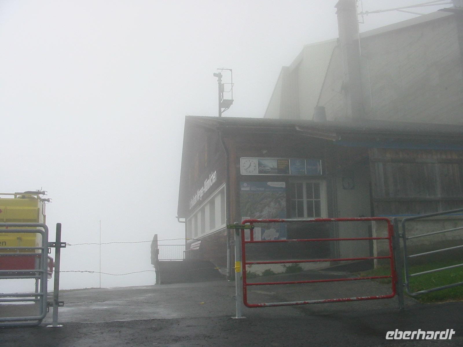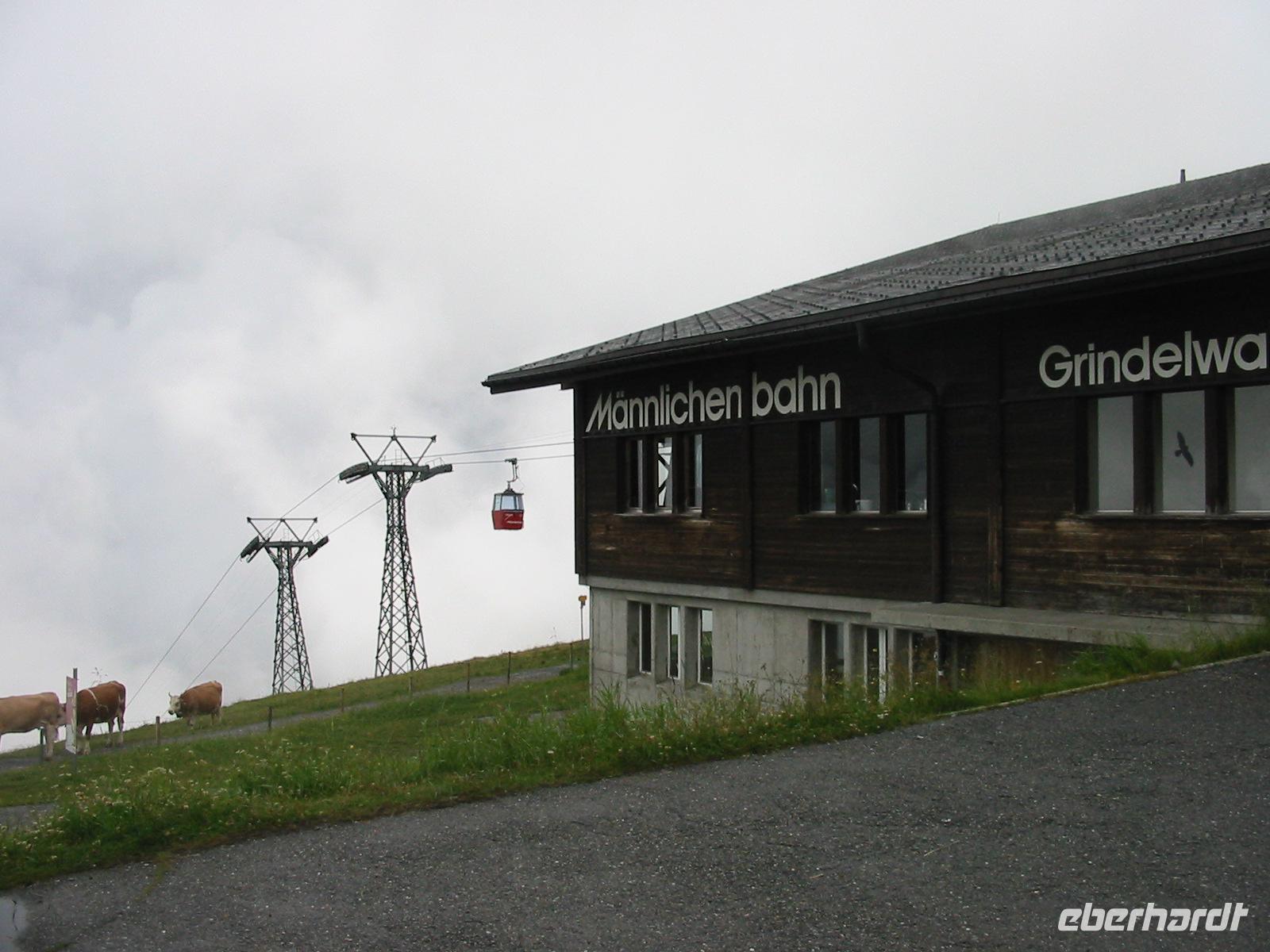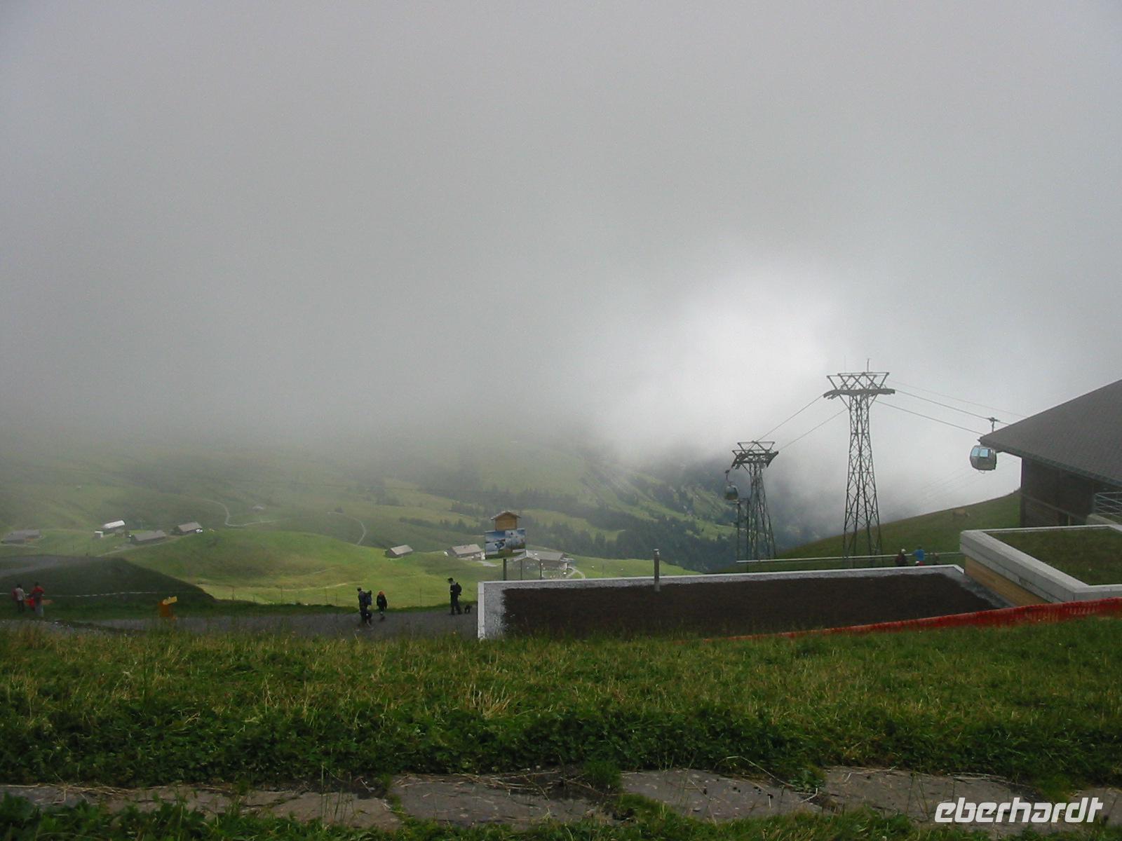 Von Grindelwald aus, kann man bequem hinauf zum First (2168 m) schweben. Mit einer Sechsergondelbahn, die über Bort und Schreckfeld zum First fährt, werden während der 25-minütigen Fahrt 5226 m Streckenlänge und 1100 Höhenmeter überwunden Oben angekommen mussten wir lange warten, bis der Nebel verzog.