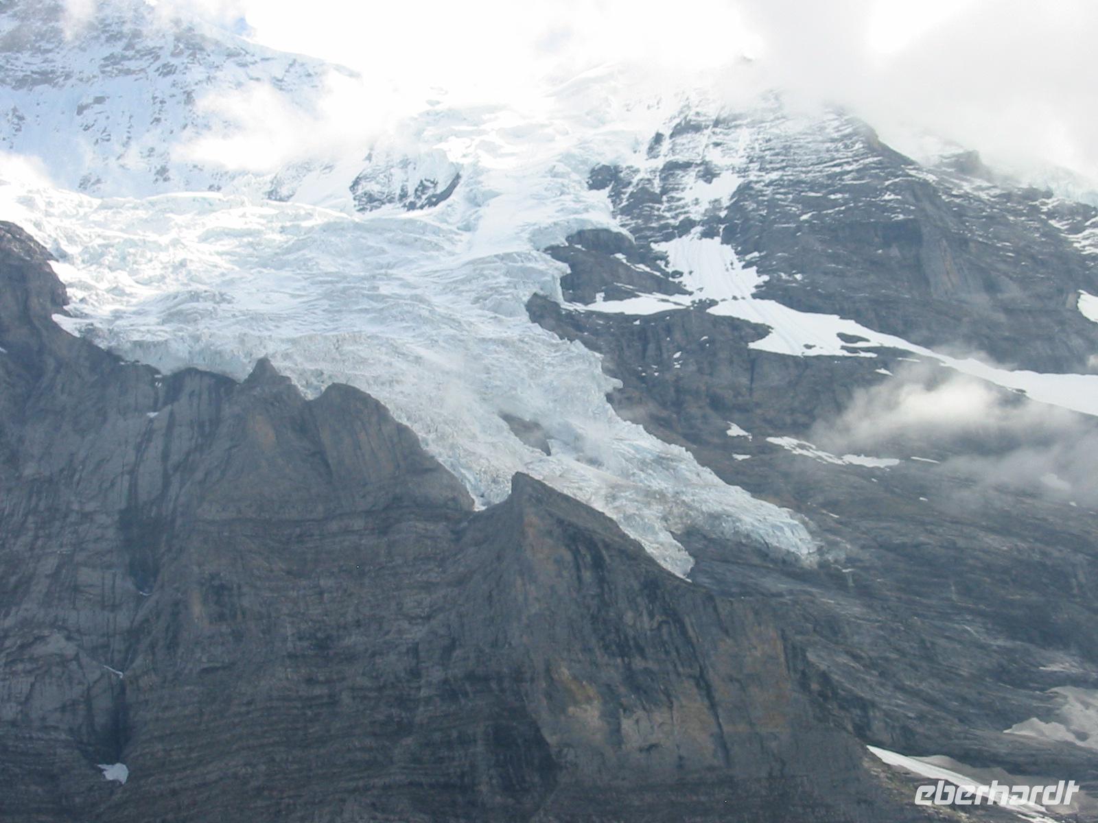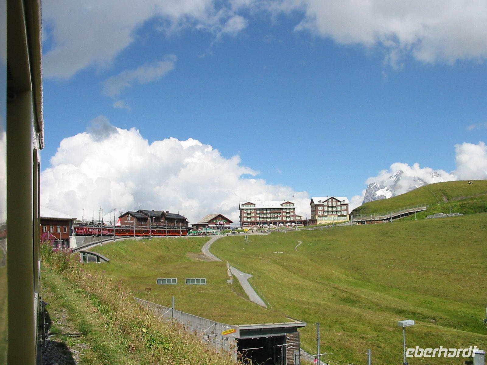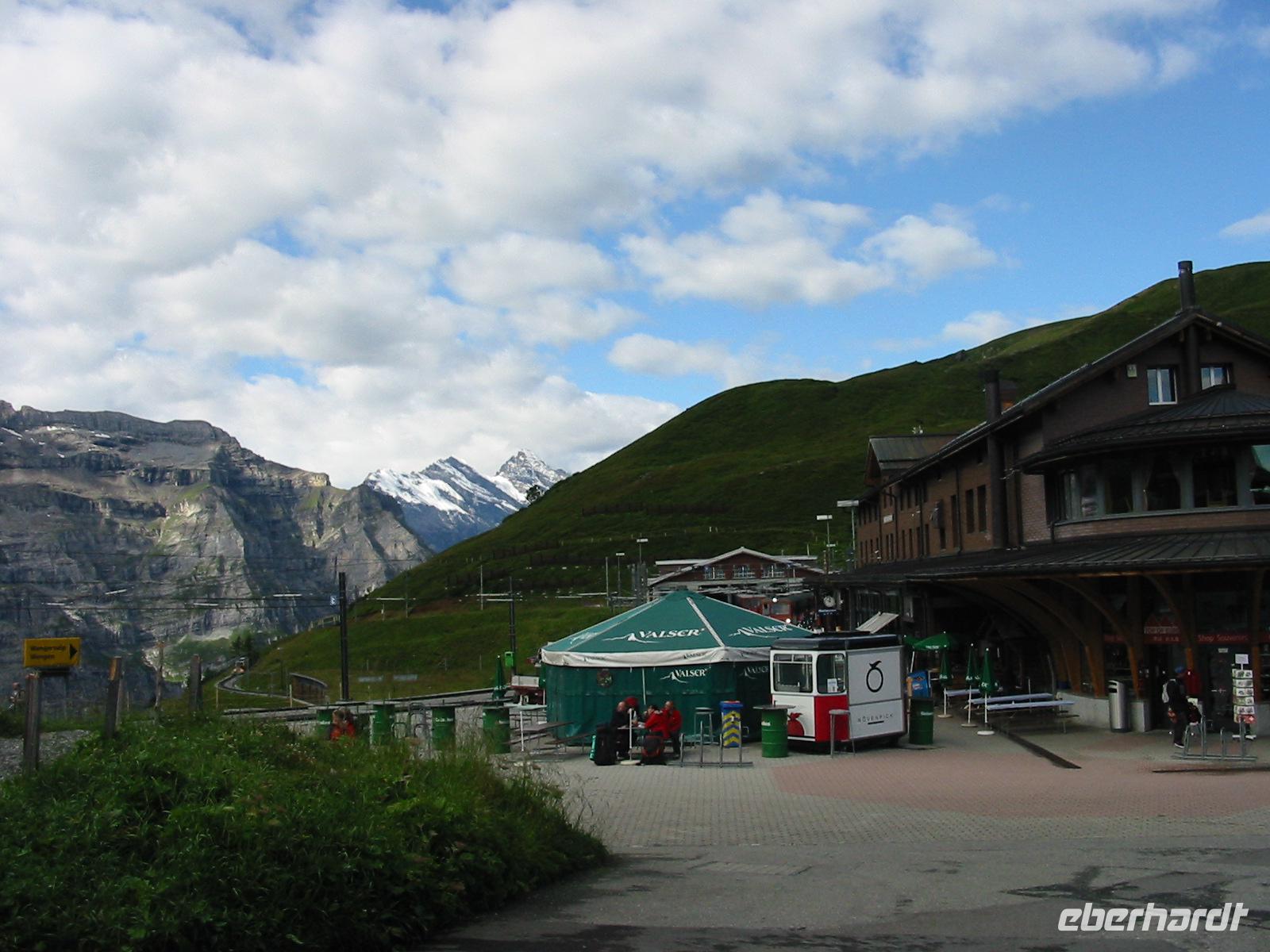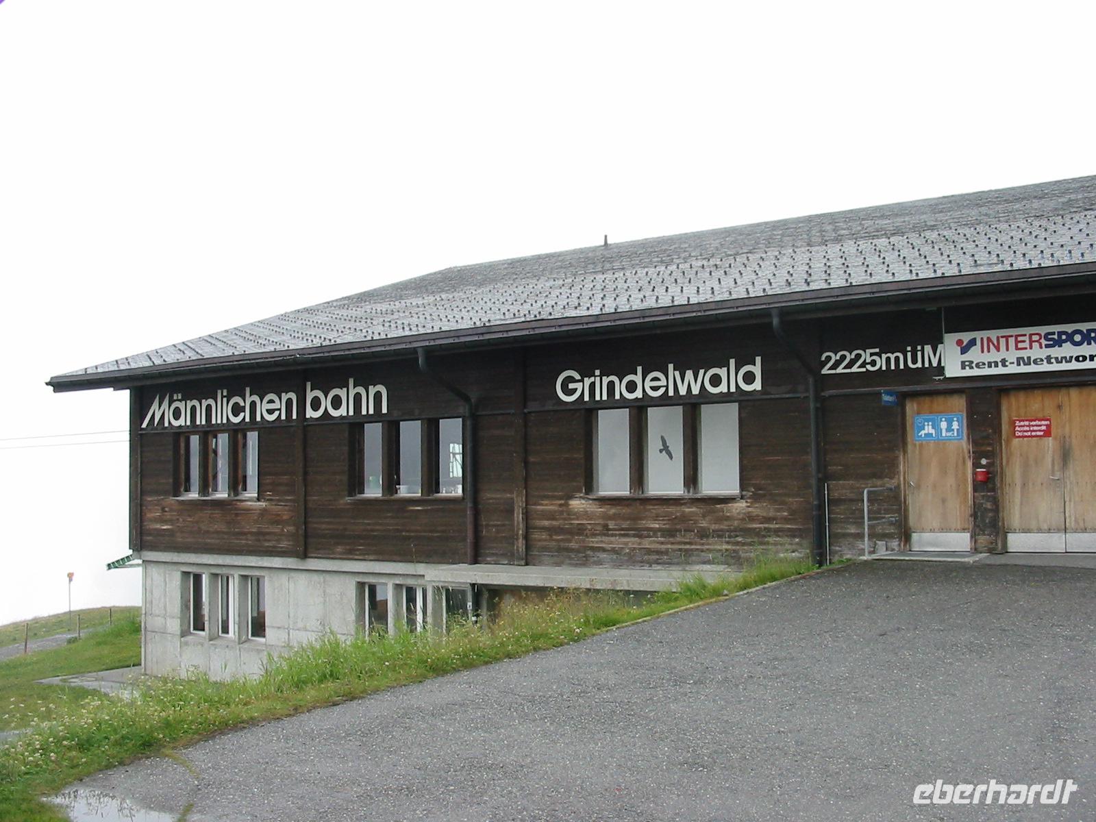 Von Grindelwald aus, kann man bequem hinauf zum First (2168 m) schweben. Mit einer Sechsergondelbahn, die über Bort und Schreckfeld zum First fährt, werden während der 25-minütigen Fahrt 5226 m Streckenlänge und 1100 Höhenmeter überwunden Oben angekommen mussten wir lange warten, bis der Nebel verzog.