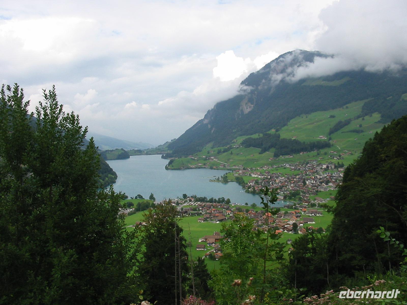 In Interlaken- West steigen wir aus und da wir bis zur Abfahrt der Harder- Kulm- Bahn noch Zeit hatten, spazierten wir an der Aare entlang , über ein Wehr , bis nach Interlaken- Ost zur Talstation der Bahn. 10 Minuten dauert die Fahrt mit der Standseilbahn. Schon während der Fahrt lag Interlaken uns zu Füßen und wurde immer kleiner, je höher wir kamen. Auch den Brienzer- und den Thuner See konnten wir von oben bewundern. Jeder traute sich auch auf den neu erbauten Zwei- Seen. Steg. Der Blick auf Eiger, Mönch und Jungfrau blieb uns leider verwehrt, Wolken und Nebel waren daran Schuld.