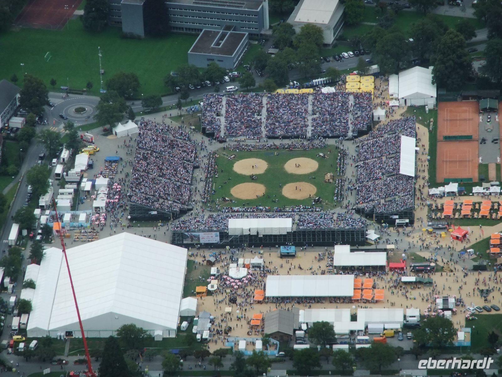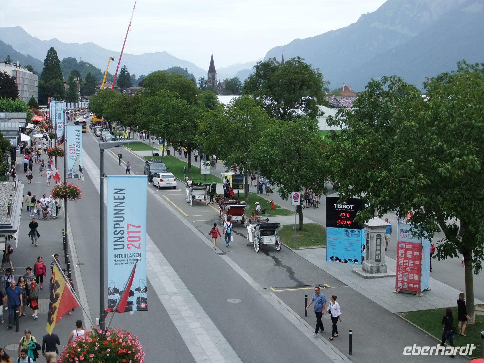 Nach dem Frühstück reisen wir mit dem Zug nach Interlaken. Hier fährt eine Standseilbahn hinauf auf den Harder Kulm. Wir trauen uns auf den Zwei-Seen-Steg, eine Plattform in 1322 Metern über dem Meer, und genießen den Blick auf Eiger, Mönch und Jungfrau sowie auf den Thuner- und den Brienzersee. Von oben sehen wir auch auf die Höhematte von Interlaken. Hier herrscht viel Trubel, denn zurzeit wird das Unspunnenfest gefeiert. Es findet nur alle 12 Jahre statt und vereint Schweizer Folklore und die beliebtesten Sportarten des Landes. Heute werden die Wettbewerbe im Schwingen ausgetragen. Wir stürzen uns ins Festgewühl und hören immer wieder, wie die Athleten lautstark bejubelt werden. Über eine große Leinwand können auch wir die Wettkämpfe verfolgen. Wesentlich ruhiger ist es im schönen Kurpark am Casino von Interlaken. Auch für einen Bummel auf dem Höheweg bleib noch Zeit, bevor der Zug uns wieder nach Wengen zurück bringt.