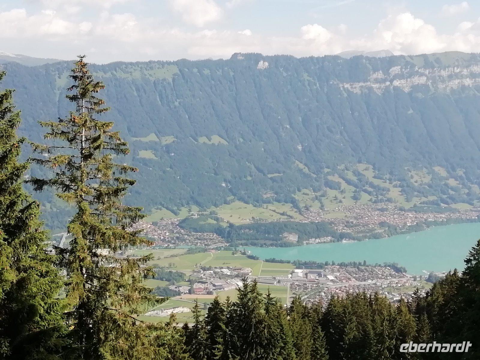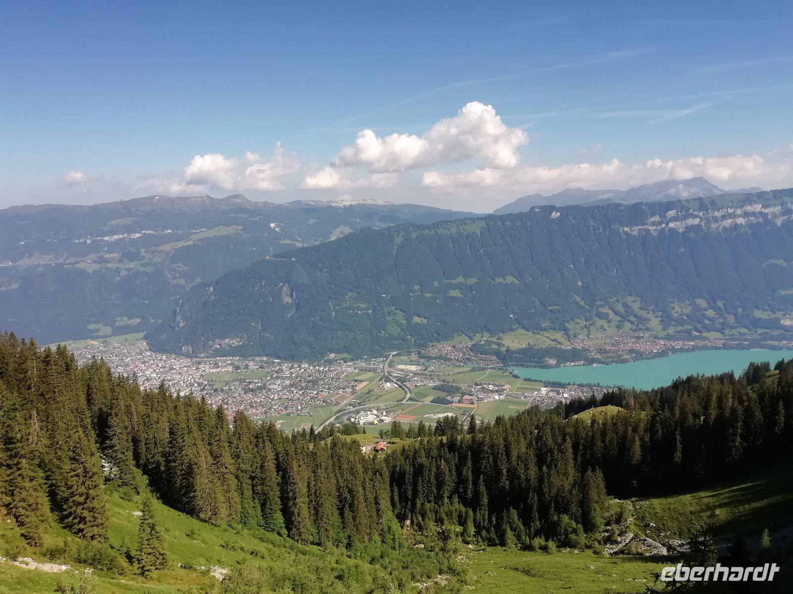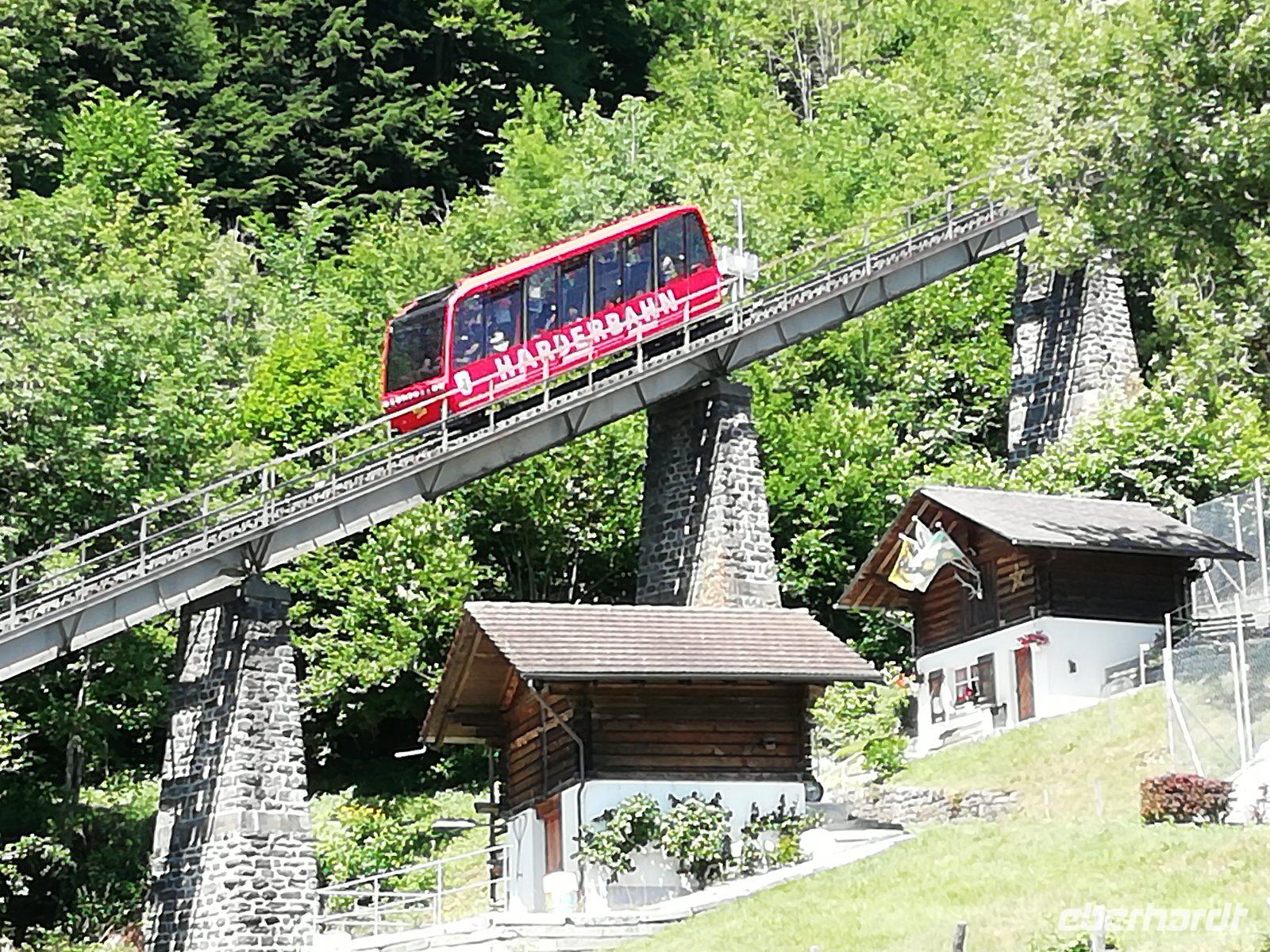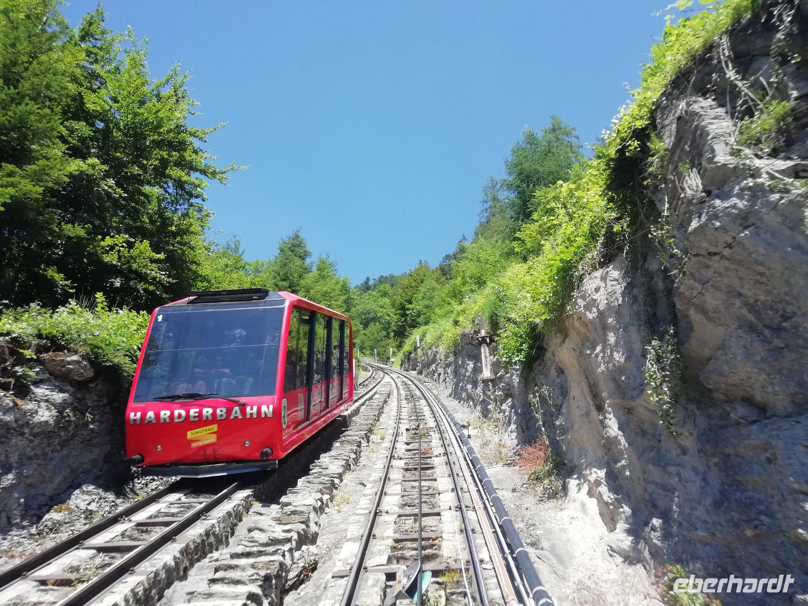 Die Wanderer unter uns treffen sich heute nach dem Frühstück erstmals mit Wanderleiterin Doris. Die Rundreisegäste fahren mit mir hinunter nach Lauterbrunnen, wo Matthias schon mit dem Bus wartet. Unser Ziel ist Interlaken. Vom Bahnhof Ost, wo wir den Bus verlassen, ist es nicht weit bis zur Talstation der Harder-Kulm-Bahn. Wir überqueren die Aare und schon sind wir da. Seit 1908 fährt hier die Standseilbahn auf den Hausberg von Interlaken. Oben trauen sich alle auf den Zwei-Seen-Steg. Es handelt sich dabei um eine Plattform in 1322 Metern über dem Meer. Uns bietet sich ein fantastischer Blick auf Eiger, Mönch und Jungfrau sowie auf den Thuner- und den Brienzersee. Einige Gäste begeben sich nun auf den Themenweg und erfahren dabei Interessantes u.a. über Geschichte, Geologie, Flora und Fauna des Berges. Andere machen eine Pause auf der Panoramaterrasse des Restaurants.