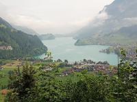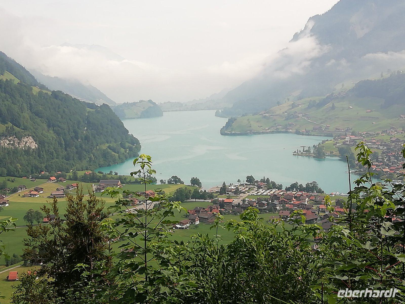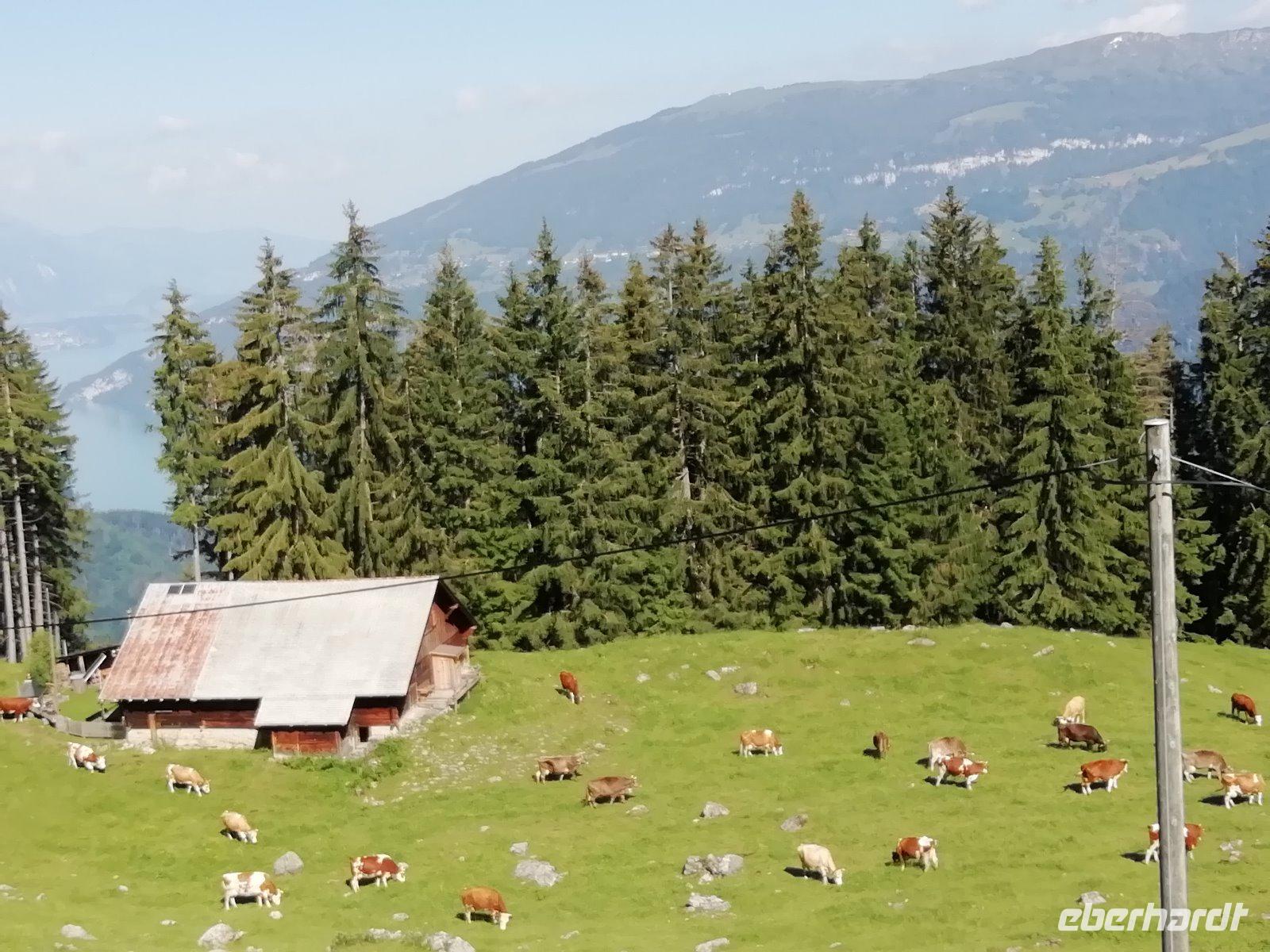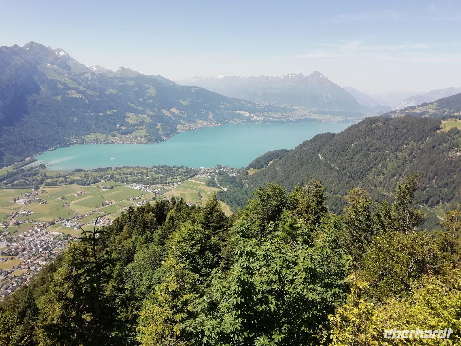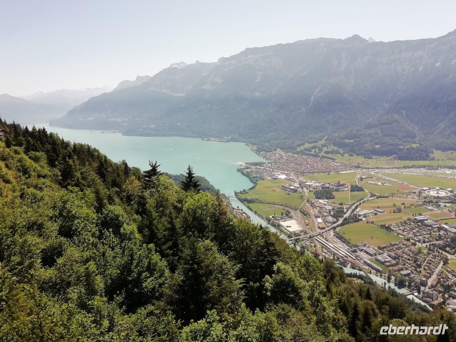 Die Wanderer unter uns treffen sich heute nach dem Frühstück erstmals mit Wanderleiterin Doris. Die Rundreisegäste fahren mit mir hinunter nach Lauterbrunnen, wo Matthias schon mit dem Bus wartet. Unser Ziel ist Interlaken. Vom Bahnhof Ost, wo wir den Bus verlassen, ist es nicht weit bis zur Talstation der Harder-Kulm-Bahn. Wir überqueren die Aare und schon sind wir da. Seit 1908 fährt hier die Standseilbahn auf den Hausberg von Interlaken. Oben trauen sich alle auf den Zwei-Seen-Steg. Es handelt sich dabei um eine Plattform in 1322 Metern über dem Meer. Uns bietet sich ein fantastischer Blick auf Eiger, Mönch und Jungfrau sowie auf den Thuner- und den Brienzersee. Einige Gäste begeben sich nun auf den Themenweg und erfahren dabei Interessantes u.a. über Geschichte, Geologie, Flora und Fauna des Berges. Andere machen eine Pause auf der Panoramaterrasse des Restaurants.