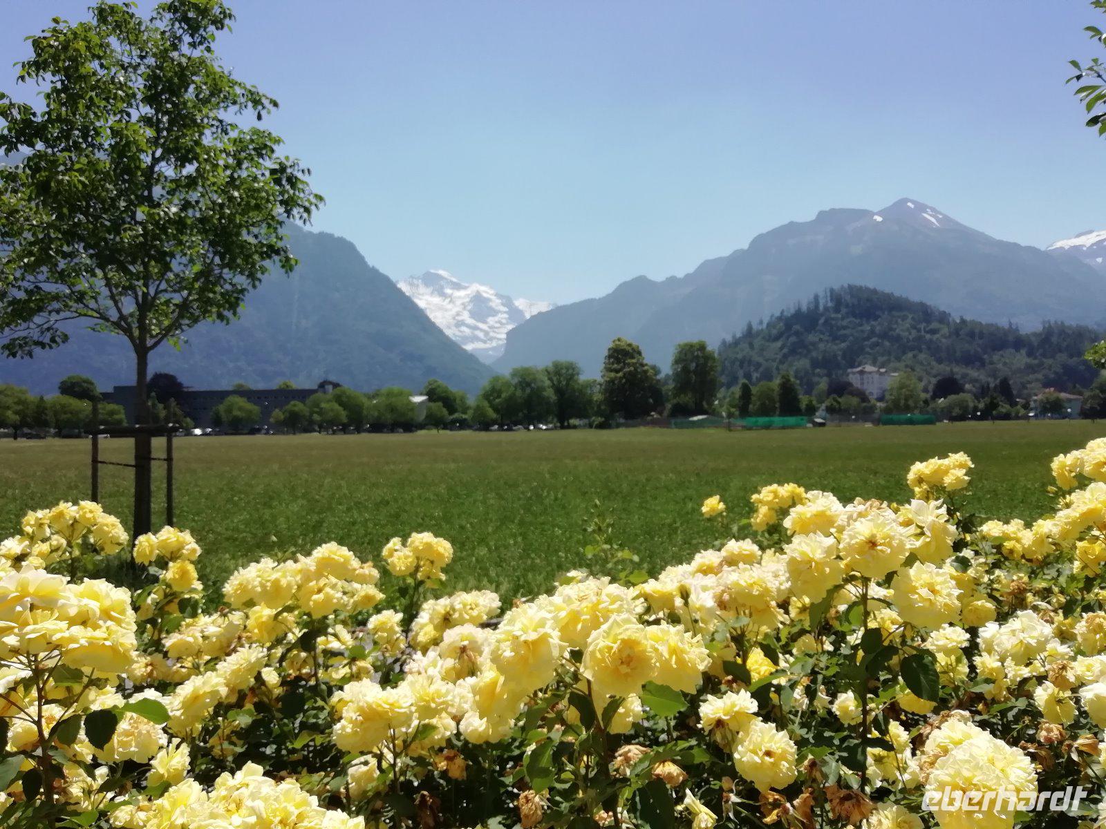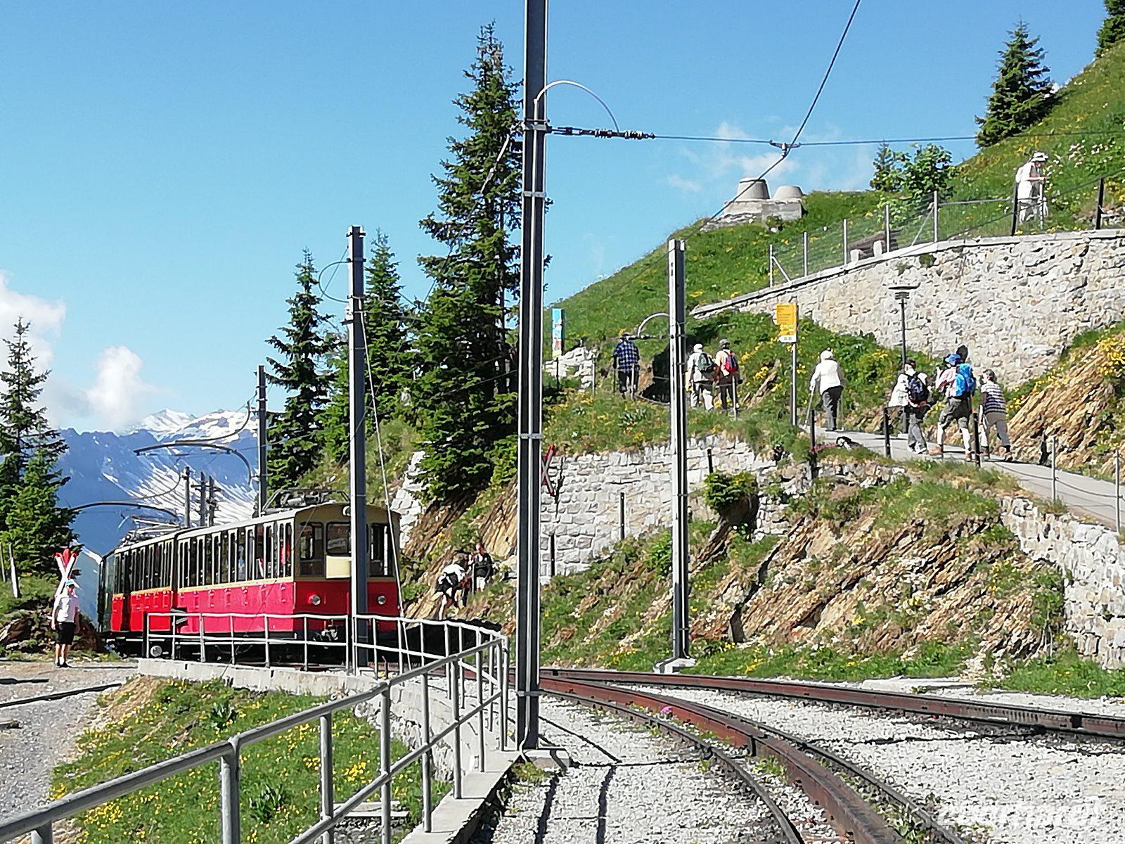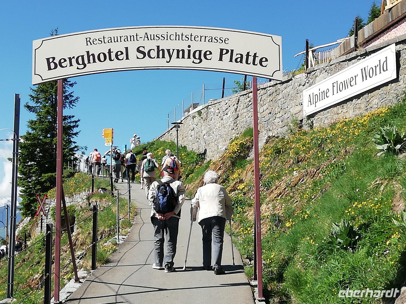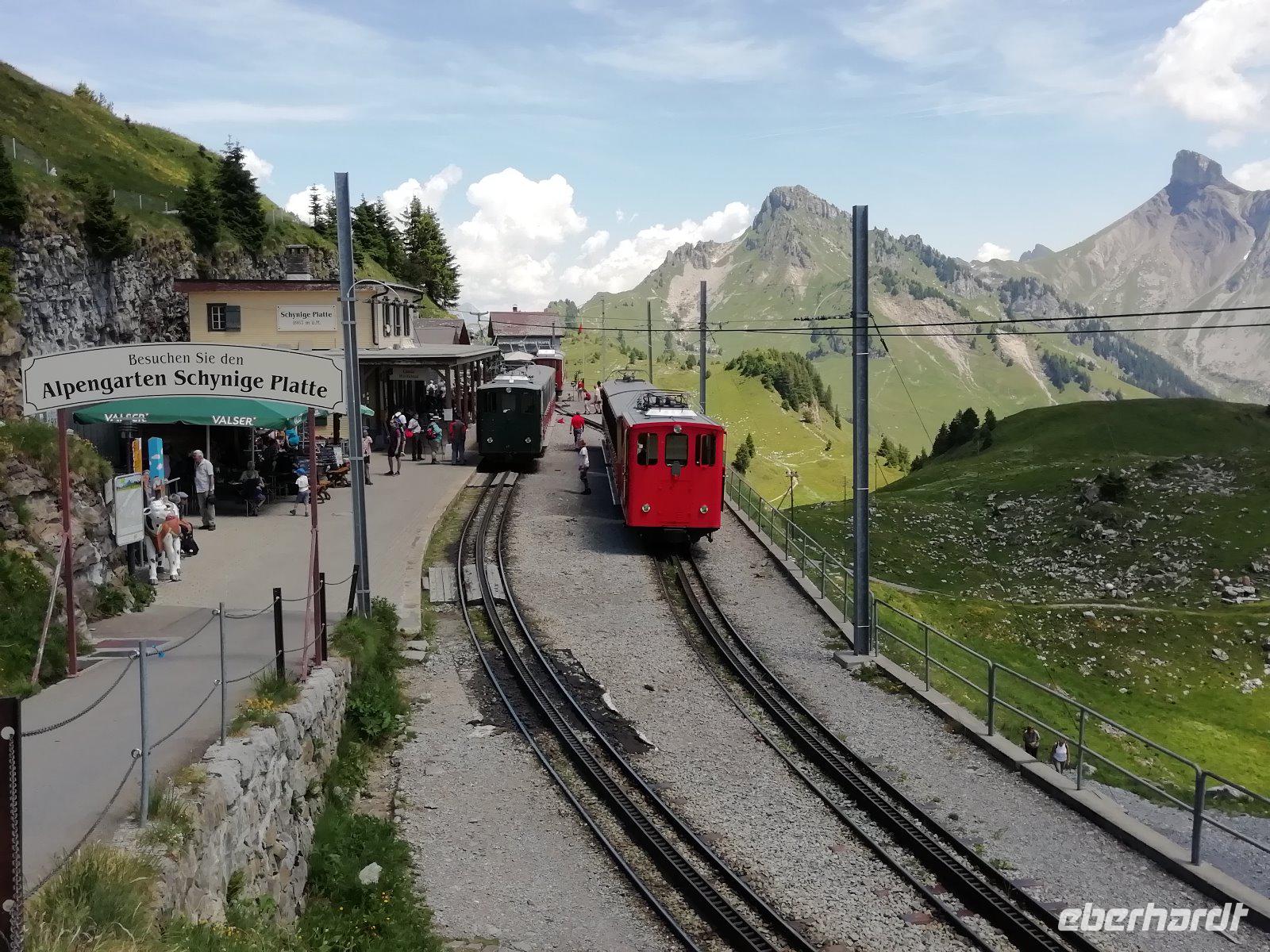 Der Wetterbericht verspricht für heute 15 Stunden Sonnenschein. Umso mehr freuen wir uns auf unseren Ausflug zur Schynige Platte. In Wilderswil befindet sich der Bahnhof der nostalgischen Bergbahn, die uns hinauf zur Schynige Platte bringt. Dabei überwinden wir im historischen offen Wagen auf der 7,26 km langen Strecke mit 12 km/h einen Höhenunterschied von 1383 m. Möglich wird das durch eine durchschnittliche Neigung von 19 Prozent (größte Neigung sogar 25 Prozent) und 67 Kurven. Schon die Auffahrt ist ein Erlebnis, und die Aussicht oben sowieso. Es gibt Rundwege für jeden Geschmack. Erst gestern wurde der „Swiss Flower & Panorama Trail" eröffnet. Einige versuchen sich hier am „Kuhglockenspiel". Andere gehen zum Aussichtpunkt Daube oder zum Oberberghorn. Und natürlich darf ein Besuch im Alpengarten nicht fehlen. Fast 700 Alpenpflanzen kann man hier entdecken. Pflanze des Tages ist heute der Enzian. Während unseres Aufenthaltes auf dem Berg sind immer wieder Alphornklänge zu hören. Auf der Sonnenterrasse des Berghotels entdecken wir dann die beiden Alphornbläser. Wer will, kann auch gern selbst versuchen, dem Instrument einen Ton zu entlocken. Gar nicht so einfach. Dann geht es in 50minütiger Fahrt wieder nach unten.