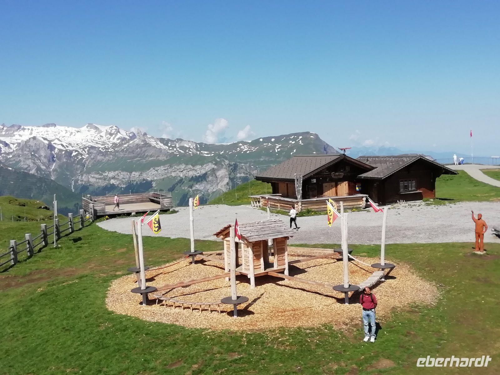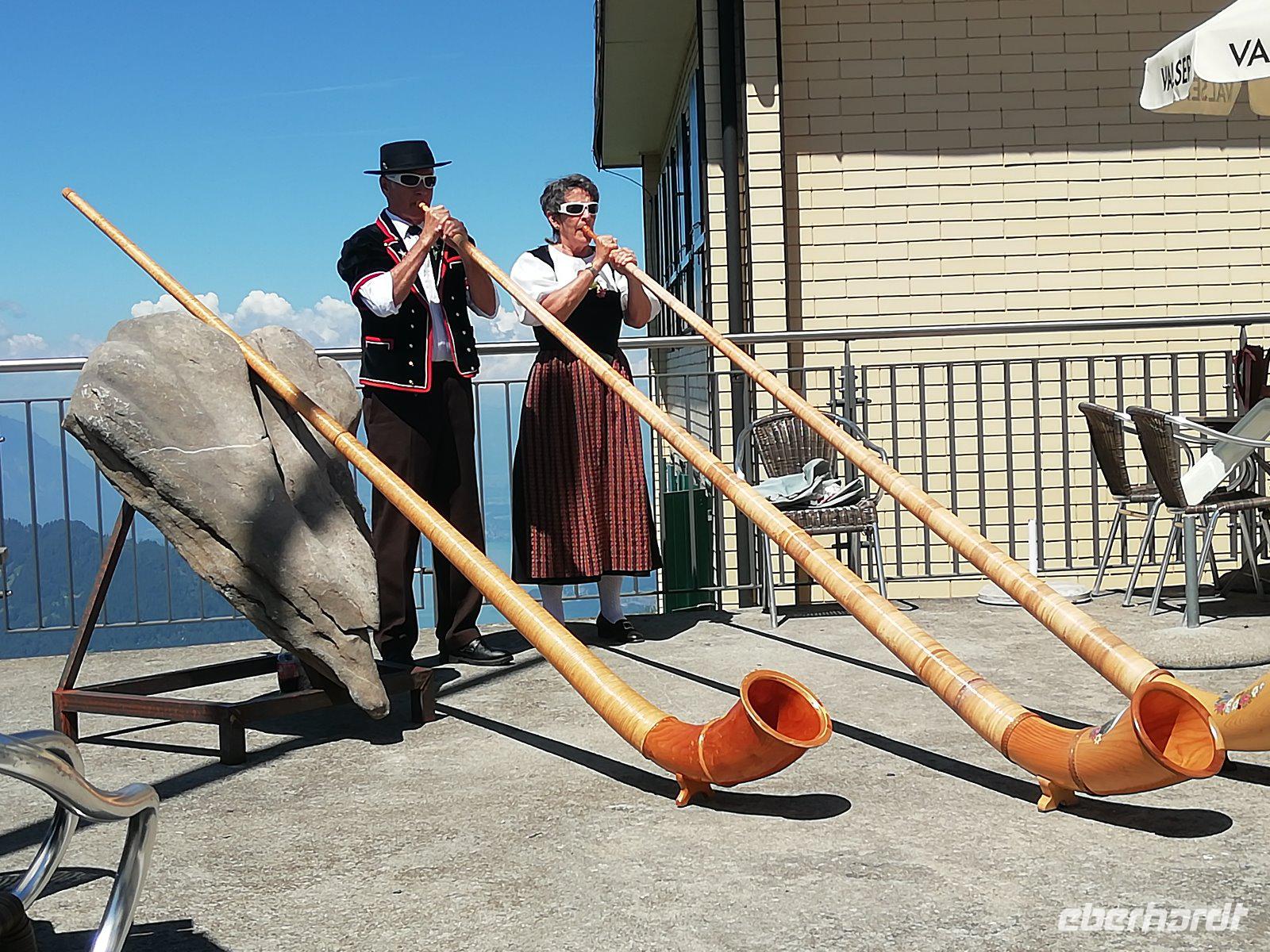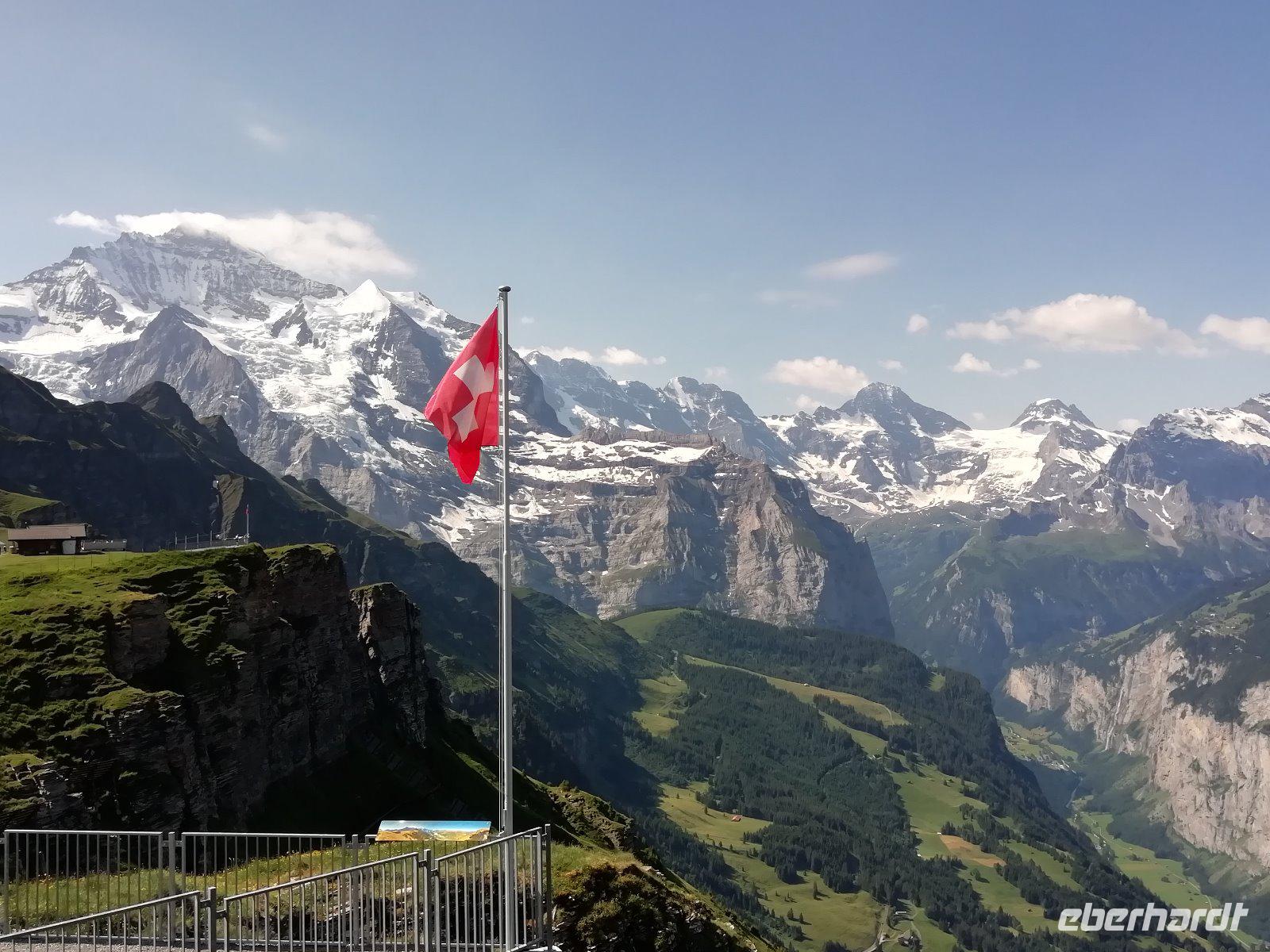 Der Wetterbericht verspricht für heute 15 Stunden Sonnenschein. Umso mehr freuen wir uns auf unseren Ausflug zur Schynige Platte. In Wilderswil befindet sich der Bahnhof der nostalgischen Bergbahn, die uns hinauf zur Schynige Platte bringt. Dabei überwinden wir im historischen offen Wagen auf der 7,26 km langen Strecke mit 12 km/h einen Höhenunterschied von 1383 m. Möglich wird das durch eine durchschnittliche Neigung von 19 Prozent (größte Neigung sogar 25 Prozent) und 67 Kurven. Schon die Auffahrt ist ein Erlebnis, und die Aussicht oben sowieso. Es gibt Rundwege für jeden Geschmack. Erst gestern wurde der „Swiss Flower & Panorama Trail" eröffnet. Einige versuchen sich hier am „Kuhglockenspiel". Andere gehen zum Aussichtpunkt Daube oder zum Oberberghorn. Und natürlich darf ein Besuch im Alpengarten nicht fehlen. Fast 700 Alpenpflanzen kann man hier entdecken. Pflanze des Tages ist heute der Enzian. Während unseres Aufenthaltes auf dem Berg sind immer wieder Alphornklänge zu hören. Auf der Sonnenterrasse des Berghotels entdecken wir dann die beiden Alphornbläser. Wer will, kann auch gern selbst versuchen, dem Instrument einen Ton zu entlocken. Gar nicht so einfach. Dann geht es in 50minütiger Fahrt wieder nach unten.