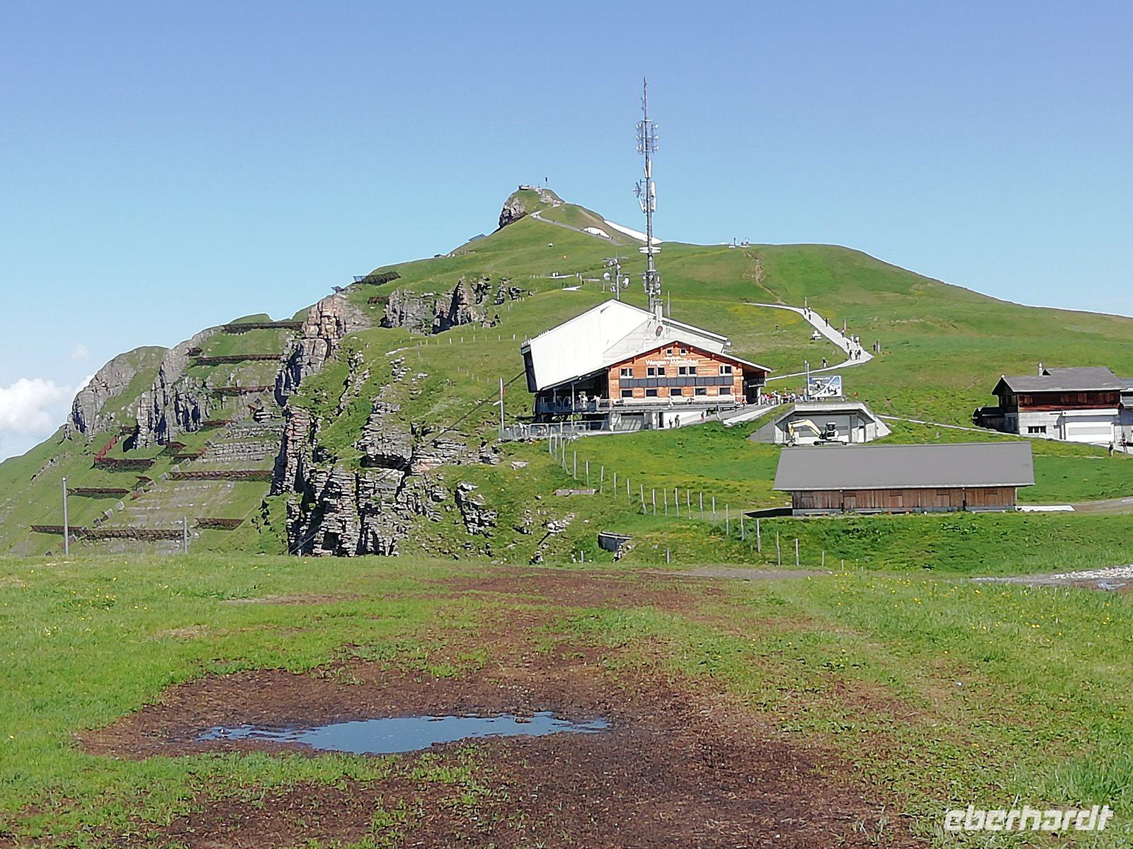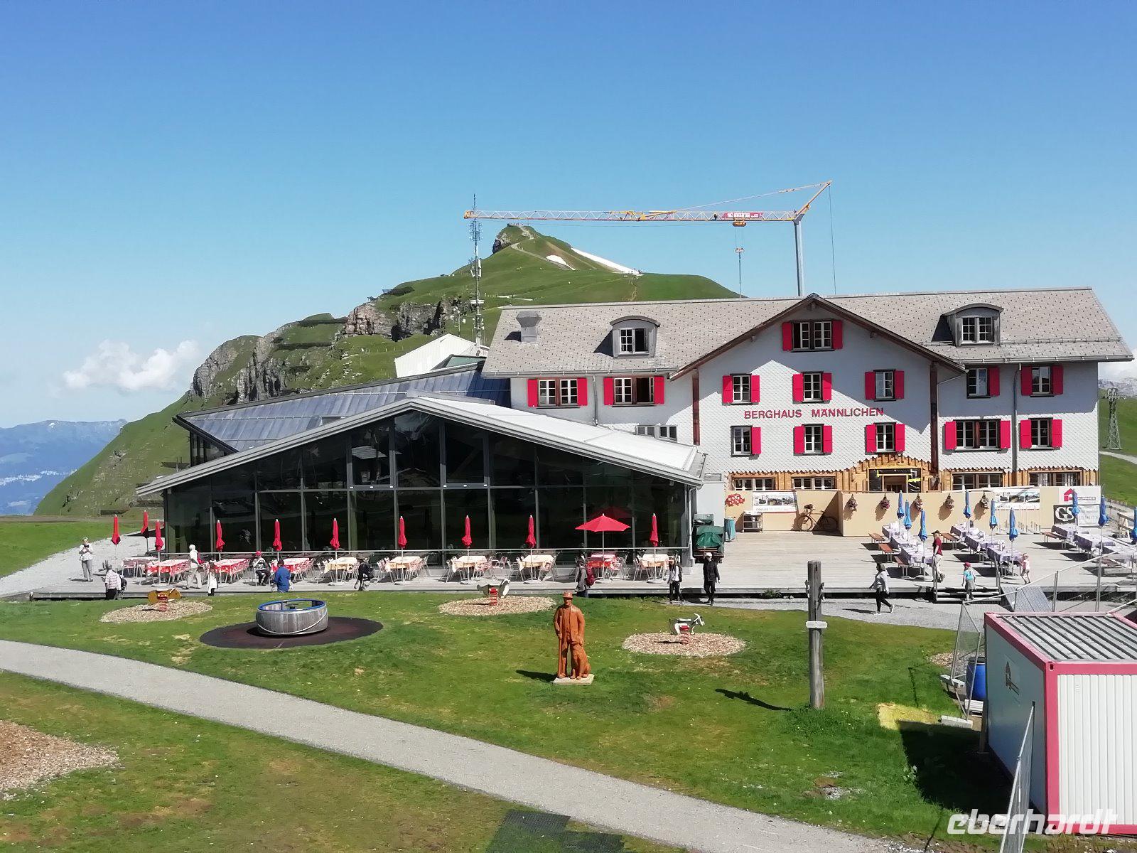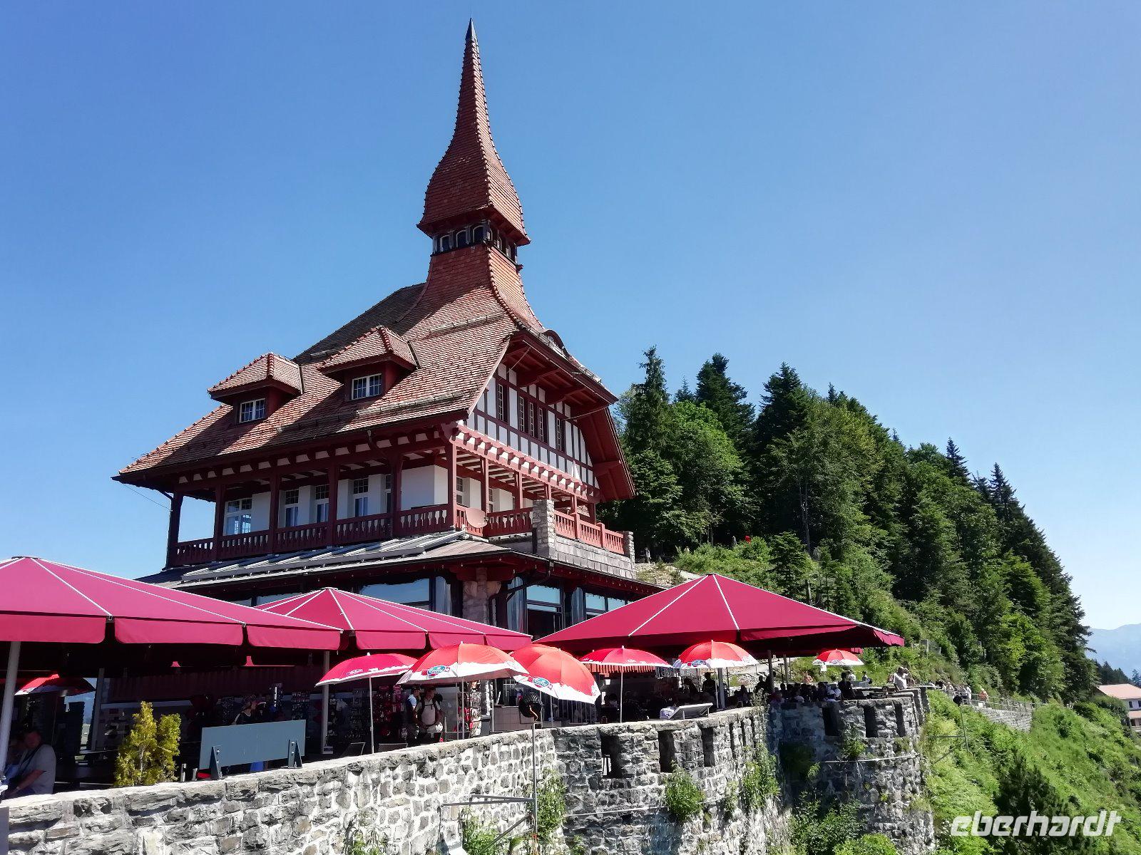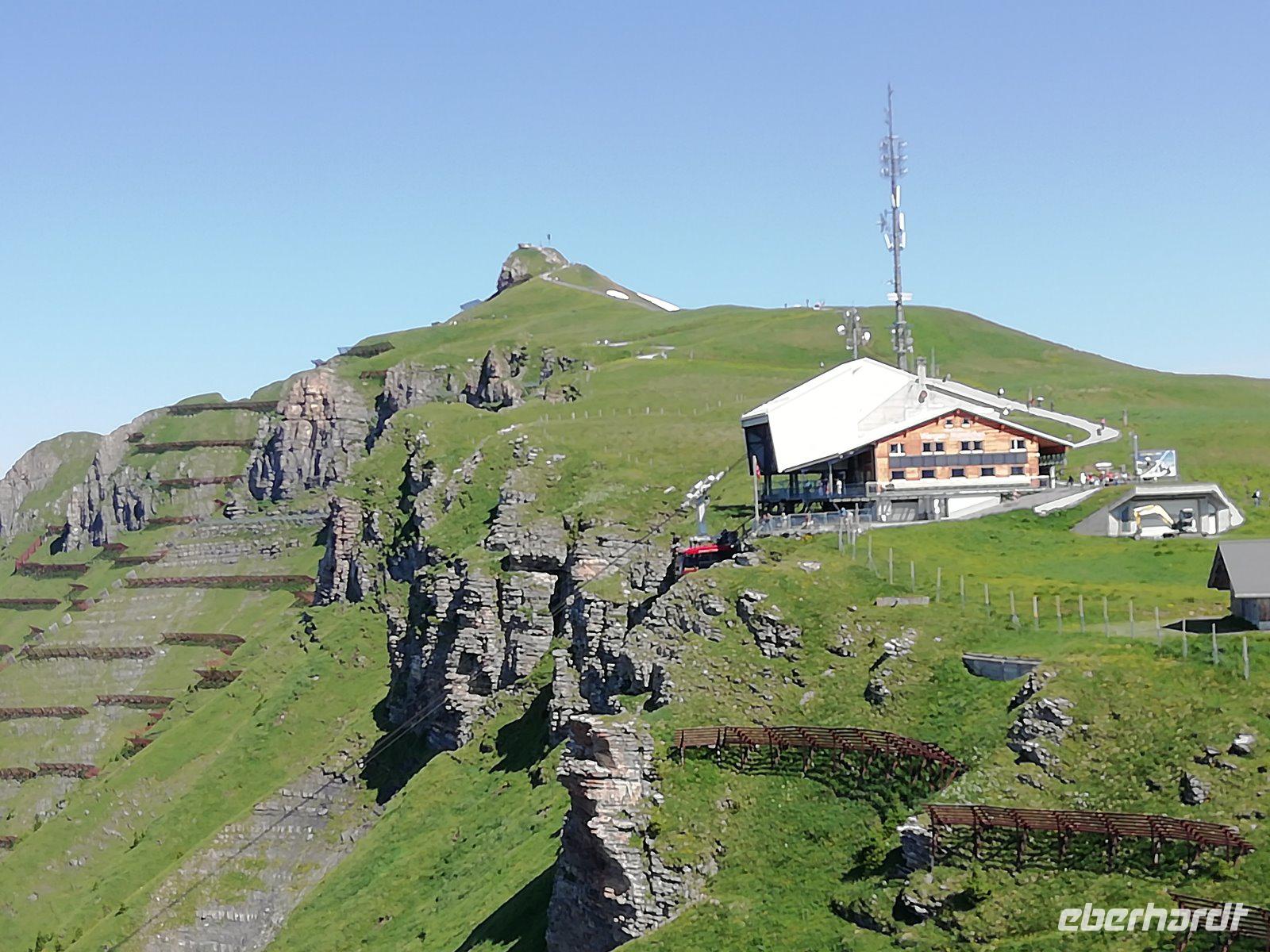 Der Wetterbericht verspricht für heute 15 Stunden Sonnenschein. Umso mehr freuen wir uns auf unseren Ausflug zur Schynige Platte. In Wilderswil befindet sich der Bahnhof der nostalgischen Bergbahn, die uns hinauf zur Schynige Platte bringt. Dabei überwinden wir im historischen offen Wagen auf der 7,26 km langen Strecke mit 12 km/h einen Höhenunterschied von 1383 m. Möglich wird das durch eine durchschnittliche Neigung von 19 Prozent (größte Neigung sogar 25 Prozent) und 67 Kurven. Schon die Auffahrt ist ein Erlebnis, und die Aussicht oben sowieso. Es gibt Rundwege für jeden Geschmack. Erst gestern wurde der „Swiss Flower & Panorama Trail" eröffnet. Einige versuchen sich hier am „Kuhglockenspiel". Andere gehen zum Aussichtpunkt Daube oder zum Oberberghorn. Und natürlich darf ein Besuch im Alpengarten nicht fehlen. Fast 700 Alpenpflanzen kann man hier entdecken. Pflanze des Tages ist heute der Enzian. Während unseres Aufenthaltes auf dem Berg sind immer wieder Alphornklänge zu hören. Auf der Sonnenterrasse des Berghotels entdecken wir dann die beiden Alphornbläser. Wer will, kann auch gern selbst versuchen, dem Instrument einen Ton zu entlocken. Gar nicht so einfach. Dann geht es in 50minütiger Fahrt wieder nach unten.