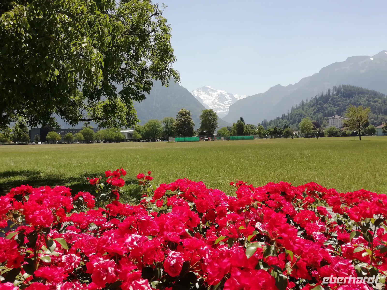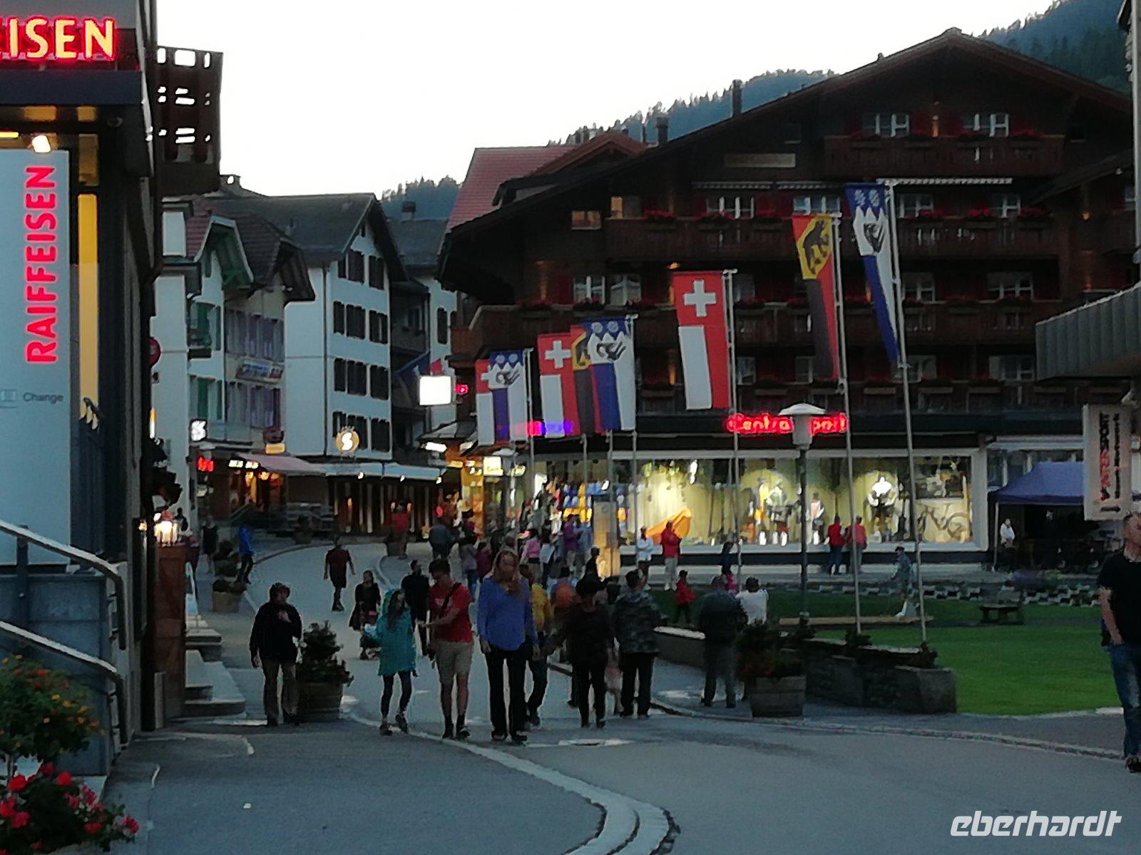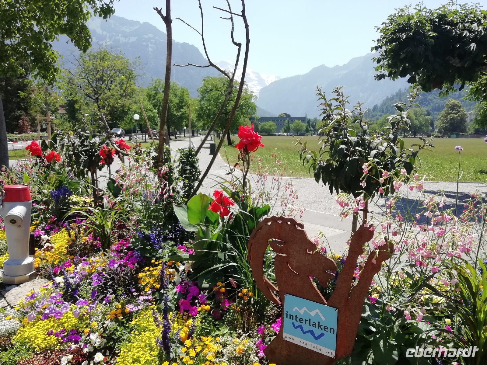 Wieder unten in Interlaken, kann man den Alpenwildparkbesuchen, doch bei der Hitze haben sich die Murmeltiere, Gämsen und Steinböcke im Schatten versteckt. Das Thermometer zeigt nämlich inzwischen 34 Grad an. So suchen auch wir bei unserem Bummel durch den Ort immer wieder ein schattiges Plätzchen. Trotzdem schauen wir uns noch den Kurpark an. Zwischen Casino, Blumenuhr und Parkgelände haben heute die Händler einen Flohmarkt aufgebaut. Es bleibt auch noch Zeit für einen Spaziergang entlang der zahlreichen Geschäfte und für eine Pause an der Höhematte, wo gerade zahlreiche Gleitschirmflieger landen. Im gut klimatisierten Bus geht es dann wieder zurück nach Lauterbrunnen und mit dem Zug hinauf nach Wengen.