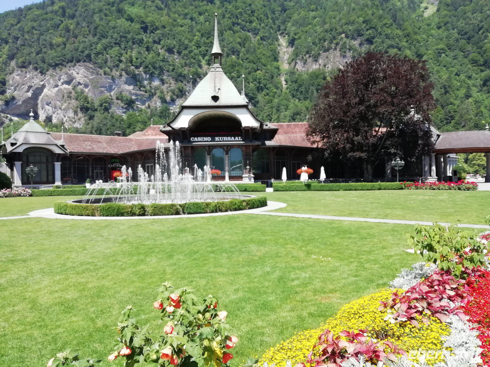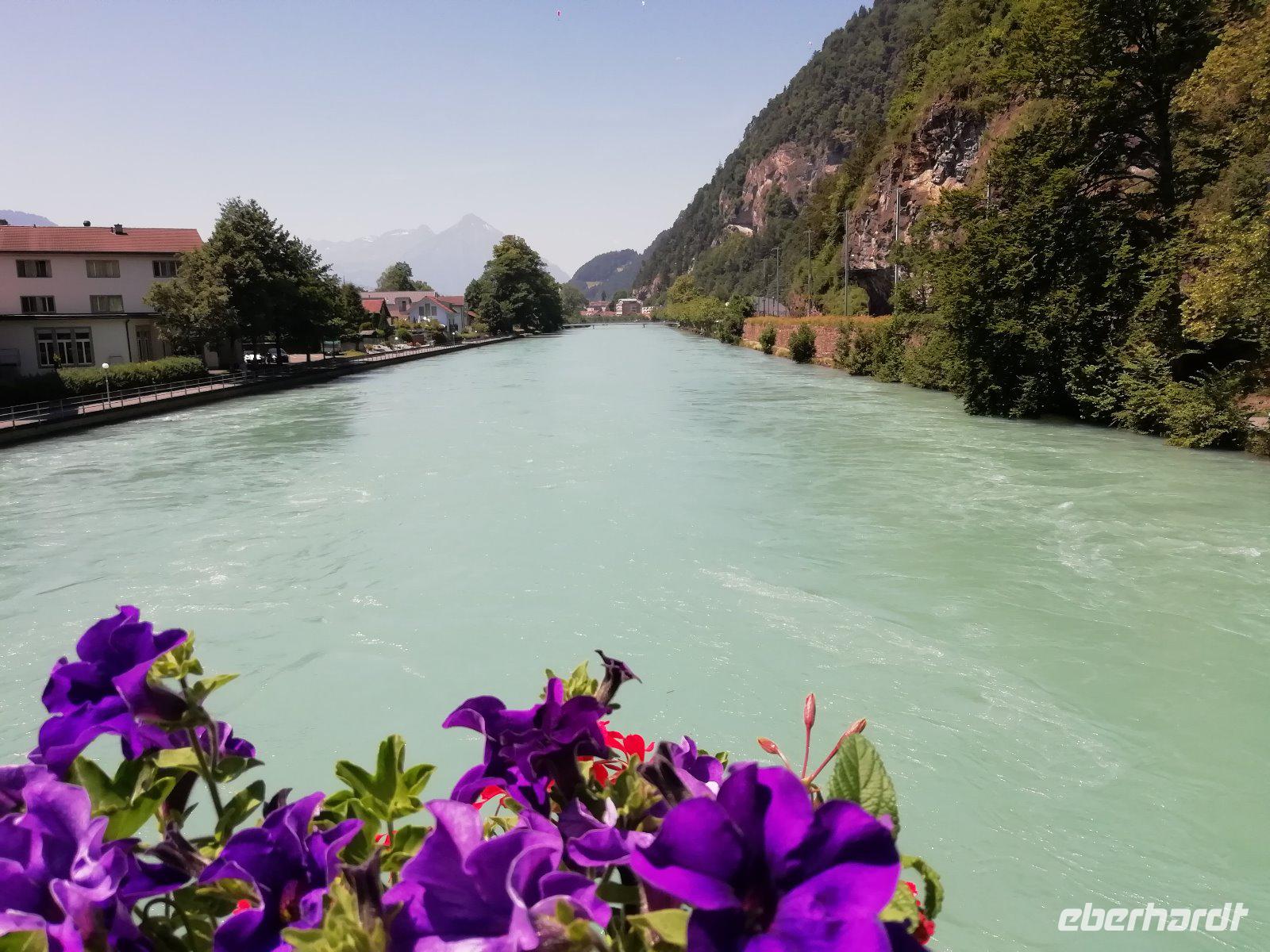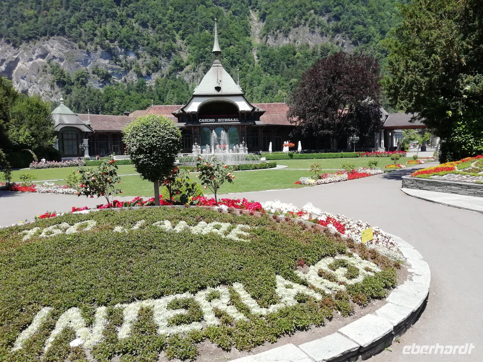 Wieder unten in Interlaken, kann man den Alpenwildparkbesuchen, doch bei der Hitze haben sich die Murmeltiere, Gämsen und Steinböcke im Schatten versteckt. Das Thermometer zeigt nämlich inzwischen 34 Grad an. So suchen auch wir bei unserem Bummel durch den Ort immer wieder ein schattiges Plätzchen. Trotzdem schauen wir uns noch den Kurpark an. Zwischen Casino, Blumenuhr und Parkgelände haben heute die Händler einen Flohmarkt aufgebaut. Es bleibt auch noch Zeit für einen Spaziergang entlang der zahlreichen Geschäfte und für eine Pause an der Höhematte, wo gerade zahlreiche Gleitschirmflieger landen. Im gut klimatisierten Bus geht es dann wieder zurück nach Lauterbrunnen und mit dem Zug hinauf nach Wengen.
