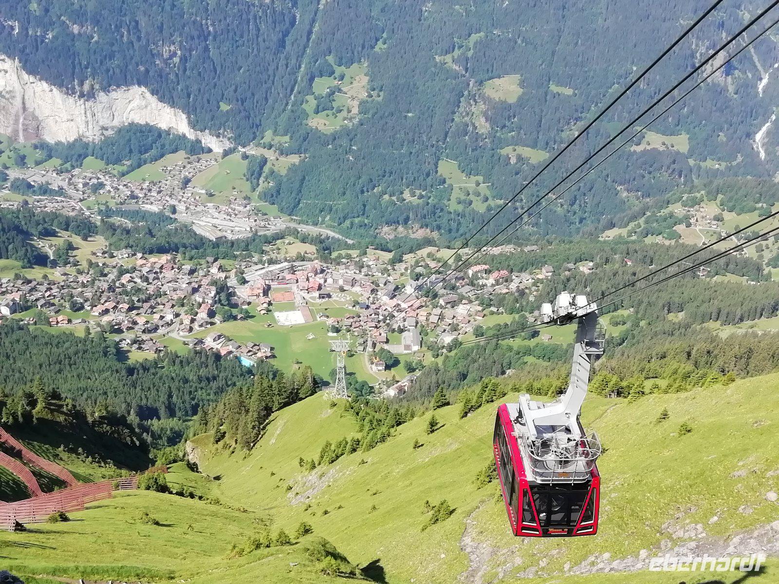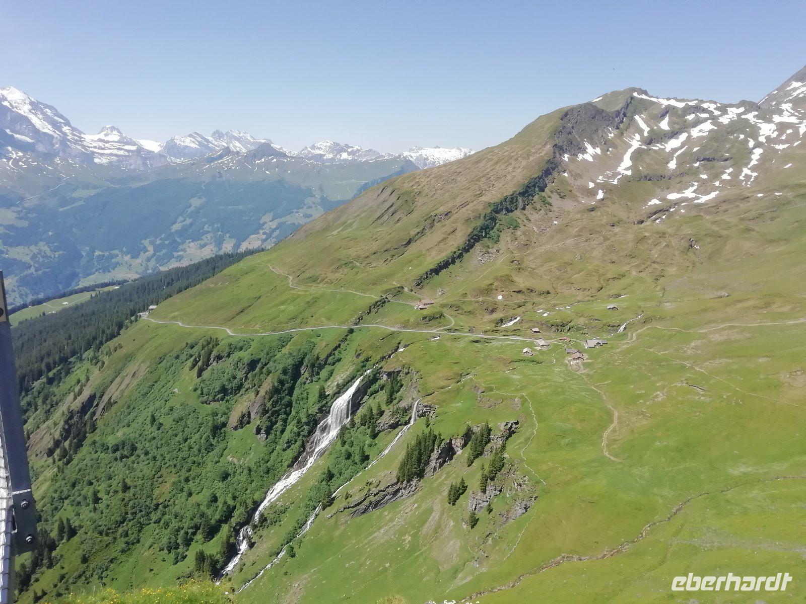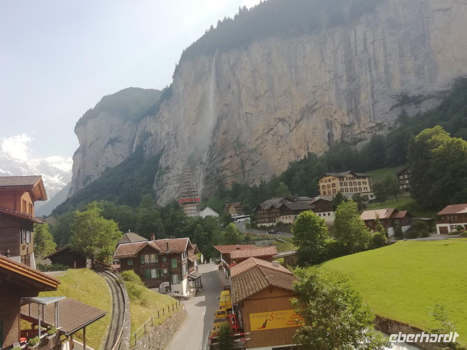 Zwar kann man mit dem First Flieger, dem First Gleiter, dem Trottibike oder einem Mountain Car einen Teil der Abfahrt vom First absolvieren, wir entscheiden uns aber alle wieder für die Seilbahn. Unten in Grindelwald empfängt uns wieder die hochsommerliche Hitze. Nach einem Spaziergang durch das Gletscherdorf zum Bahnhof geht es mit dem Bus zurück. In Lauterbrunnen nutzen einige noch die Zeit für einen Abstecher zum Staubbachwasserfall.