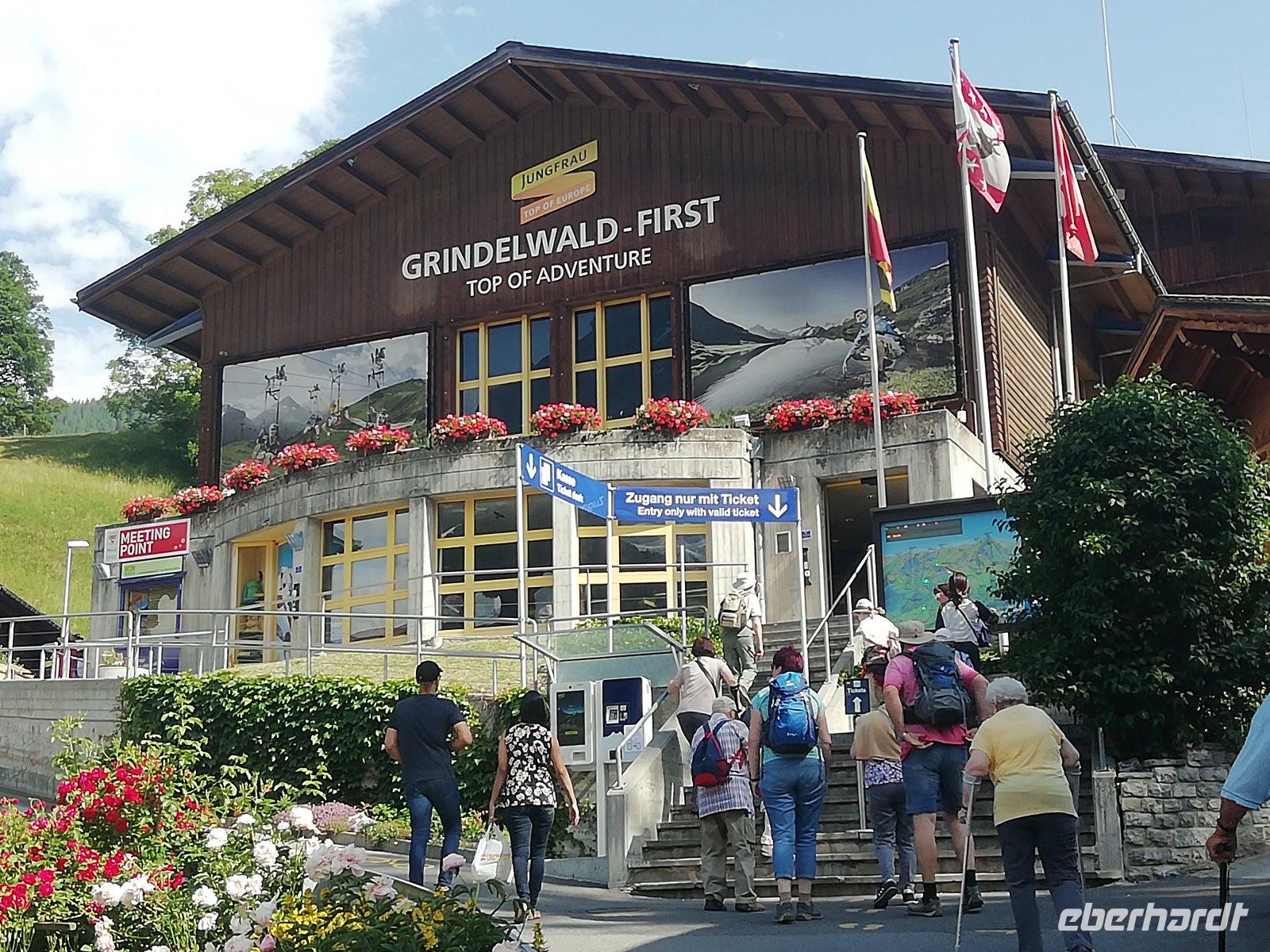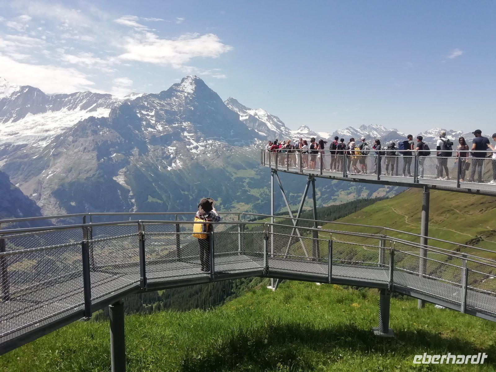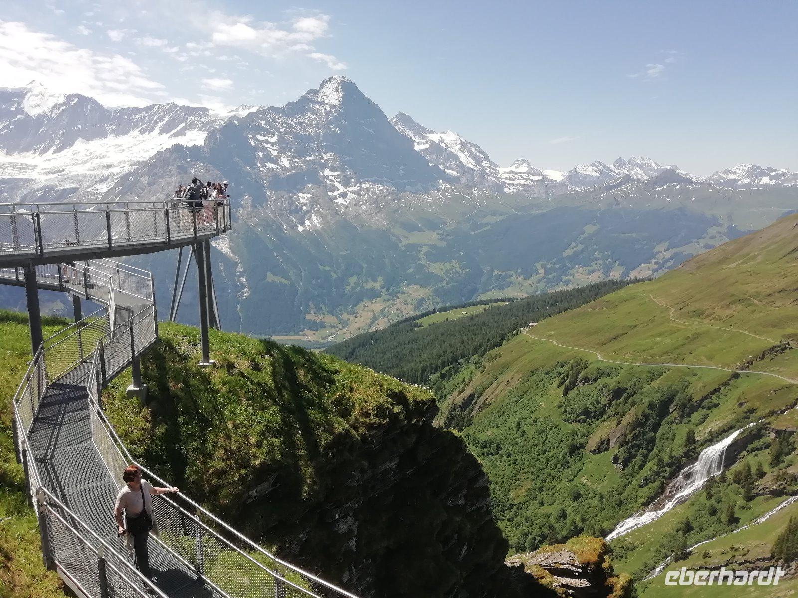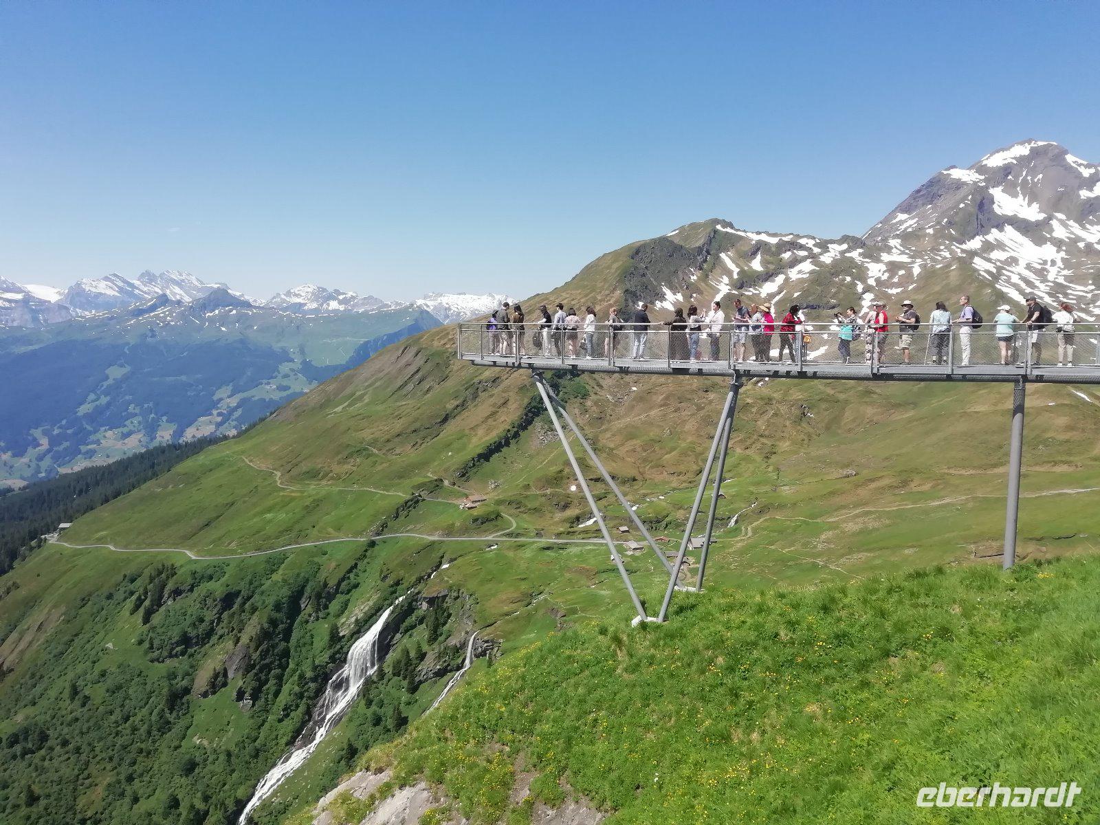 Heute führt uns unser Ausflug vom Tal der Weißen Lütschine ins Tal der Schwarzen Lütschine. Unser Ziel ist Grindelwald. Hier wollen wir mit der Seilbahn auf den First fahren. Doch kurz bevor wir an der Reihe sind, steht die Bahn still. Technischer Defekt - so informiert uns das Personal. In 15 Minuten soll es aber wieder weitergehen. Letztendlich benötigt man für die Reparatur eine Dreiviertelstunde. Doch dann beginnt die wunderschöne Auffahrt. Auf der Sonnenseite des Grindelwaldtales bringt die First-Bahn uns in 25 Minuten hinauf auf 2168 Meter. Direkt an der Bergstation beginnt der spektakuläre Gipfelrundweg „First Cliff Walk" in schwindelerregender Höhe entlang der steilabfallenden Felswände. Immer wieder hat man tolle Aussichten auf die Eigernordwand, zahlreiche andere Gipfel der Berner Alpen, den Wasserfall und die Alpweiden. Einige Gäste wandern noch zum Bachalpsee, der auch gern als „blaues Juwel" bezeichnet wird. Dann lädt der Berggasthof First zum Verweilen ein.