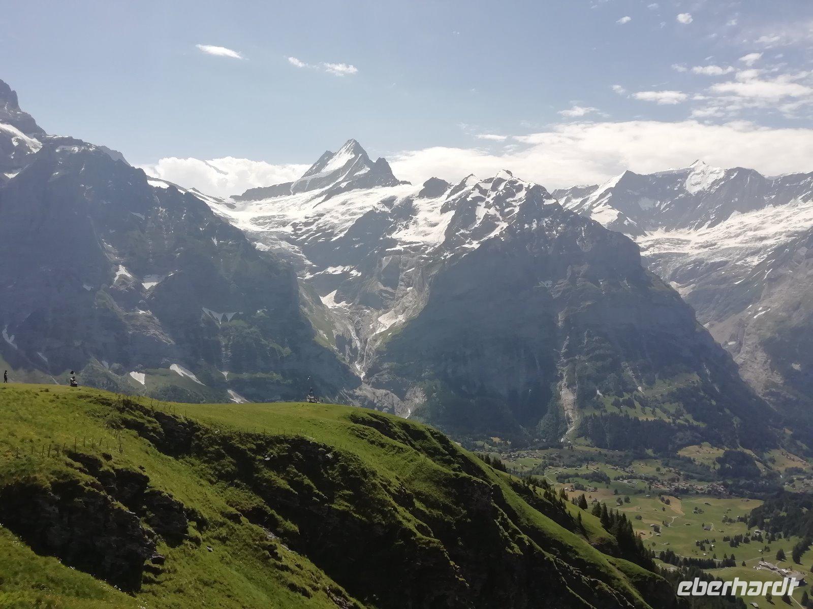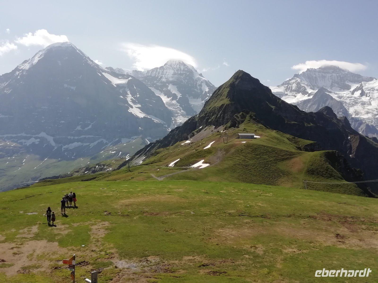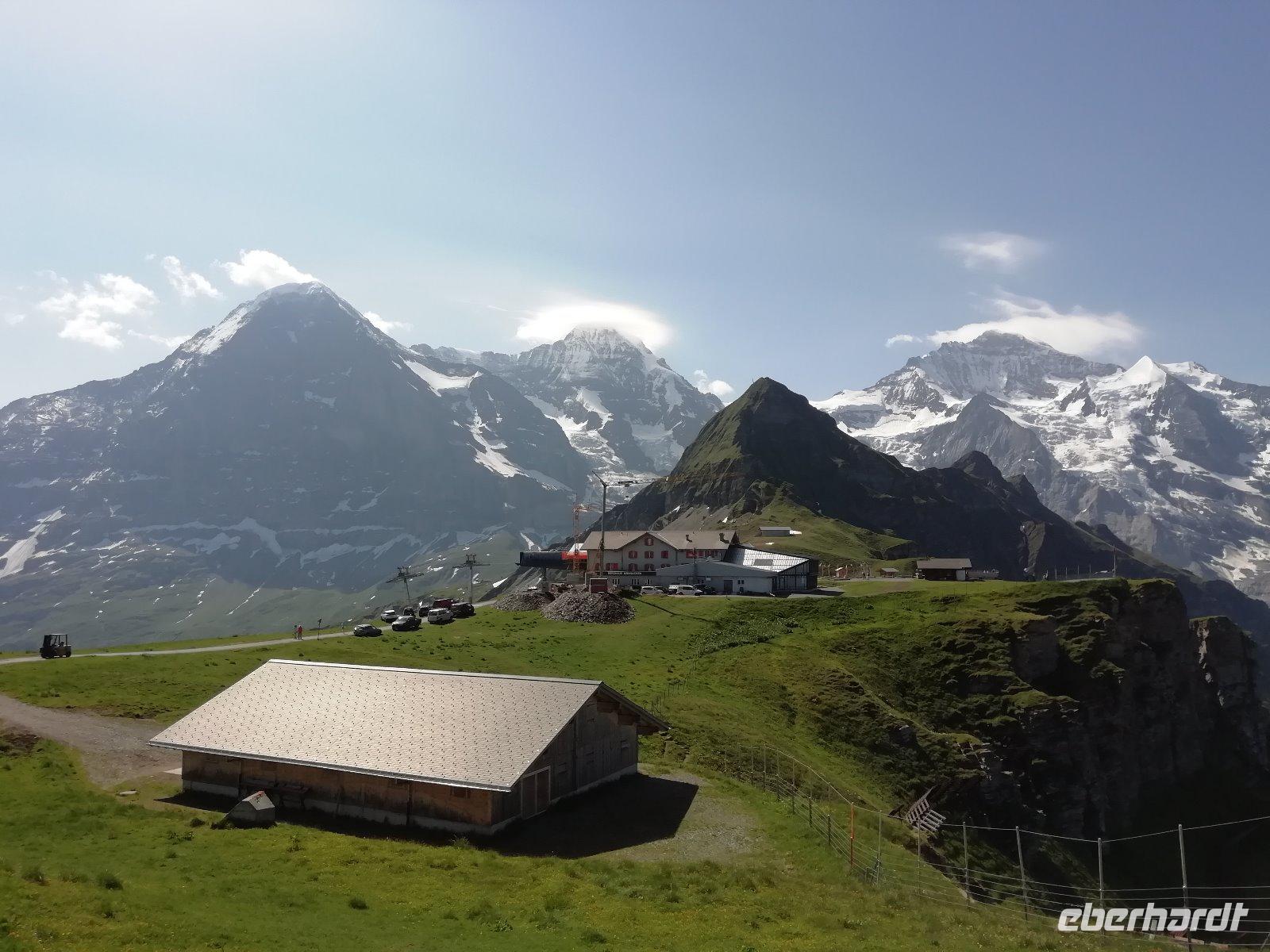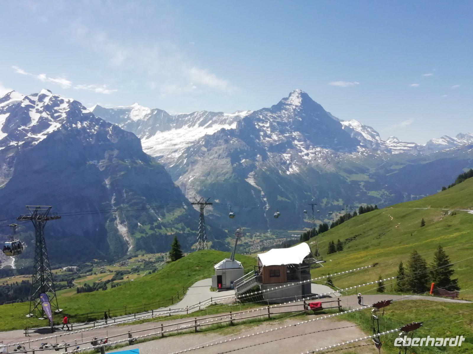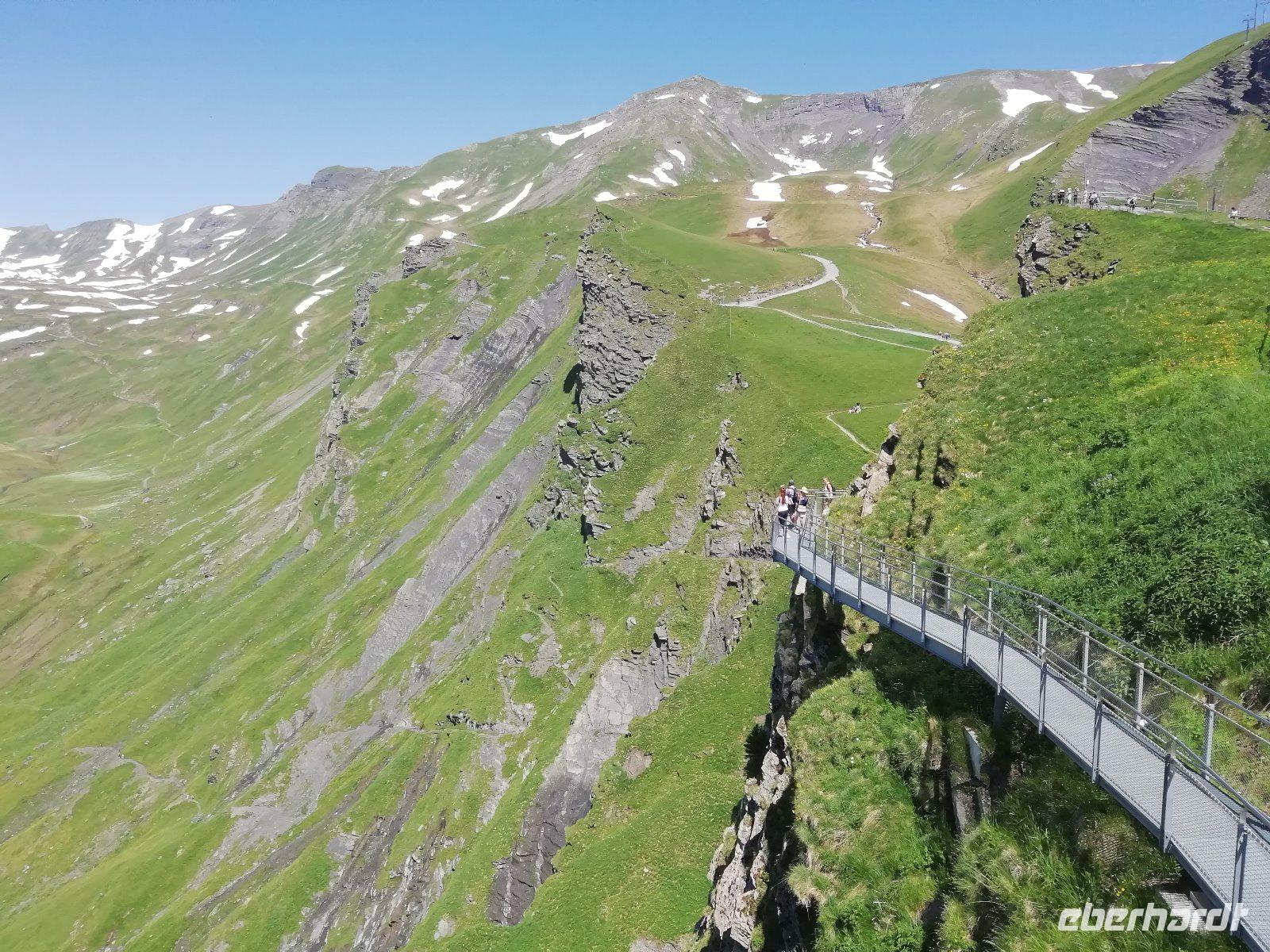 Heute führt uns unser Ausflug vom Tal der Weißen Lütschine ins Tal der Schwarzen Lütschine. Unser Ziel ist Grindelwald. Hier wollen wir mit der Seilbahn auf den First fahren. Doch kurz bevor wir an der Reihe sind, steht die Bahn still. Technischer Defekt - so informiert uns das Personal. In 15 Minuten soll es aber wieder weitergehen. Letztendlich benötigt man für die Reparatur eine Dreiviertelstunde. Doch dann beginnt die wunderschöne Auffahrt. Auf der Sonnenseite des Grindelwaldtales bringt die First-Bahn uns in 25 Minuten hinauf auf 2168 Meter. Direkt an der Bergstation beginnt der spektakuläre Gipfelrundweg „First Cliff Walk" in schwindelerregender Höhe entlang der steilabfallenden Felswände. Immer wieder hat man tolle Aussichten auf die Eigernordwand, zahlreiche andere Gipfel der Berner Alpen, den Wasserfall und die Alpweiden. Einige Gäste wandern noch zum Bachalpsee, der auch gern als „blaues Juwel" bezeichnet wird. Dann lädt der Berggasthof First zum Verweilen ein.