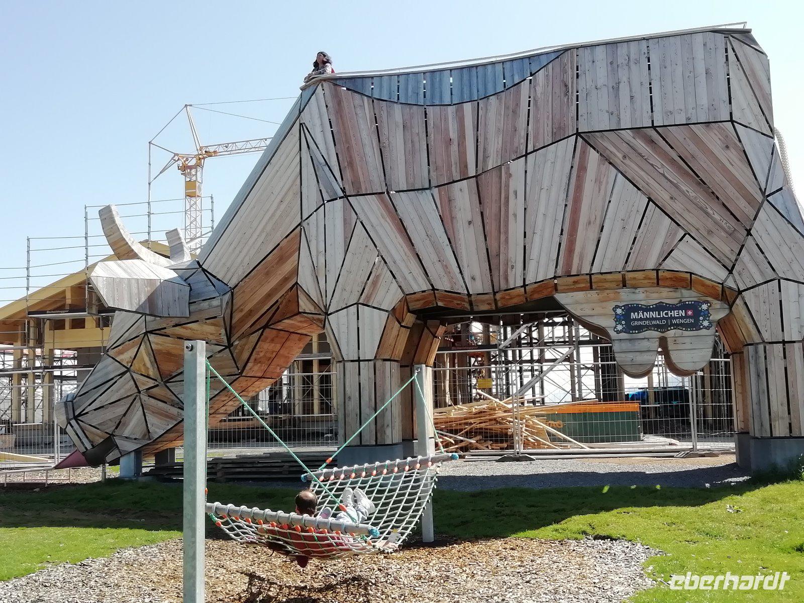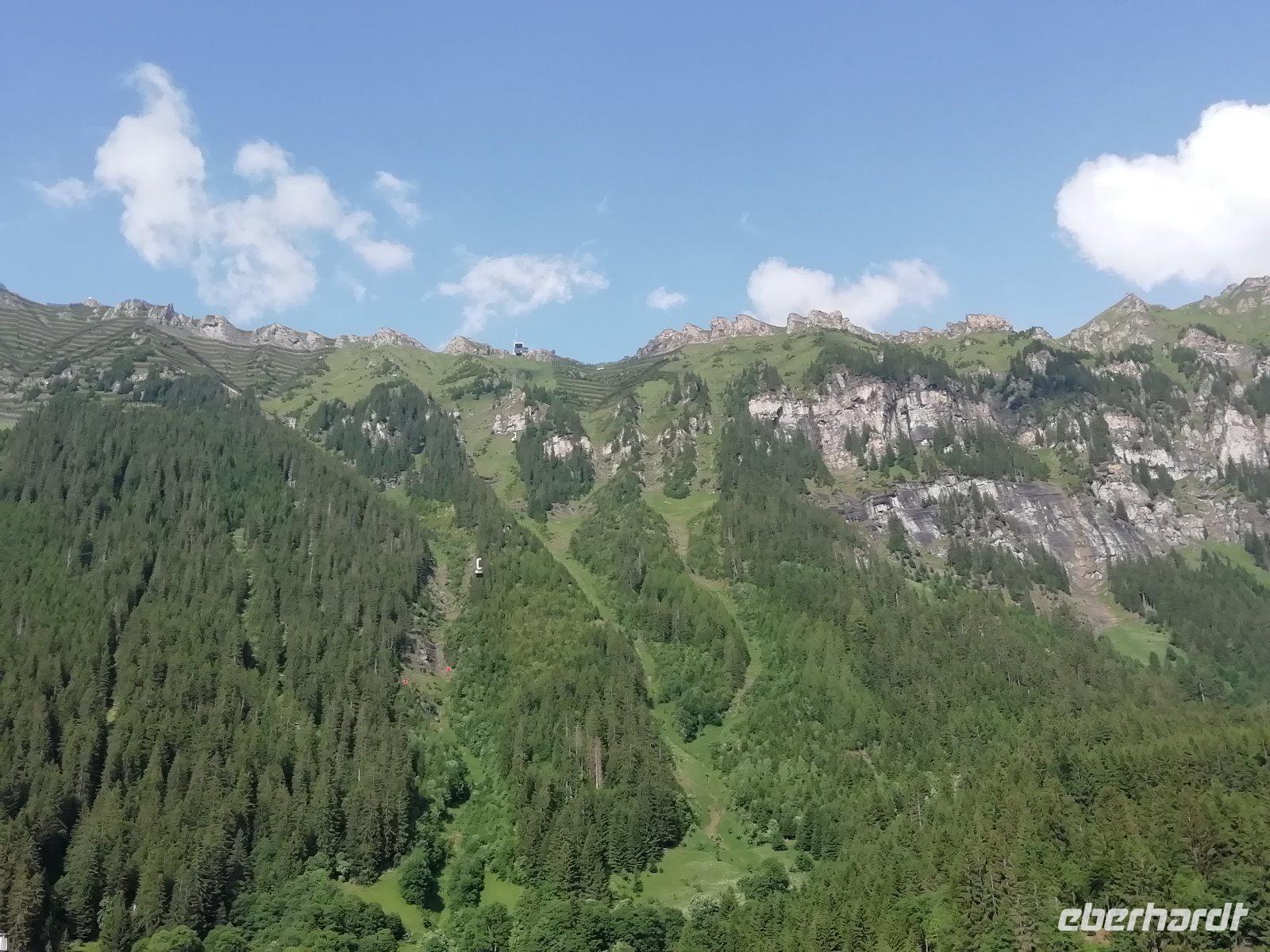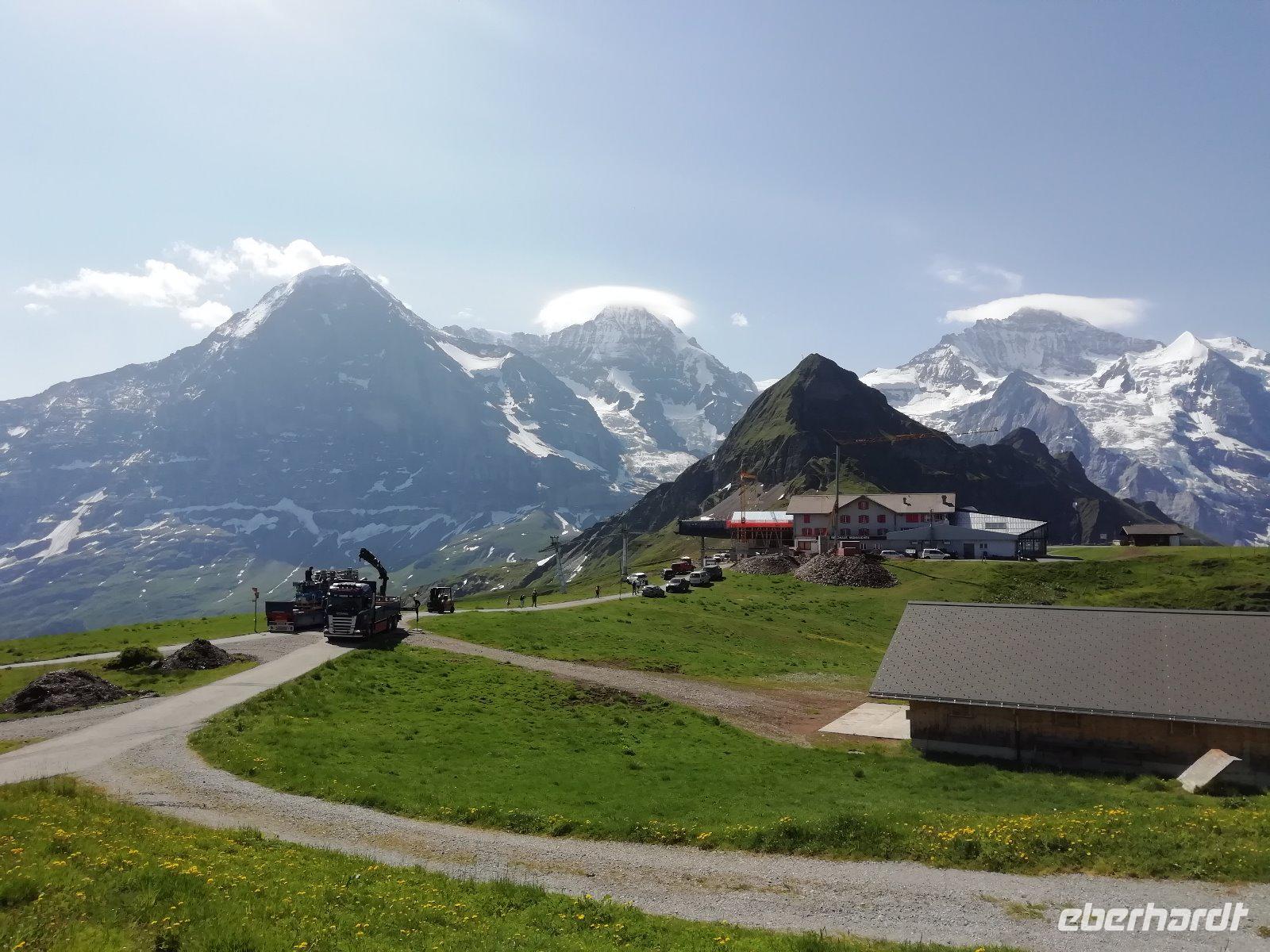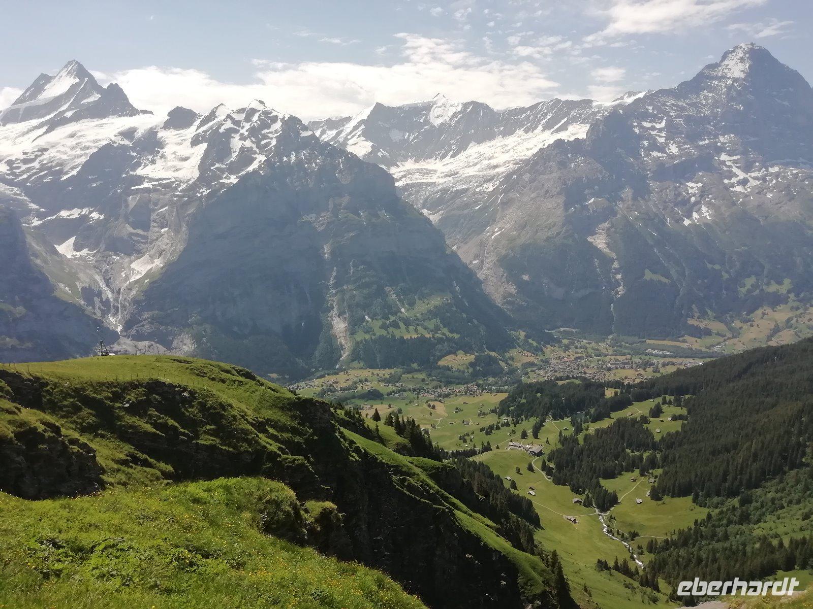 Heute führt uns unser Ausflug vom Tal der Weißen Lütschine ins Tal der Schwarzen Lütschine. Unser Ziel ist Grindelwald. Hier wollen wir mit der Seilbahn auf den First fahren. Doch kurz bevor wir an der Reihe sind, steht die Bahn still. Technischer Defekt - so informiert uns das Personal. In 15 Minuten soll es aber wieder weitergehen. Letztendlich benötigt man für die Reparatur eine Dreiviertelstunde. Doch dann beginnt die wunderschöne Auffahrt. Auf der Sonnenseite des Grindelwaldtales bringt die First-Bahn uns in 25 Minuten hinauf auf 2168 Meter. Direkt an der Bergstation beginnt der spektakuläre Gipfelrundweg „First Cliff Walk" in schwindelerregender Höhe entlang der steilabfallenden Felswände. Immer wieder hat man tolle Aussichten auf die Eigernordwand, zahlreiche andere Gipfel der Berner Alpen, den Wasserfall und die Alpweiden. Einige Gäste wandern noch zum Bachalpsee, der auch gern als „blaues Juwel" bezeichnet wird. Dann lädt der Berggasthof First zum Verweilen ein.