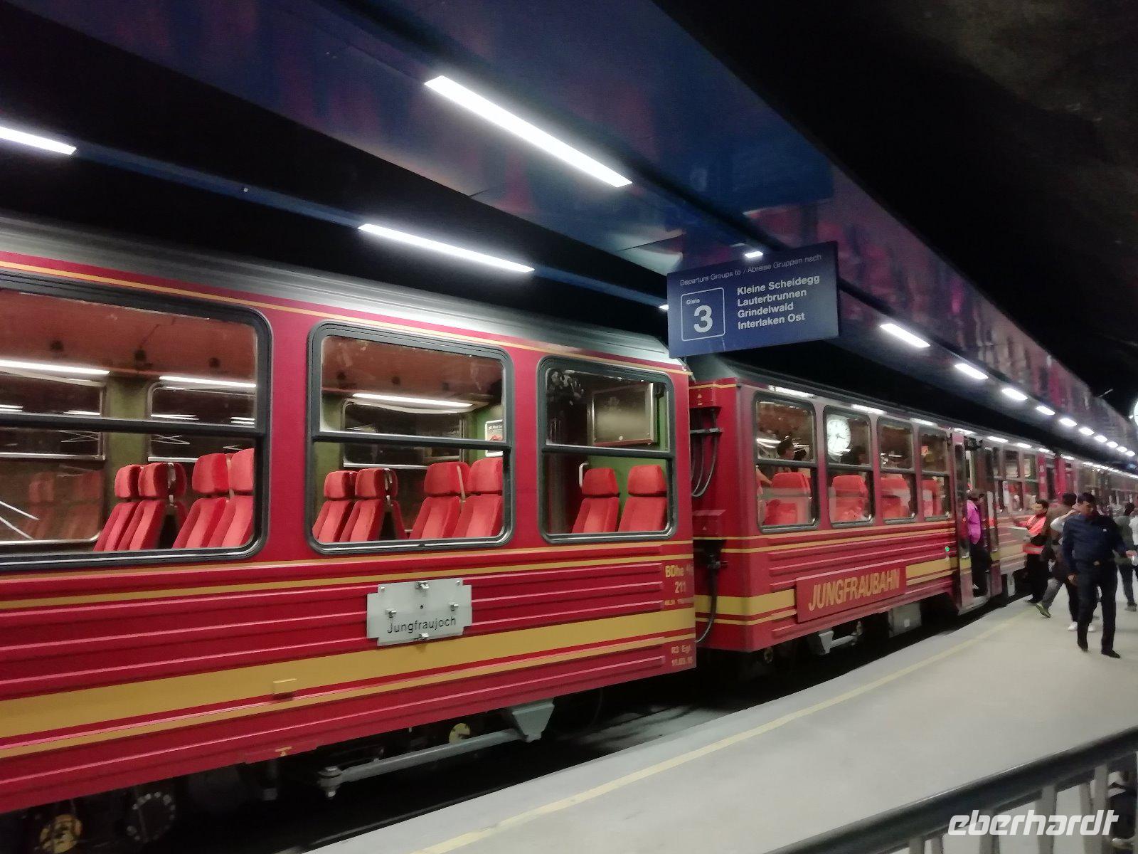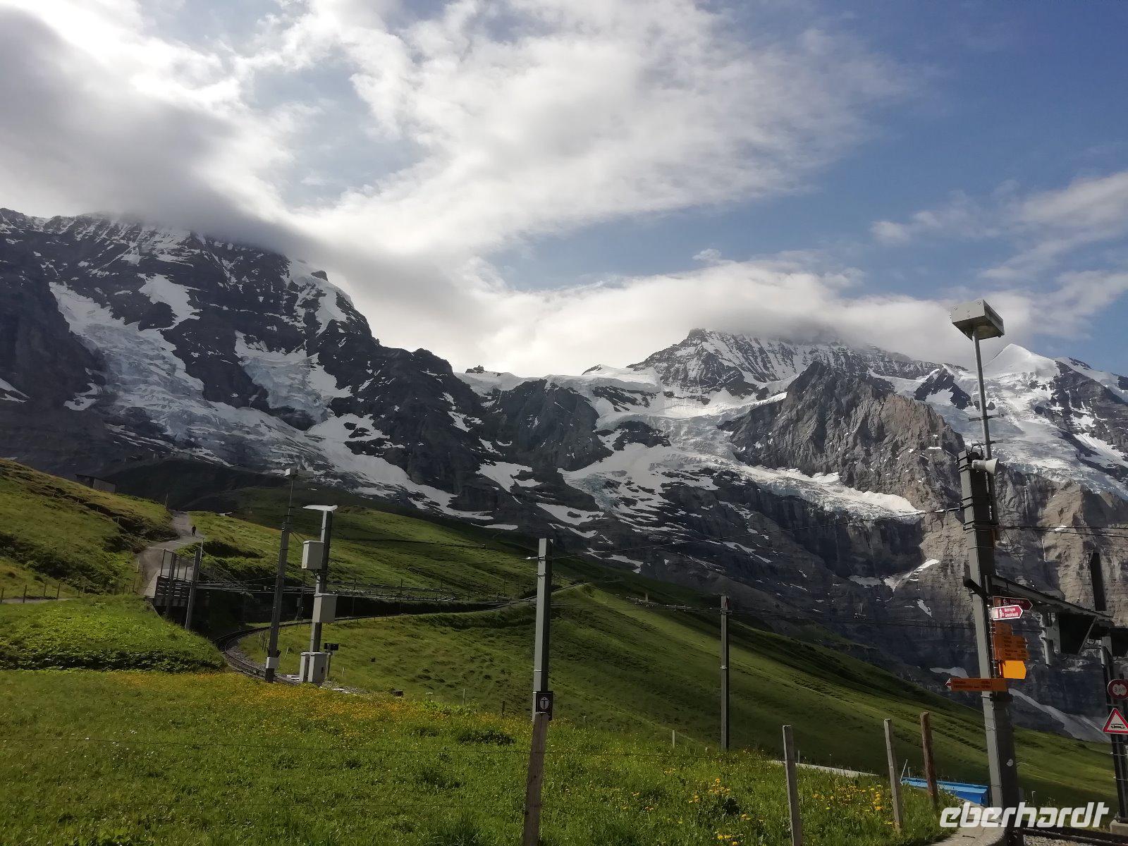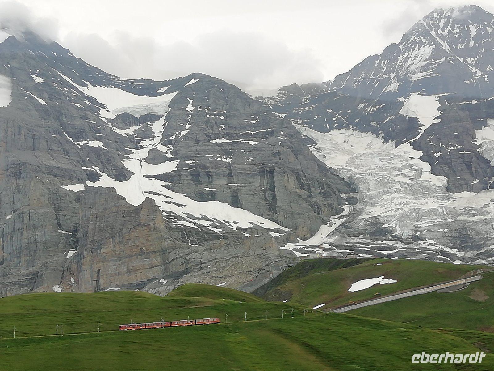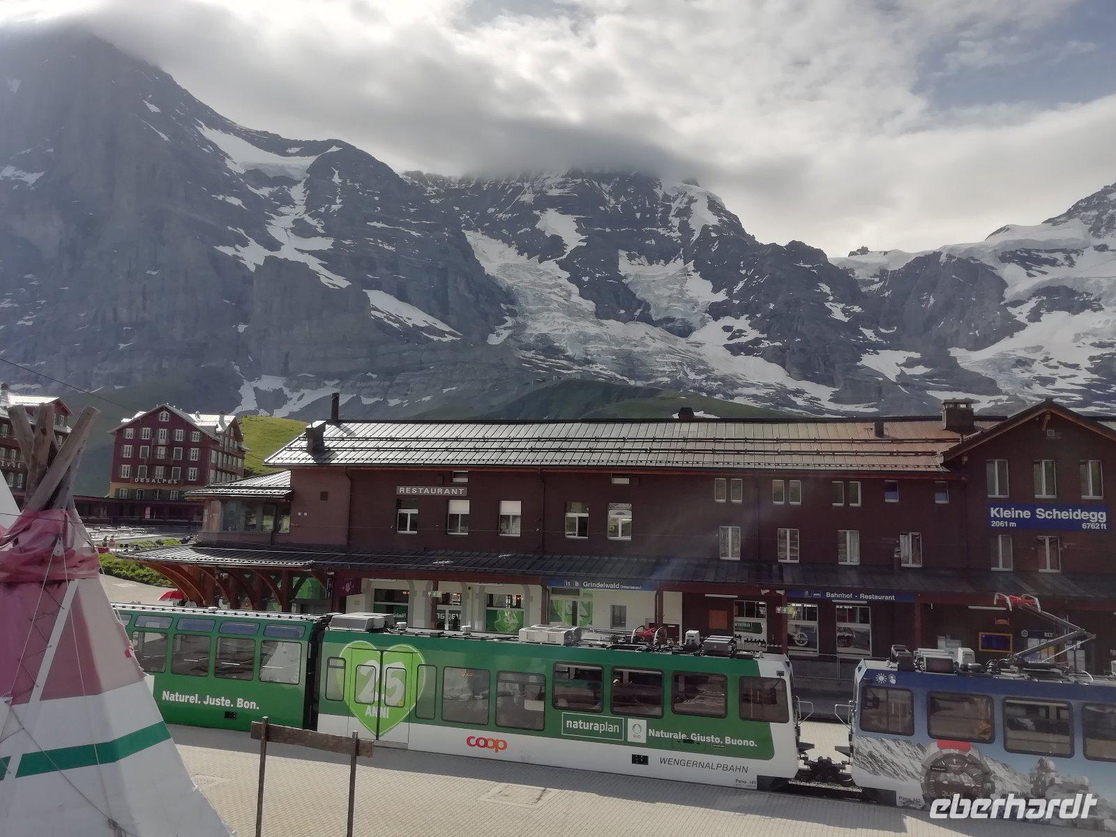 Schnell sind die Stunden auf dem Jungfraujoch vergangen. Die Jungfraubahn bringt uns wieder zur Station Kleine Scheidegg. Wir sehen, wie sich eine dicke Wolke an der Eigernordwand festkrallt. Weiter fahren wir dann mit der Wengernalpbahn zurück zum Hotel.
