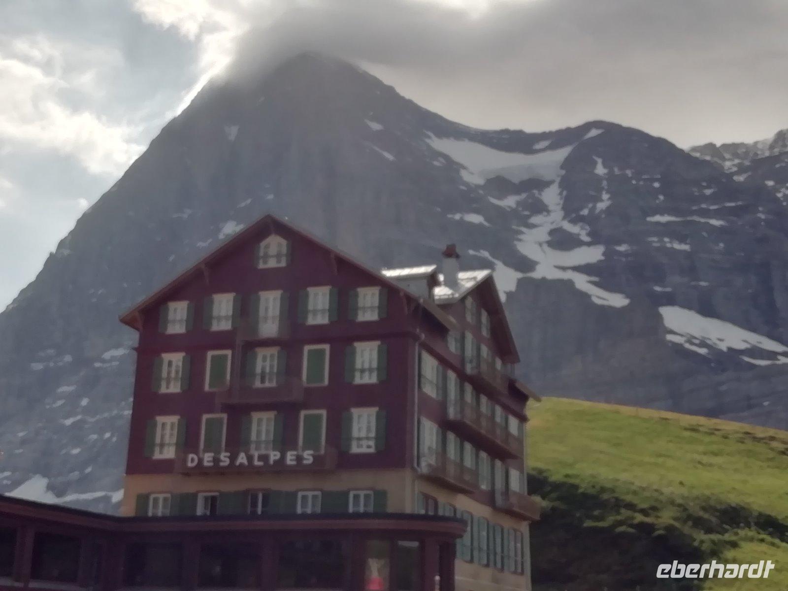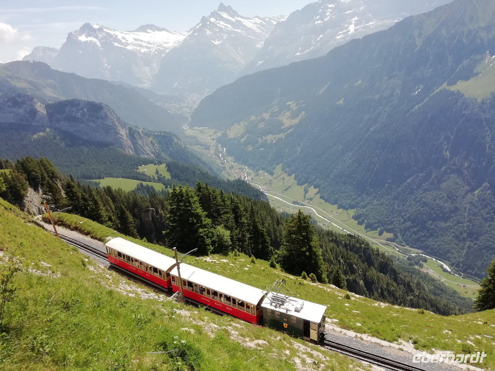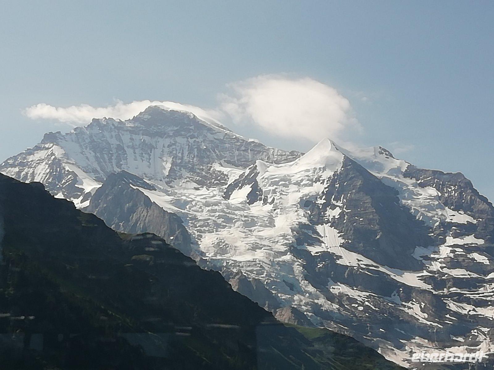 Schnell sind die Stunden auf dem Jungfraujoch vergangen. Die Jungfraubahn bringt uns wieder zur Station Kleine Scheidegg. Wir sehen, wie sich eine dicke Wolke an der Eigernordwand festkrallt. Weiter fahren wir dann mit der Wengernalpbahn zurück zum Hotel.