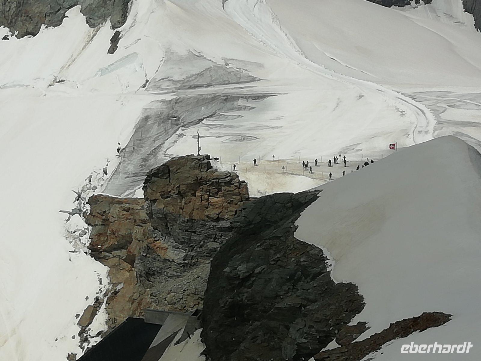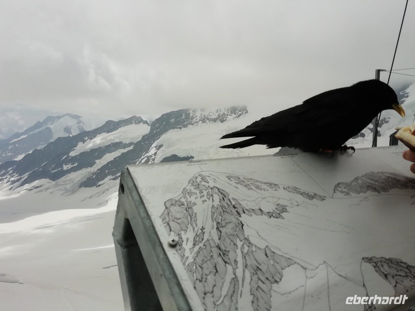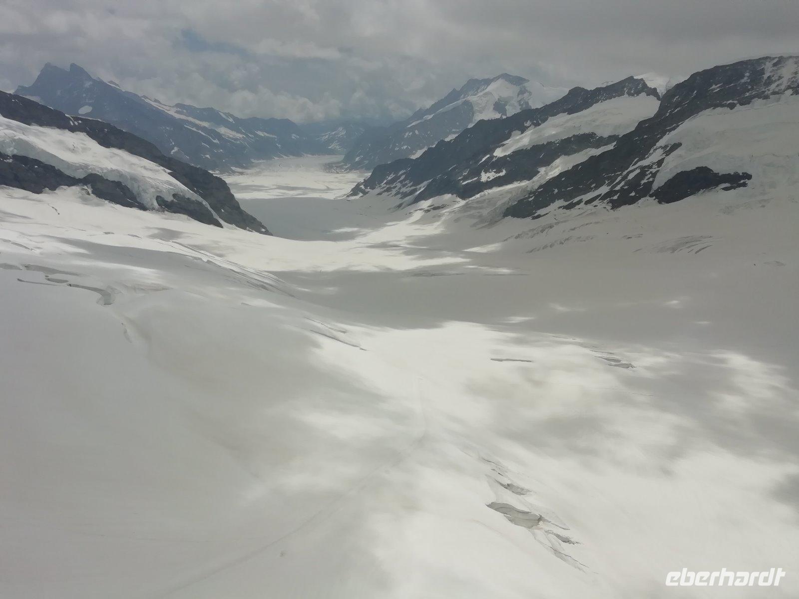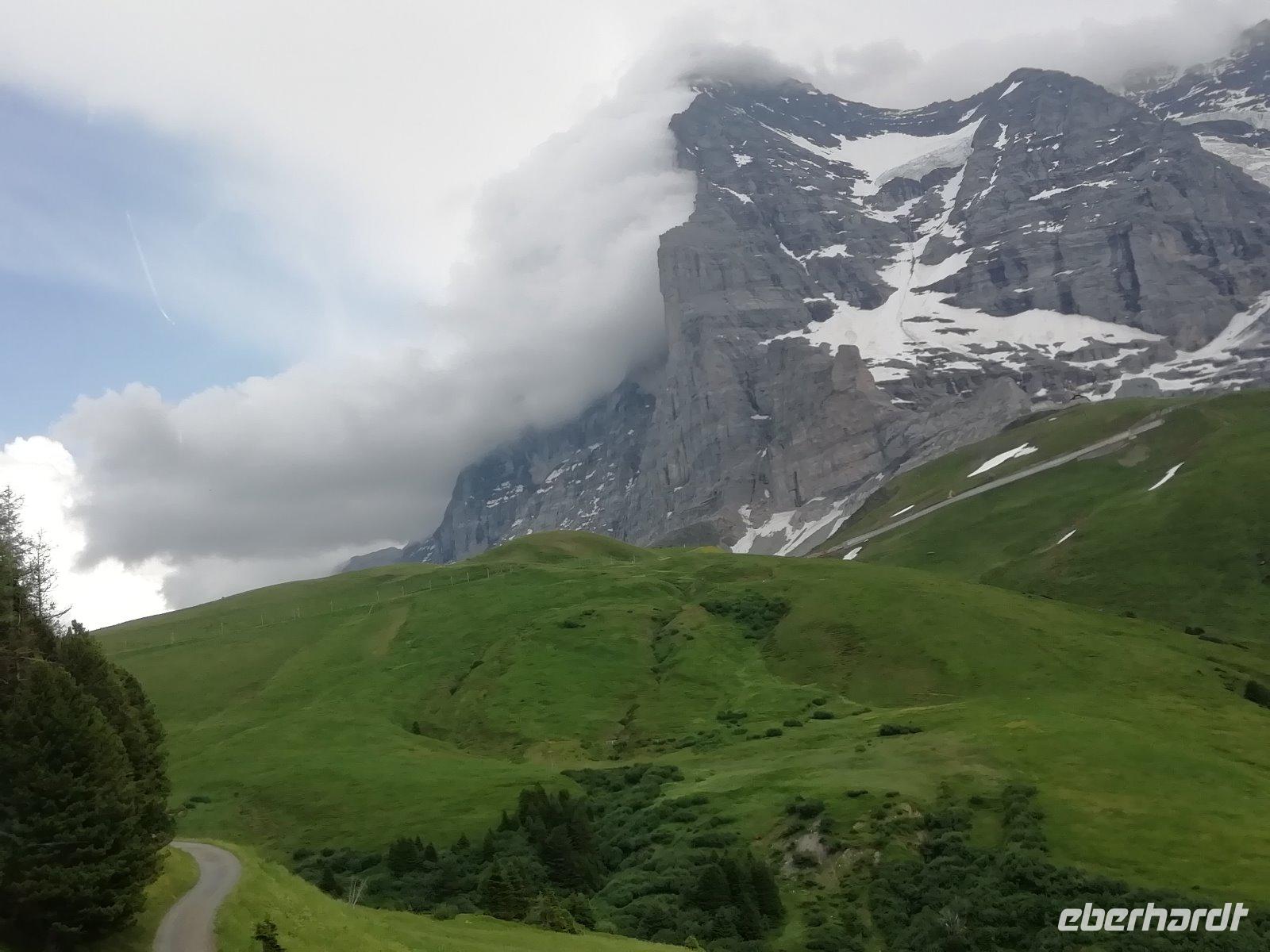 Schnell sind die Stunden auf dem Jungfraujoch vergangen. Die Jungfraubahn bringt uns wieder zur Station Kleine Scheidegg. Wir sehen, wie sich eine dicke Wolke an der Eigernordwand festkrallt. Weiter fahren wir dann mit der Wengernalpbahn zurück zum Hotel.