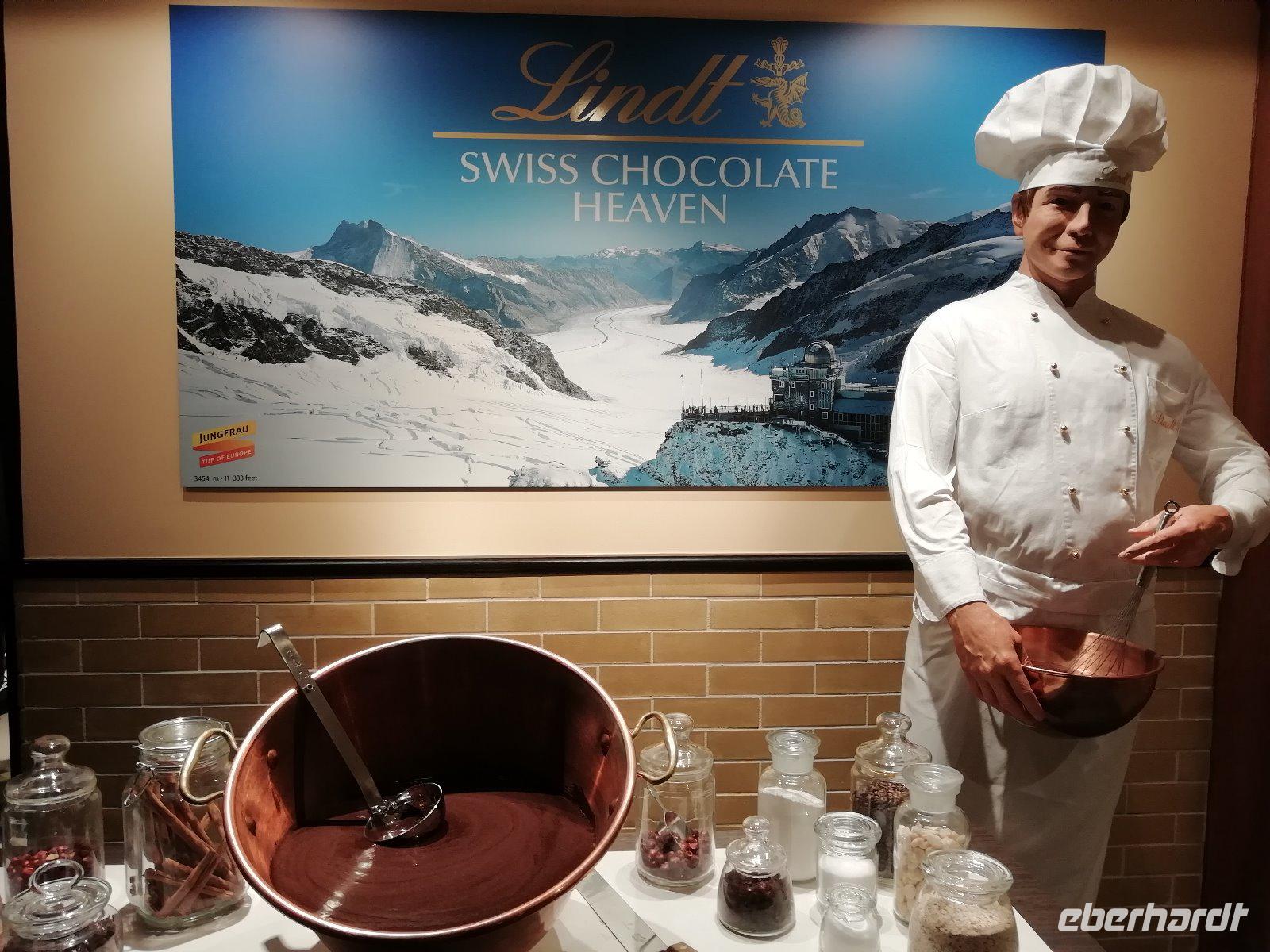 Heute wollen wir ganz hoch hinauf: das Jungfraujoch steht auf unserem Ausflugsplan. Nach dem Frühstück gehen wir zum nahegelegen Bahnhof. Von hier fahren wir mit der Zahnradbahn zur Kleinen Scheidegg. Das Dreigestirn Eiger, Mönch und Jungfrau präsentiert sich nun direkt vor uns. Sehr gut einsehbar ist besonders die Eigernordwand. Den Aufenthalt nutzen wir für zahlreiche Fotos, dann geht es mit der Jungfraubahn weiter. An der Station Eismeer legen wir einen Fotostopp ein. Nach 50 Minuten erreichen wir den mit 3454 m höchstgelegenen Bahnhof Europas. Von der Bahnhofshalle gelangen wir direkt ins Hauptgebäude, wo wir dem Symbol „Tour" folgen können. Einige Gäste laufen bis zur Station „Aletschgletscher" und spazieren durch den Schnee. Gut, dass wir unsere dicken Jacken dabei haben, denn das Thermometer zeigt nur 3 Grad an. Die Wanderung bis zur Mönchsjochhütte ist aber bei diesen Schneeverhältnissen doch etwas zu beschwerlich. Deshalb geht es nun zum Wahrzeichen des Jungfraujochs, zum Sphinx-Observatorium. In 27 Sekunden erreichen wir es mit dem schnellsten Lift der Schweiz. Die Aussichtsterrasse bietet einen wunderbaren Blick auf den Aletschgletscher. Weiter geht es zum Erlebnisrundgang „Alpine Sensation". Wir bestaunen das „Wunderland Schweiz in der Schneekugel", schauen auf die Anfänge des Tourismus in der Jungfrau-Region und in die Geschichte der Jungfraubahn. Dann wird es kalt, denn wir befinden uns im Eispalast. Hier treffen wir auf Pinguine und Eisbären. Unsere nächste Station ist das Gletscherplateau, wo seit der Einweihung der Jungfraubahn die Schweizer Fahne weht. Wir stehen zu Füßen der Jungfrau und auch von hier haben wir noch einmal den Blick auf den Aletschgletscher. Zum Schluss tauchen wir mit Lindt ein in die süße Welt der Schweizer Schokolade.