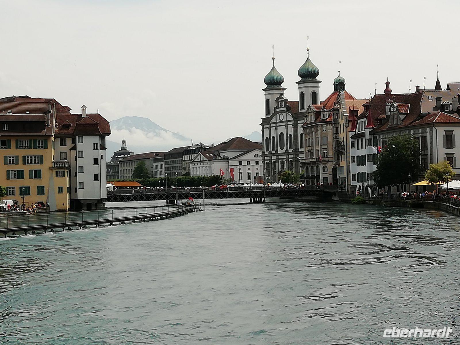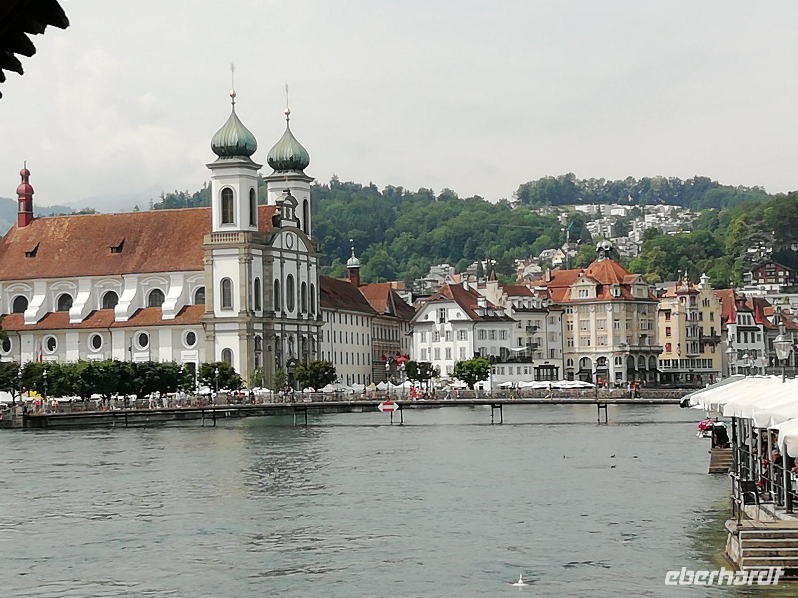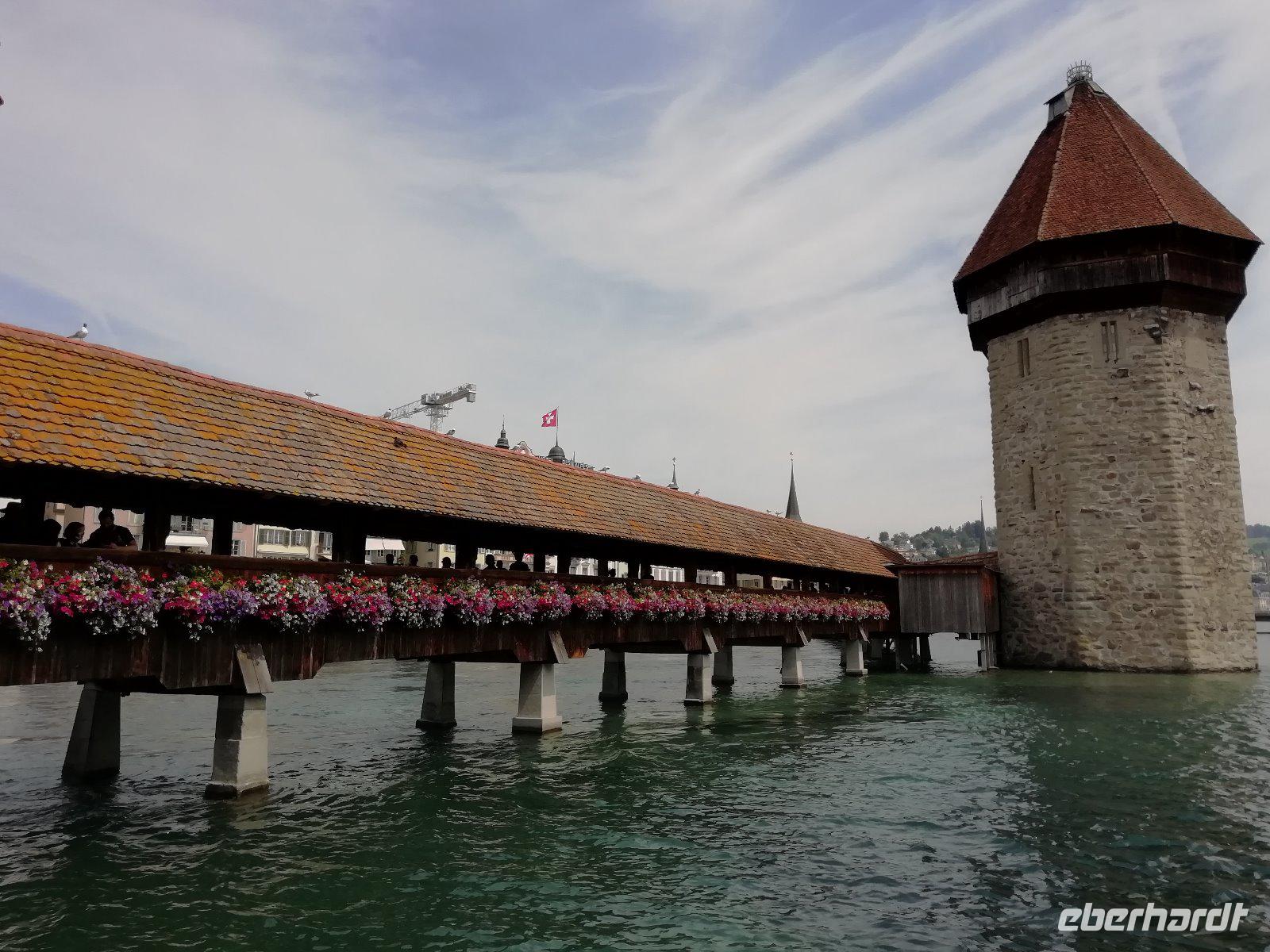 Heute geht es mit dem Bus nach Luzern. Dabei fahren wir durch das Lütschinental Richtung Interlaken, weiter entlang des Brienzersees und über den Brünigpass. Am Ausblick Lungernsee wird ein kurzer Halt zum Fotografieren gemacht. Dann erreichen wir bald Luzern. Am Löwenplatz treffen wir uns mit Stadtführerin Christina. Sie zeigt uns als erstes den „sterbenden Löwen von Luzern". Er wurde zum Andenken an den Heldentod der 1792 in Paris gefallenen Schweizer in eine 20 Meter hohe Sandsteinwand gehauen. Dann erkunden wir Luzern zu Fuß. Wir beginnen mit dem Wahrzeichen der Stadt: der weltbekannten Kapellbrücke. Dabei erfahren wir Interessantes zur Geschichte der ältesten gedeckten Holzbrücke der Welt. Wir überqueren auf ihr die Reuss und kommen zur Jesuitenkirche. Von hier hat man auch einen schönen Blick zum gegenüberliegenden Rathaus. Wegen Reinigungsarbeiten ist die Kirche leider geschlossen, doch Christina zeigt uns Bilder vom Innenraum. Weiter geht es zum „Nadelwehr". Dabei handelt es sich um eine Einrichtung zur Regelung der Wasserabflussmenge und damit des Wasserstandes des Vierwaldstätter Sees. Über die Spreuerbrücke gelangen wir wieder in die Altstadt mit malerischen Gassen und freskengeschmückten Häusern. Die verbleibende Zeit nutzen die Gäste noch für einen Bummel entlang des Vierwaldstätter Sees oder lassen sich bei der Hitze einen Eisbecher am Reussufer schmecken.