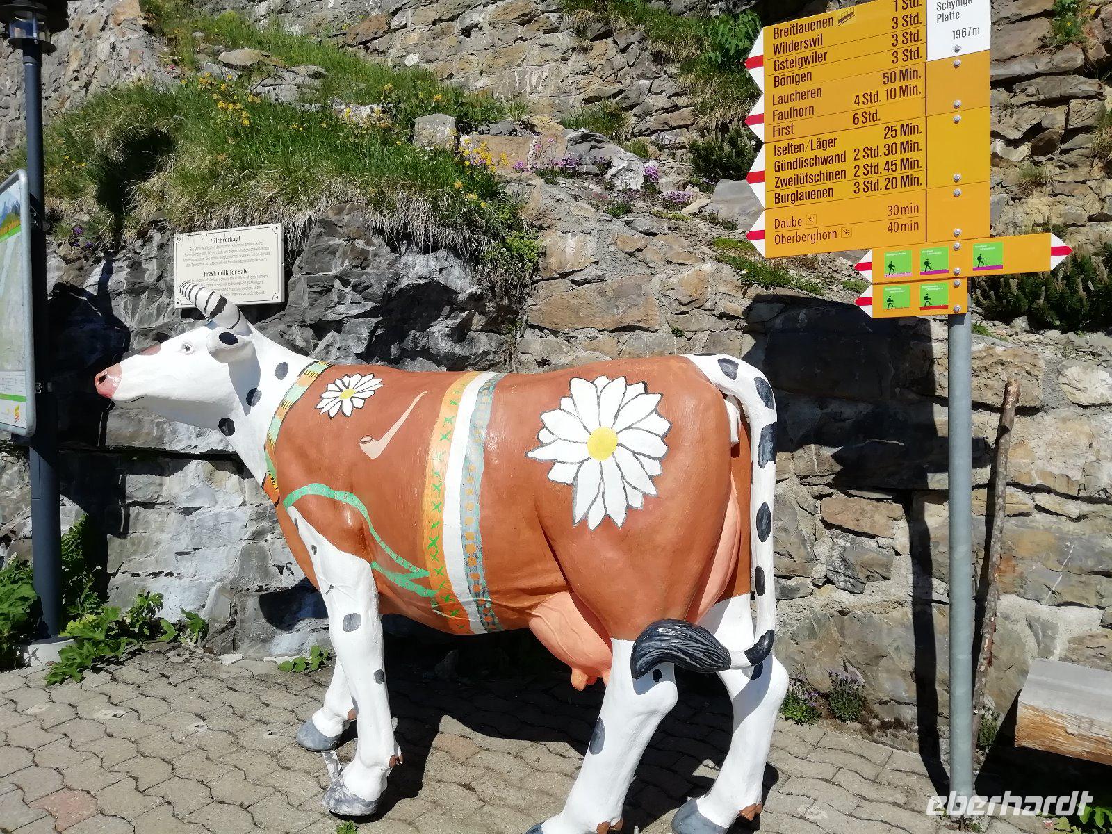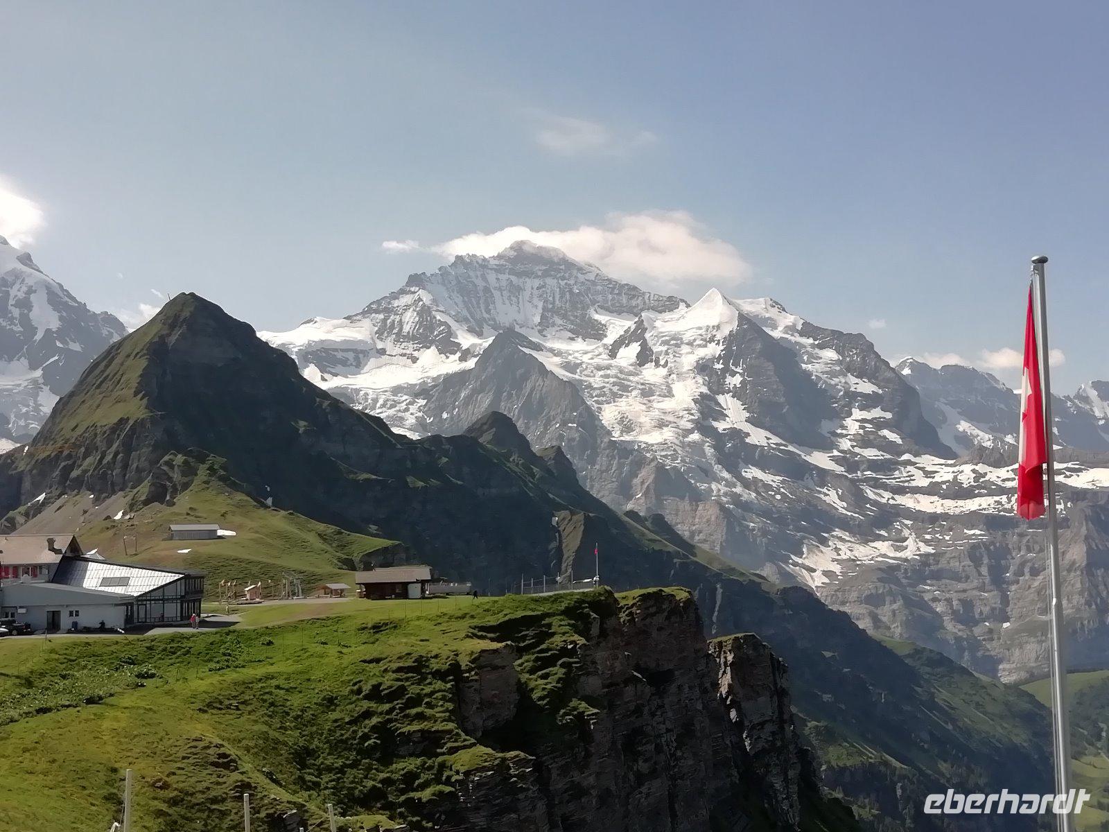 Den heutigen Tag verbringen die Gäste individuell. Alle wollen ihren Jungfraupass nutzen und haben sich bei dem schönen Wetter viel vorgenommen. Als erstes lockt der Männliche. Nur einige Schritte vom Hotel entfernt befindet sich die Talstation der Seilbahn. Die Fahrt dauert nur wenige Minuten und kann sogar auf dem Freiluftbalkon der Kabine genossen werden. Oben in 2222m Höhe sind wir von der Aussicht begeistert. Sogar vom Rücken der Riesenkuh Lieselotte können wir die Sicht auf Eiger, Mönch und Jungfrau genießen. Wer das noch steigern möchte, erklimmt auf dem „Royal Walk" in 30 Minuten den 2345 hohen Gipfel. Der Panoramablick von der kronenförmigen Aussichtsplattform ist wirklich „königlich". Einige Gäste wandern dann vom Männlichen zum Kleinen Scheidegg, andere fahren hinunter nach Lauterbrunnen, von dort auf die Grütschalp und weiter nach Mürren. Einige wollen nochmal nach Interlaken und mit dem Schiff nach Brienz oder Thun.