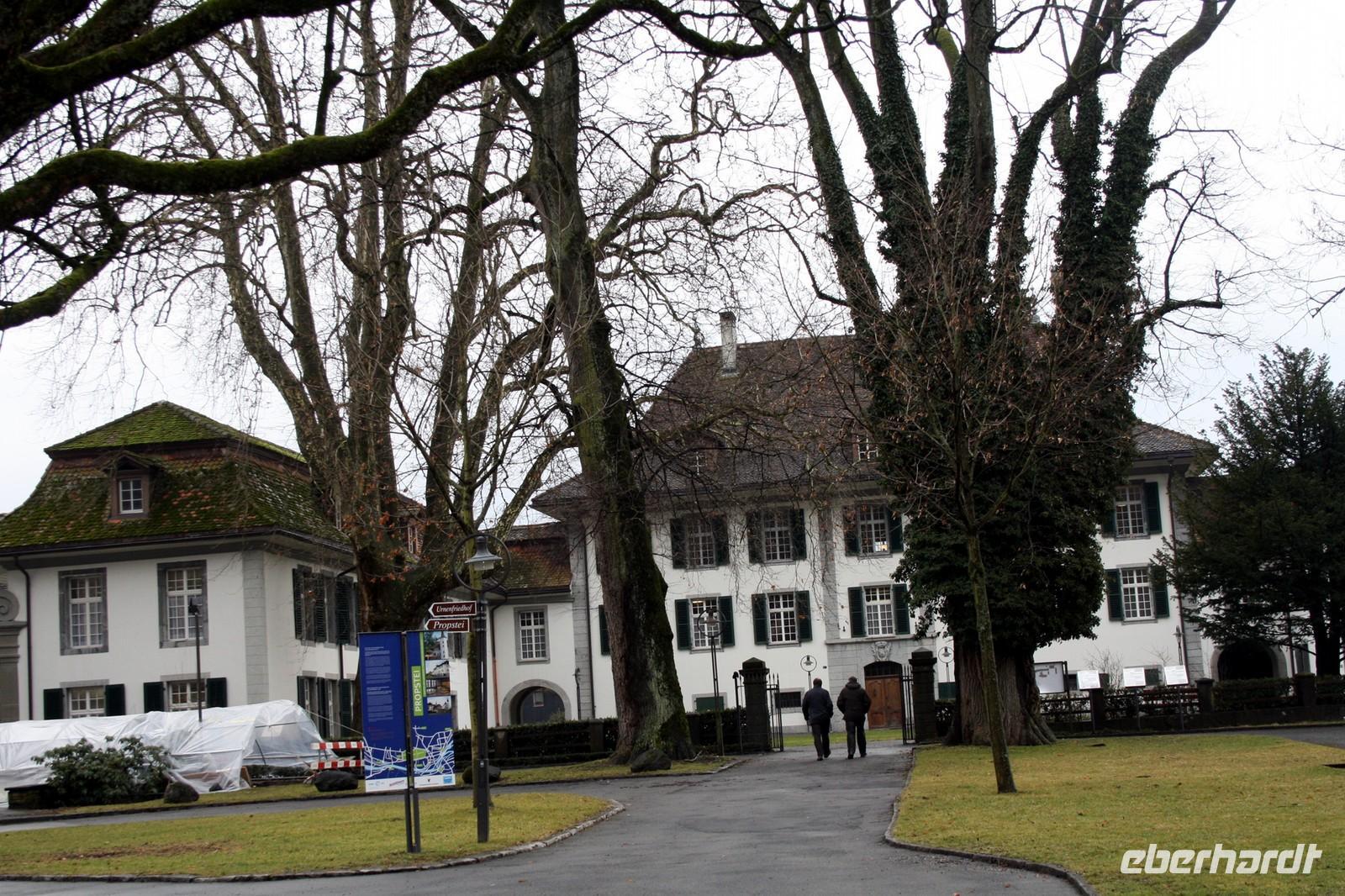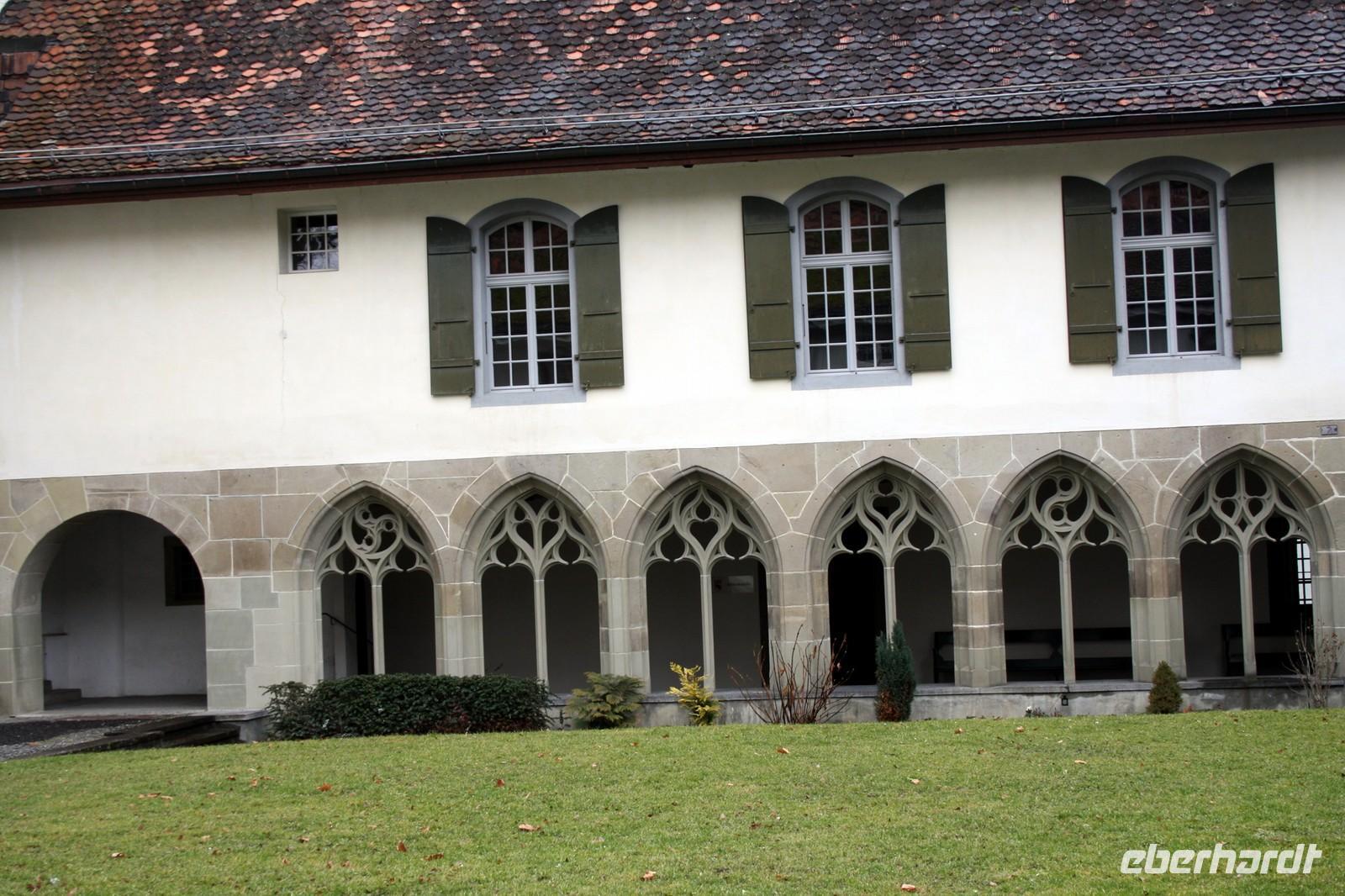 Östlich der Höhenmatte, eine Fläche, die nur landwirtschaftlich genutzt werden darf, befindet sich der ehemalige Klosterbereich mit Schloss und Schlosskirche, links die katholische, rechts die protestantische Kirche. Das Augustinerkloster wurde erstmals 1133 urkundlich erwähnt. Nach der Reformation (1525) ging der ganze Klosterbesitz an den Staat Bern über.