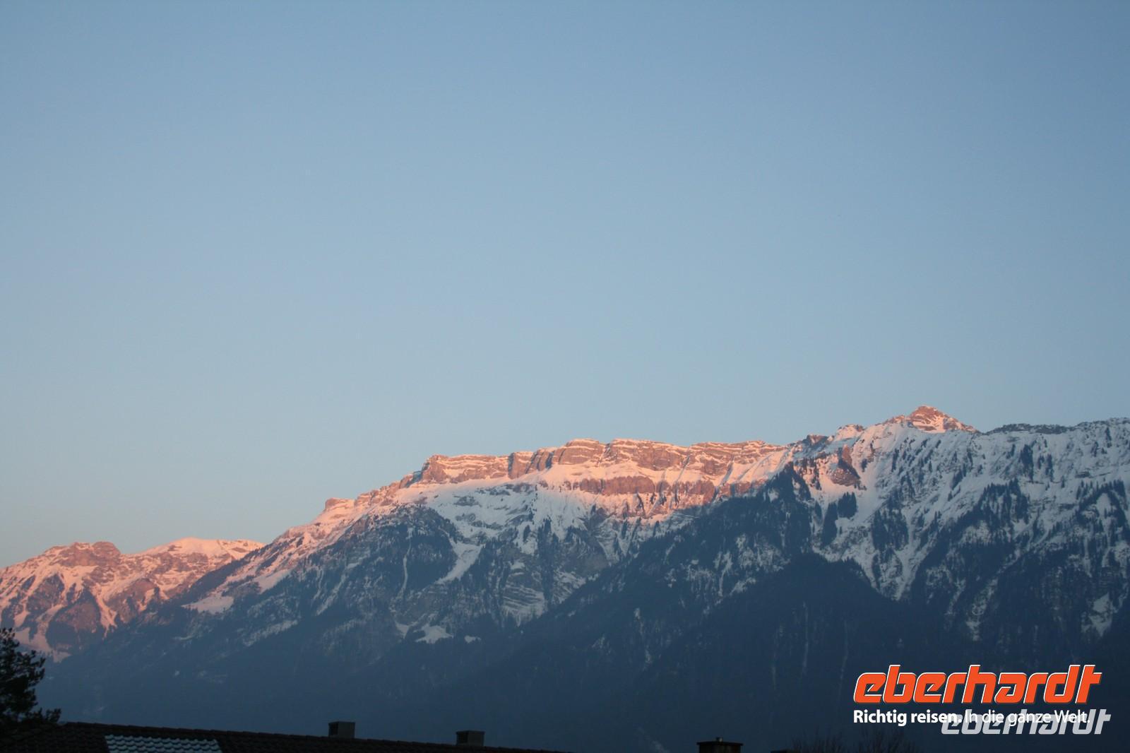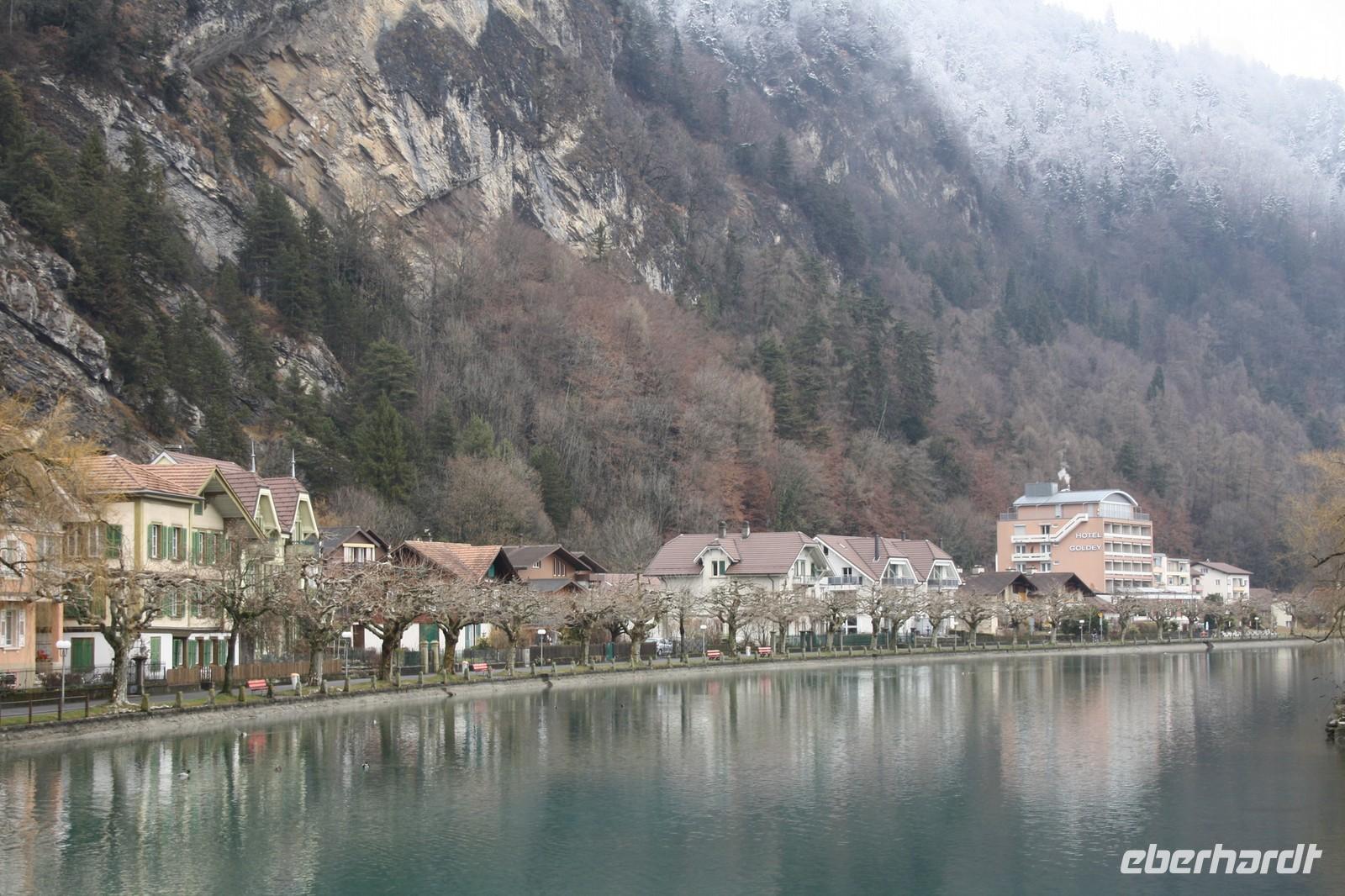 Diesmal fuhren wir die schöne Strecke nach Interlaken, nämlich am Nordufer des Thuner Sees. Sonnenschein und frühlingshafte Temperaturen verlockten zum Halten und Genießen. denn es bot sich uns ein malerischer Anblick: Am See hatten wir mediterranes Flair und im Hintergrund die schneebedeckten Drei- und Viertausender, die sich im See spiegelten.