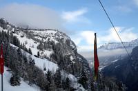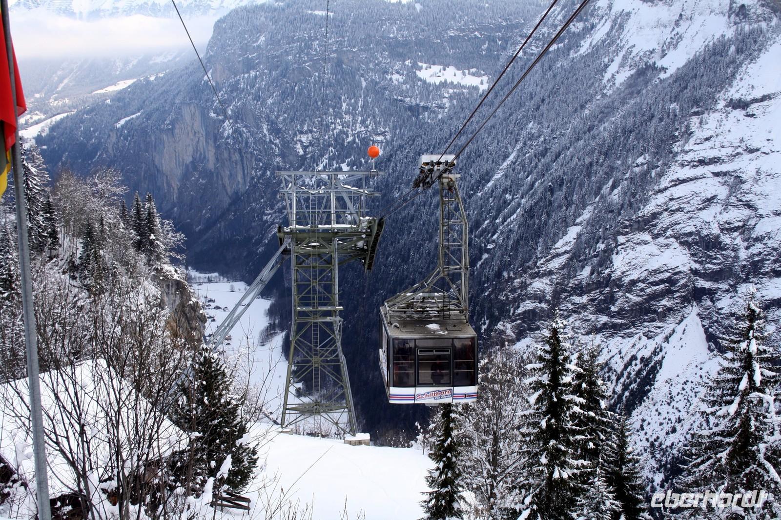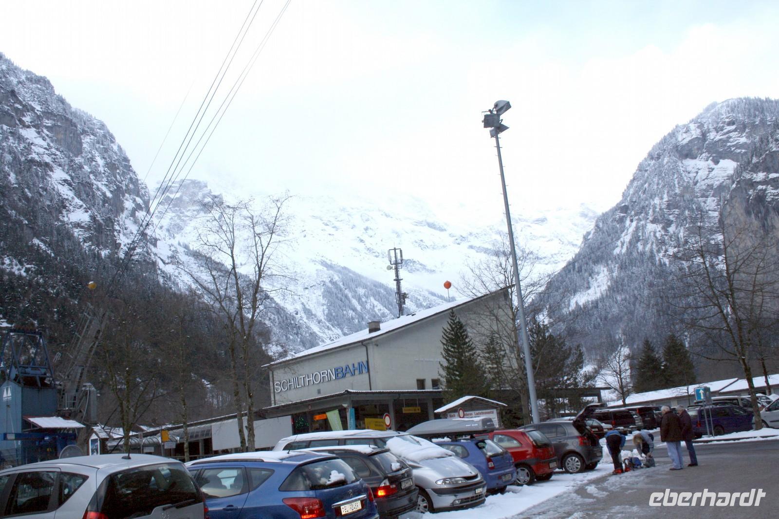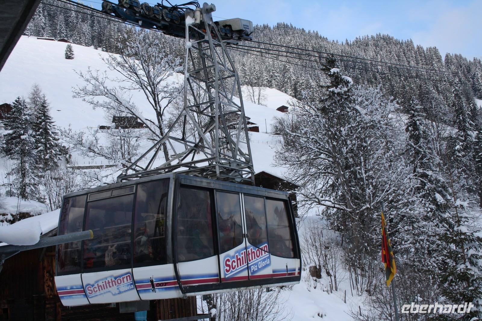 Von der Talstation Stechelberg aus stiegen wir mit vielen Ski- und Snowboardfahrern in die erste von vier Seilbahnen und fuhren bis Gimmelwald 1367 Meter hoch. Der nächste Abschnitt ging bis Mürren 1638 Meter hoch. Auf der längsten Strecke Mürren - Birg (2677 m) überwindet die Schilthornbahn eine Höhendifferenz von 1039 Meter. Mittlerweile zeigte sich auch die Sonne, sodass es ein wunderschöner Wintertag zu werden versprach.