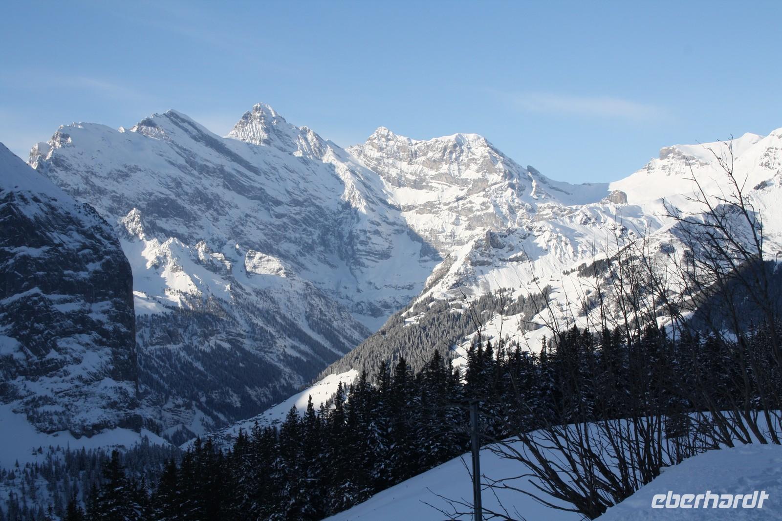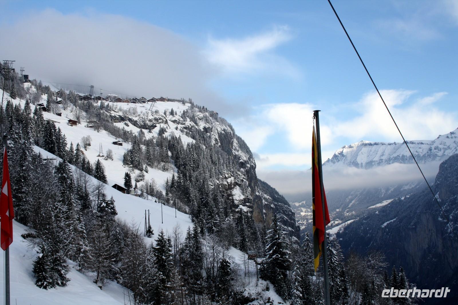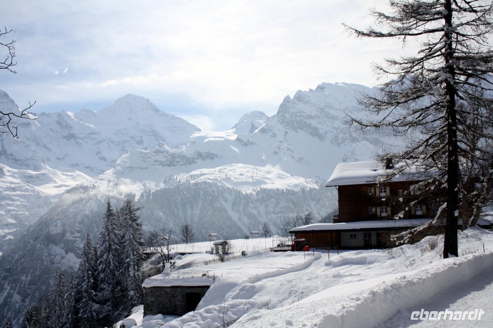 Einen Stopp legten wir in Mürren ein und spazierten bei herrlichem Winterwetter durch den Ort und genossen die Sonne und den Blick ins Lauterbrunnental sowie das "Dreigestirn".