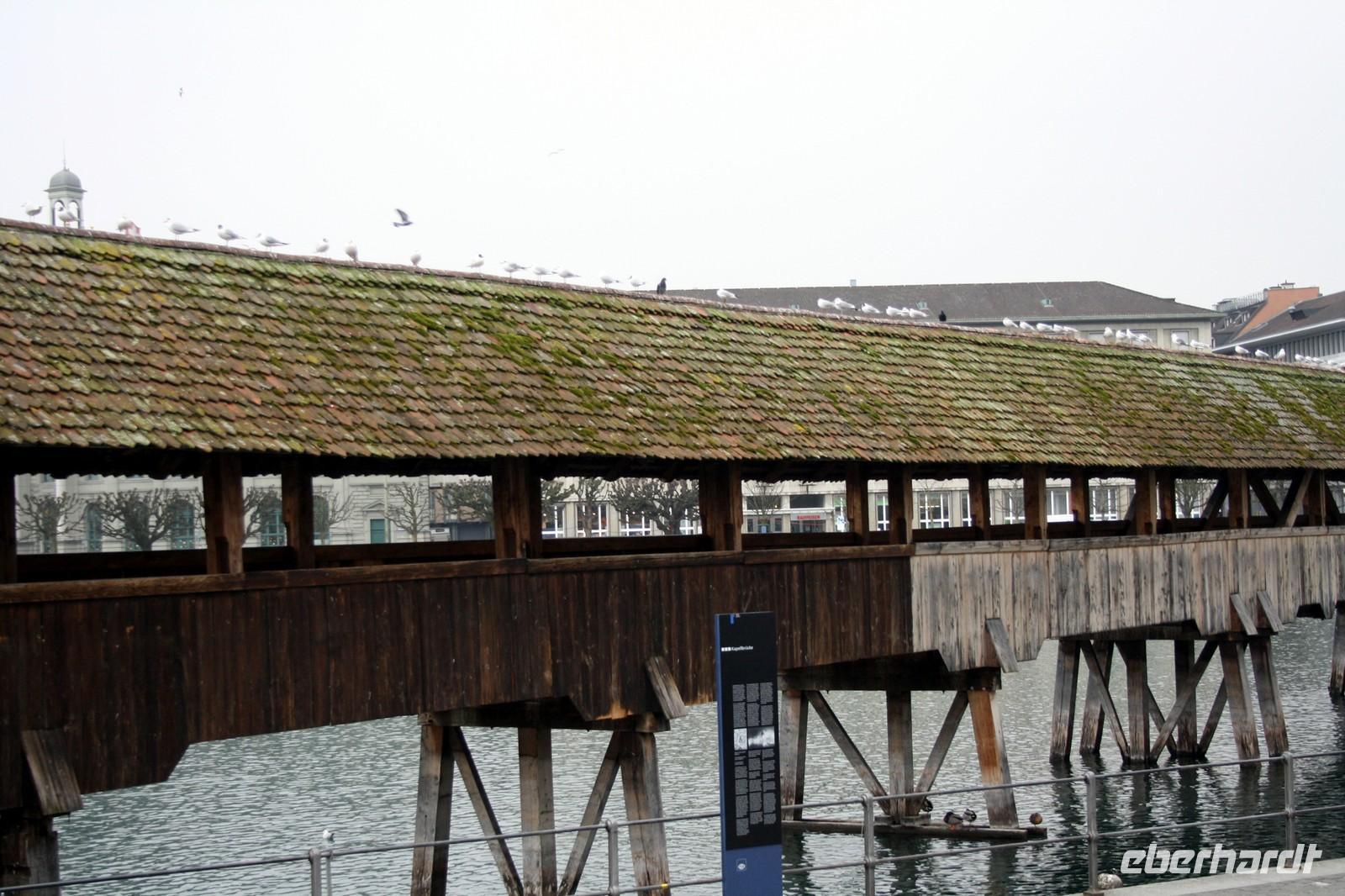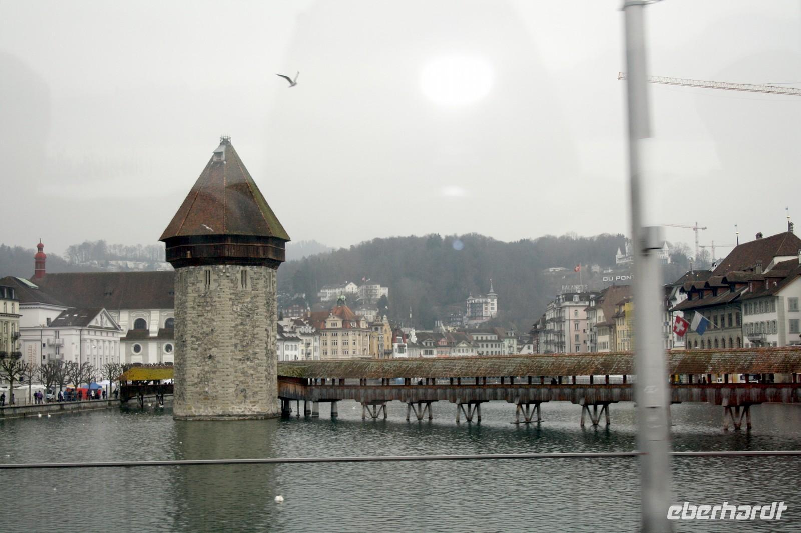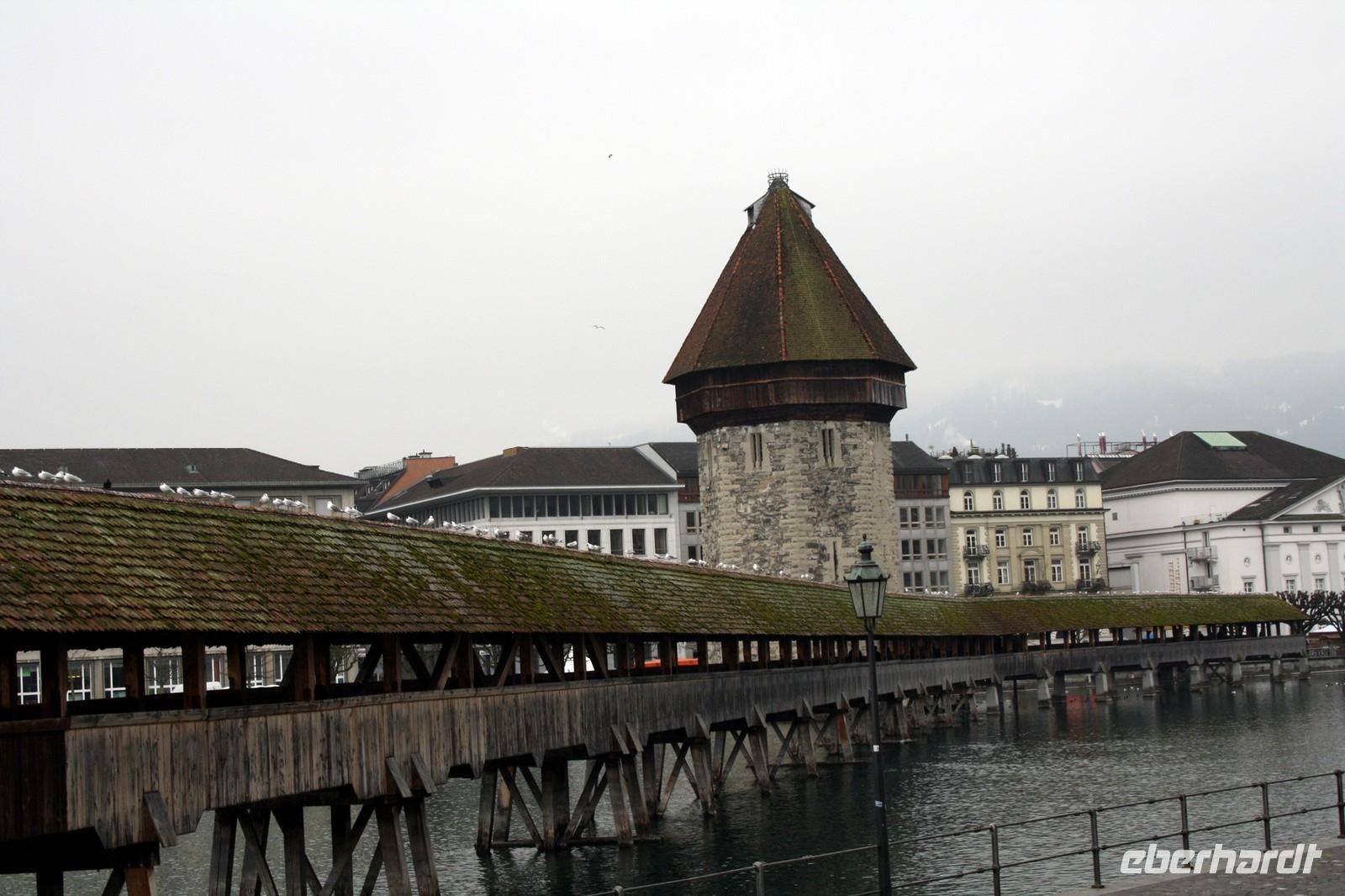 Nach der Besichtigung der Altstadt kamen wir zur Kappelbrücke, dem Wahrzeichen von Luzern. Die Brücke selbst brannte 1993 nieder und wurde nachher komplett wiederaufgebaut. Allerdings sind die bekannten Malereien innerhalb der Brücke verloren gegangen. In der Mitte der Brücke trohnt der Wasserturm.