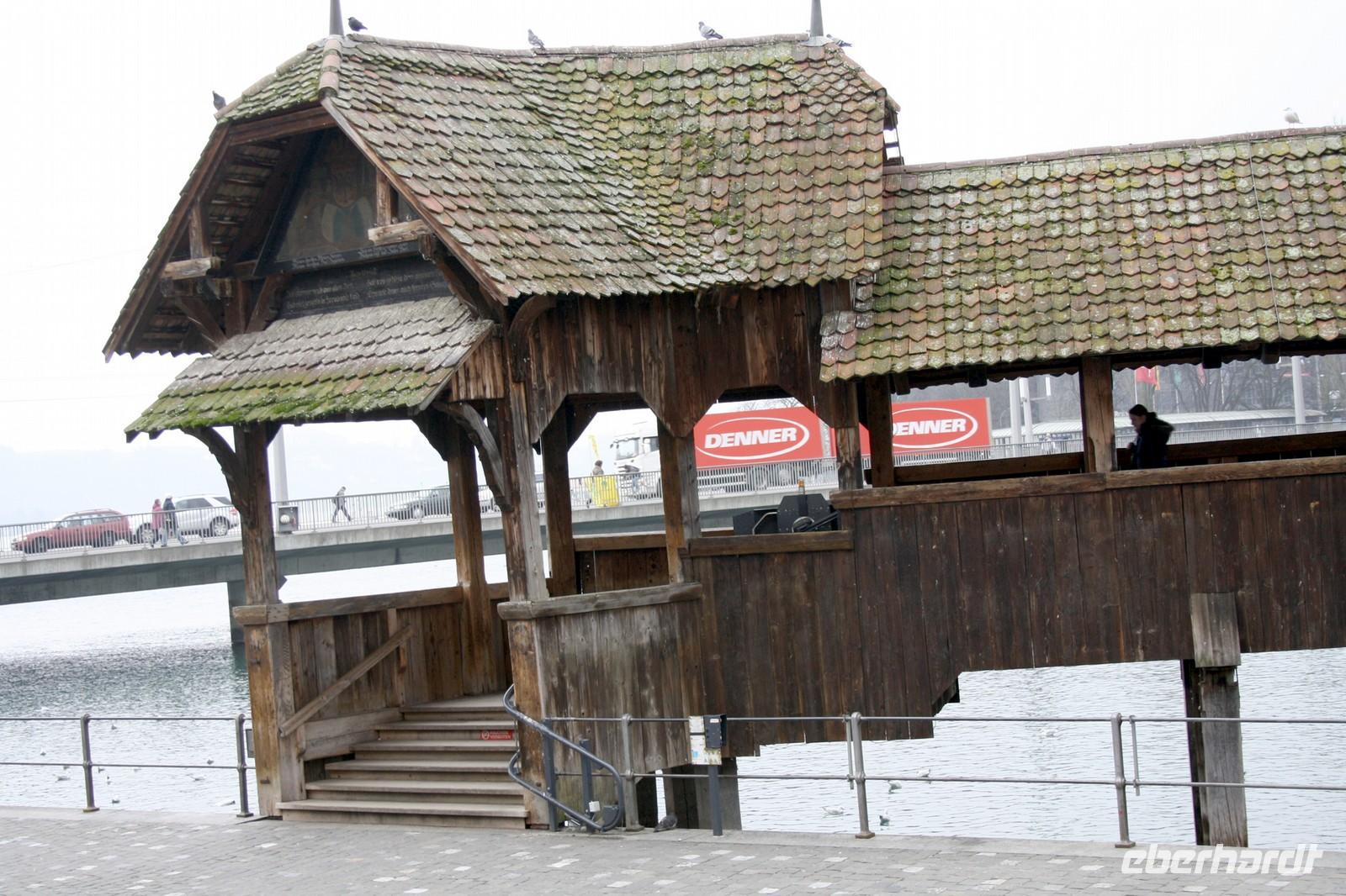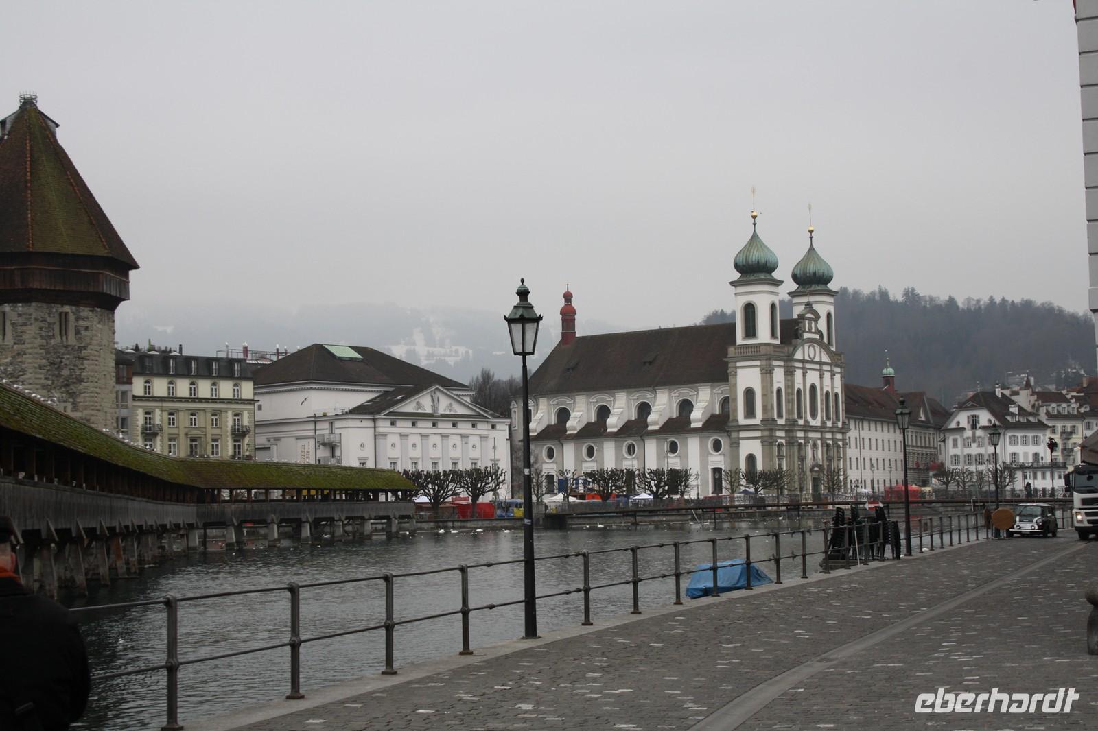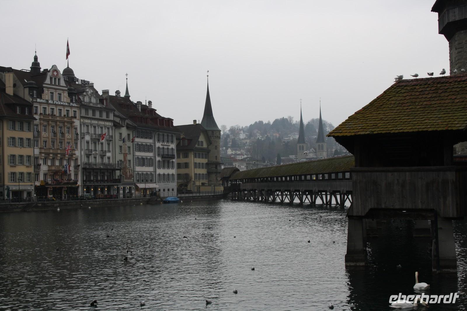 Nach der Besichtigung der Altstadt kamen wir zur Kappelbrücke, dem Wahrzeichen von Luzern. Die Brücke selbst brannte 1993 nieder und wurde nachher komplett wiederaufgebaut. Allerdings sind die bekannten Malereien innerhalb der Brücke verloren gegangen. In der Mitte der Brücke trohnt der Wasserturm.