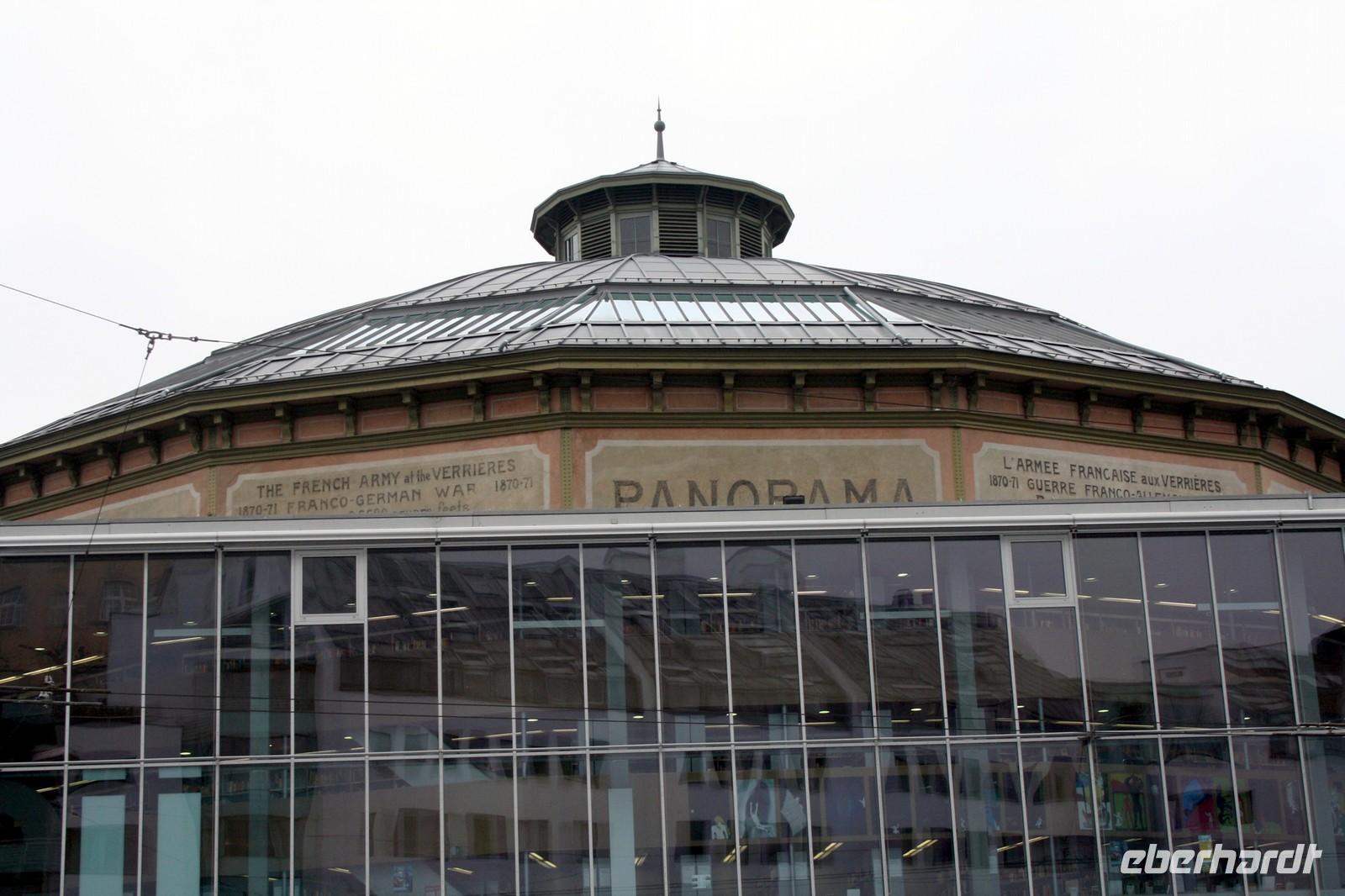 In Luzern angekommen, fuhren wir auf den Parkplatz am Inseli, ganz in der Nähe vom KKL (Kultur- und Kongresszentrum) und unsere Stadtführerin stieg in den Bus und wir fuhren zum Bourbaki-Panorama. Das ist ein Panorama-Rundbild und Museum in Luzern, ein europäisches Kulturdenkmal. Im Rundbau befindet sich das beeindruckende Riesenrundgemälde aus dem Jahre 1881. Es ist 112 Meter lang und 10 Meter hoch und zeigt die französische Armee des Generals Bourbaki bei ihrem Übertritt in die Schweiz am Ende des Deutsch-Französischen Krieges von 1870/71. Es ist eine aufwühlende Anklage des Krieges und ein Zeugnis der ersten humanitären Aktionen des Roten Kreuzes.