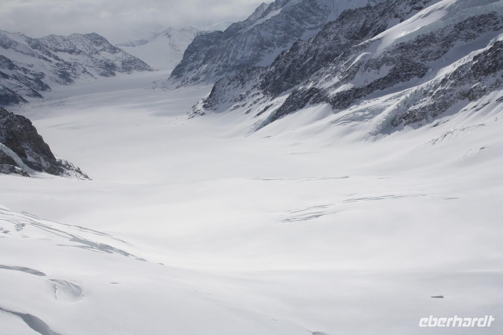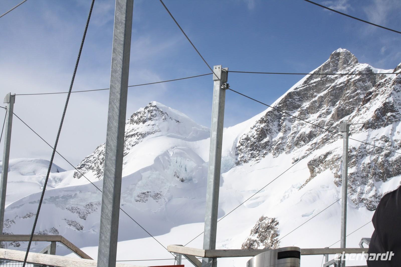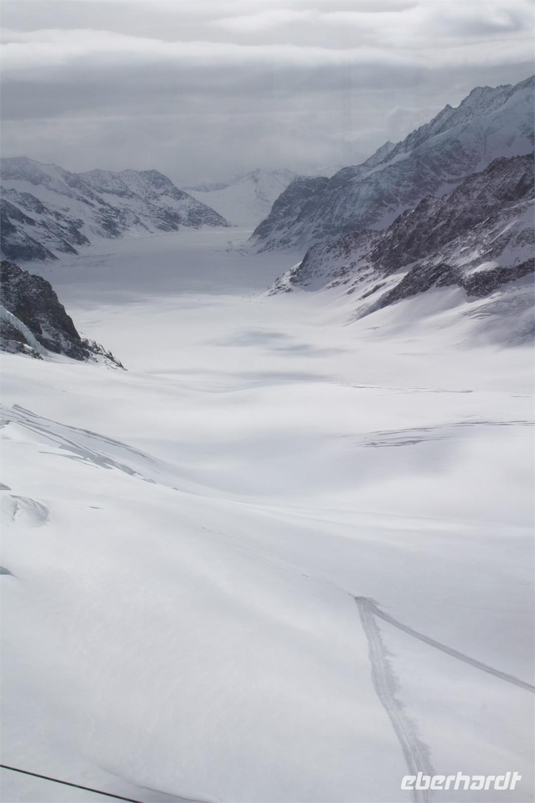Mit einem Lift fuhren wir noch einmal 100 Meter höher zur Sphinx-Terasse. Bei herrlichstem Sonnenschein erschloss sich uns von hier eine Welt aus Eis und Schnee, angefangen mit dem herrlichen Ausblick auf den Aletschgletscher. Auf dem Plateau fegte der eisige Wind um unsere Ohren. Lange konnten wir uns