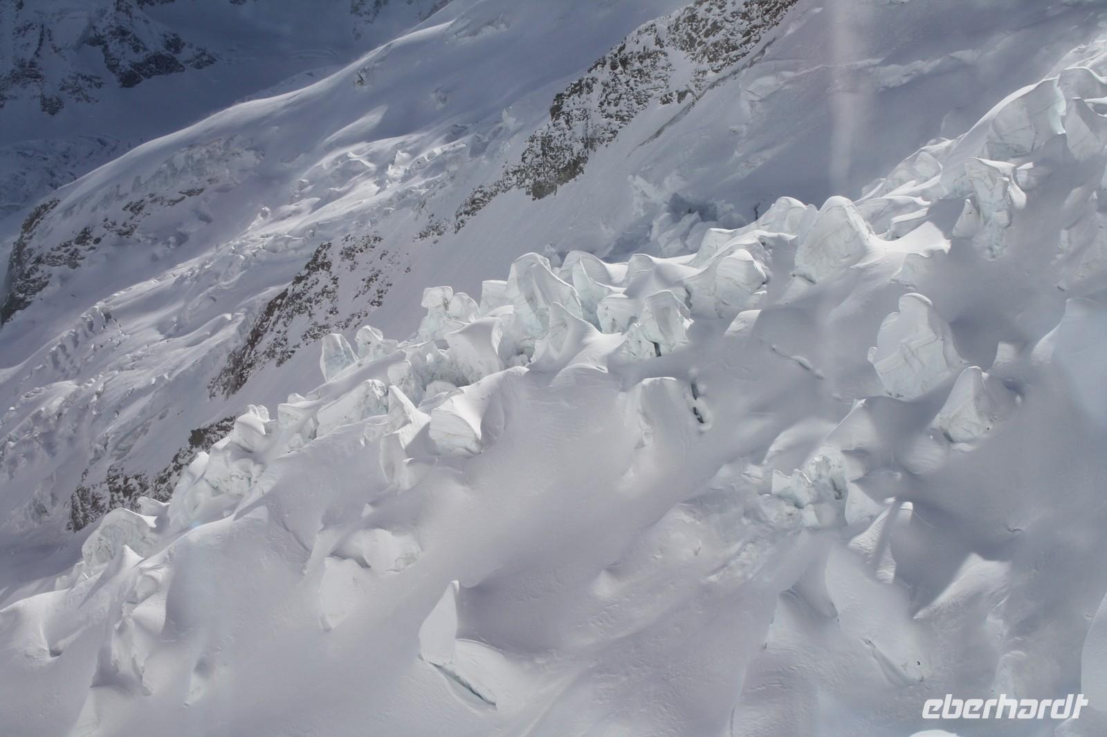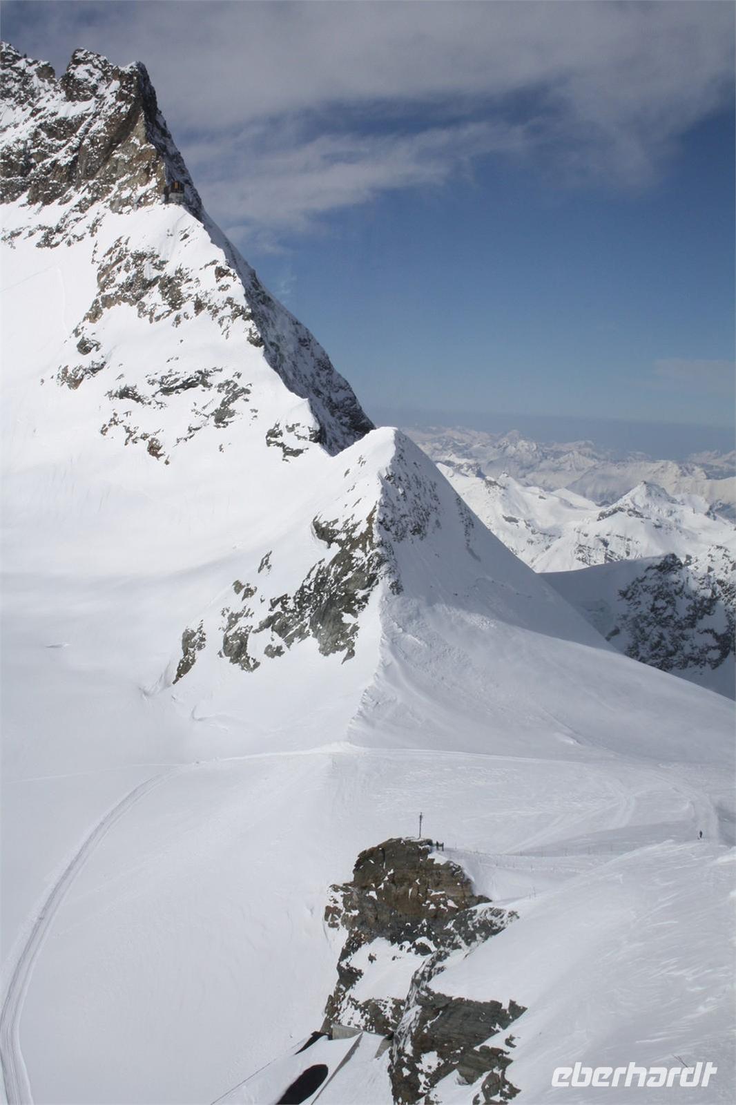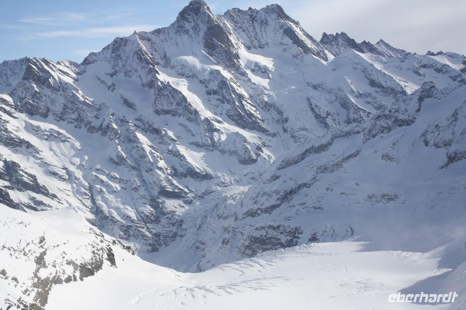 Mit einem Lift fuhren wir noch einmal 100 Meter höher zur Sphinx-Terasse. Bei herrlichstem Sonnenschein erschloss sich uns von hier eine Welt aus Eis und Schnee, angefangen mit dem herrlichen Ausblick auf den Aletschgletscher. Auf dem Plateau fegte der eisige Wind um unsere Ohren. Lange konnten wir uns