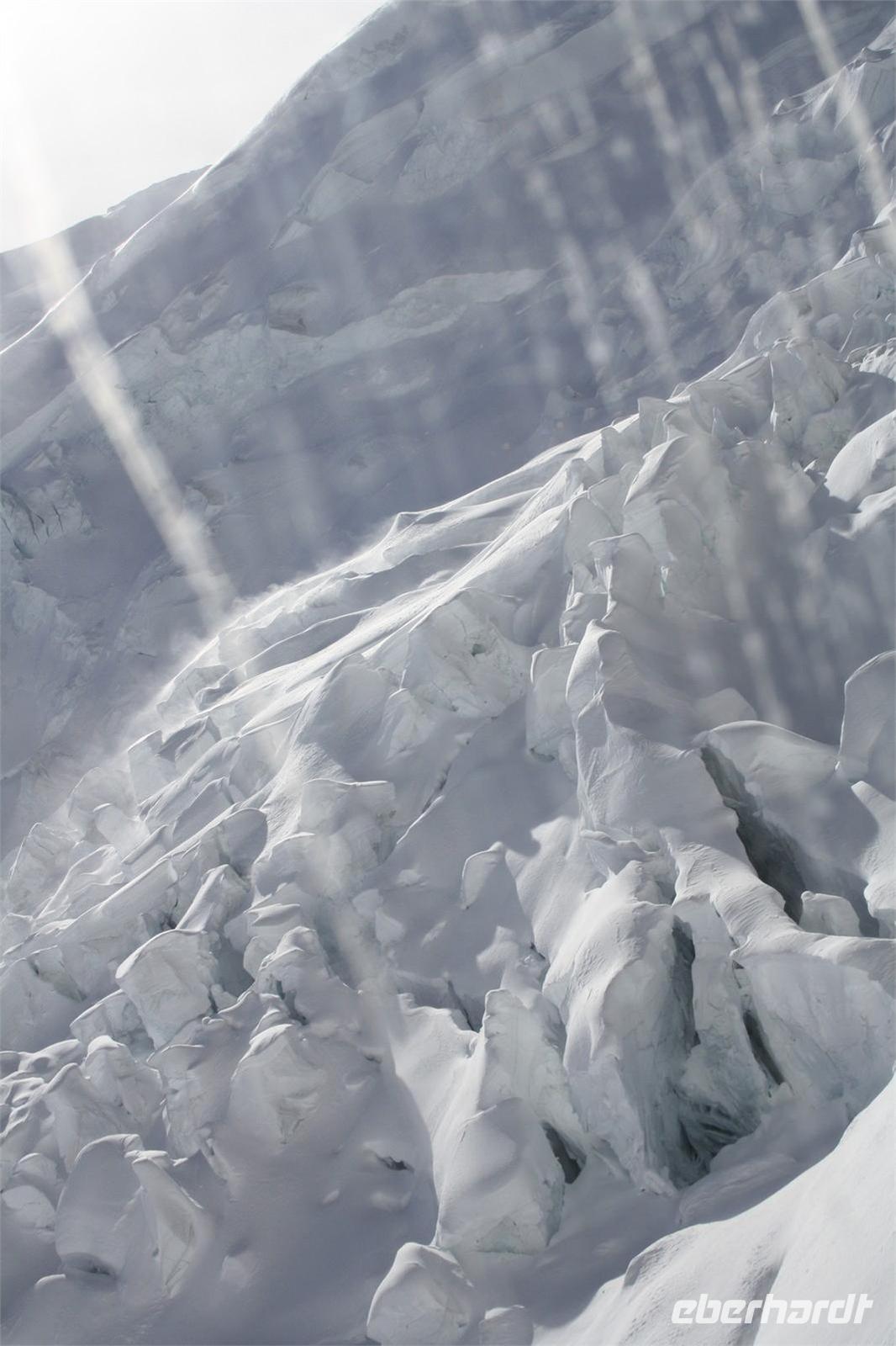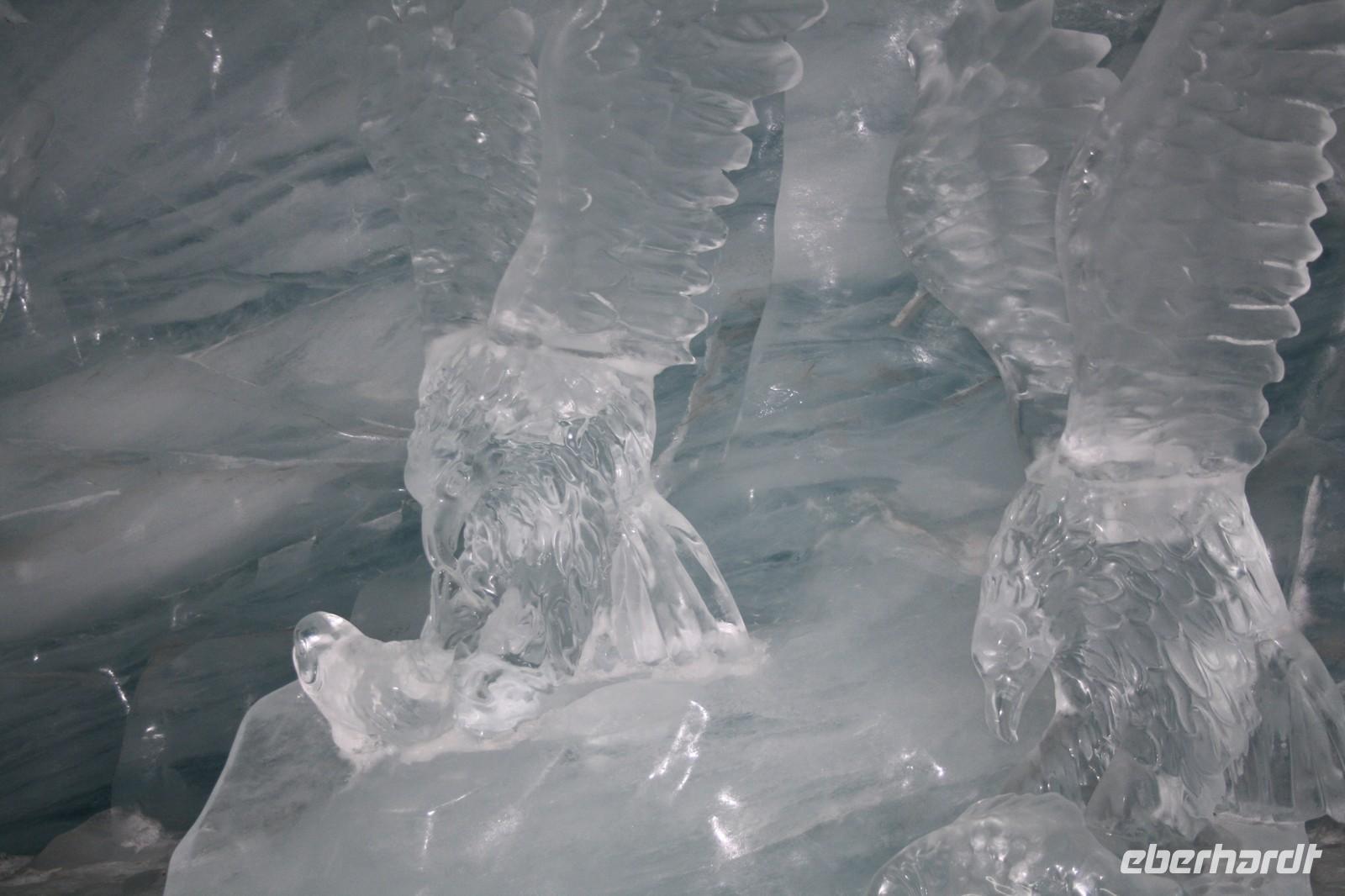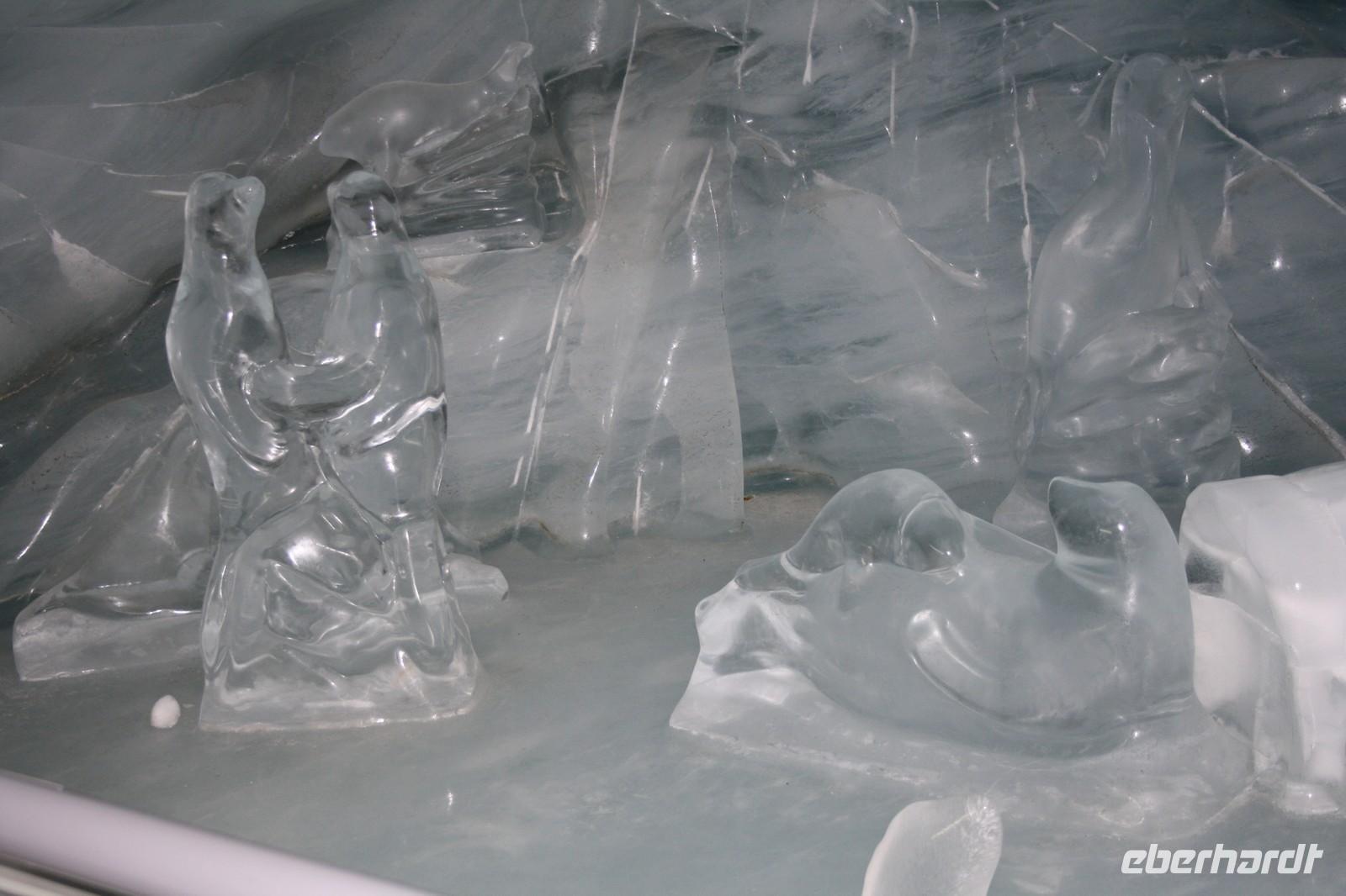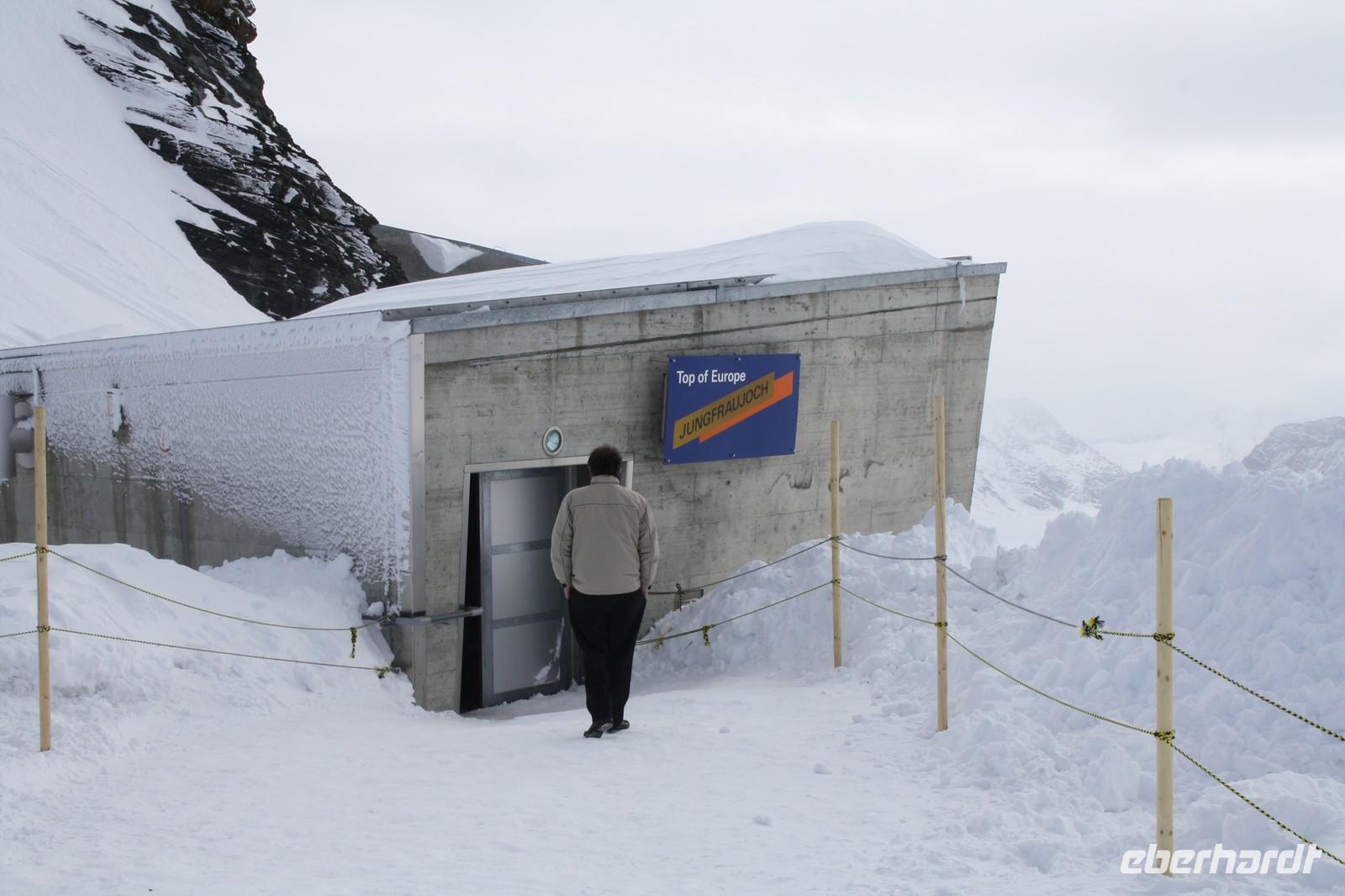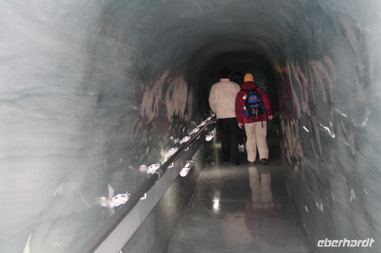 Im Eispalast befanden wir uns 20 Meter unter dem Aussichtsplateau, an der Wasserscheide Europas. Dort türmen sich die Eismassen, die langsam Richtung Norden wandern und deren Wasser einmal in die Nordsee fließen wird. Vor uns öffneten sich lange Gänge höhlenartig, weiten sich zu Räumen und Hallen. In Nischen tauchten die ersten Eisskulpturen auf, bläulich schimmert eine ewige Welt aus Eis. Wieder oben angekommen, verriet uns ein Blick nach draußen, dass wieder Wolken und Nebel aufzogen und keine Sicht mehr war. Außerdem befinden sich im Berghaus Jungfraujoch verschiedene Restaurants, die höchstgelegene Poststelle Europas.