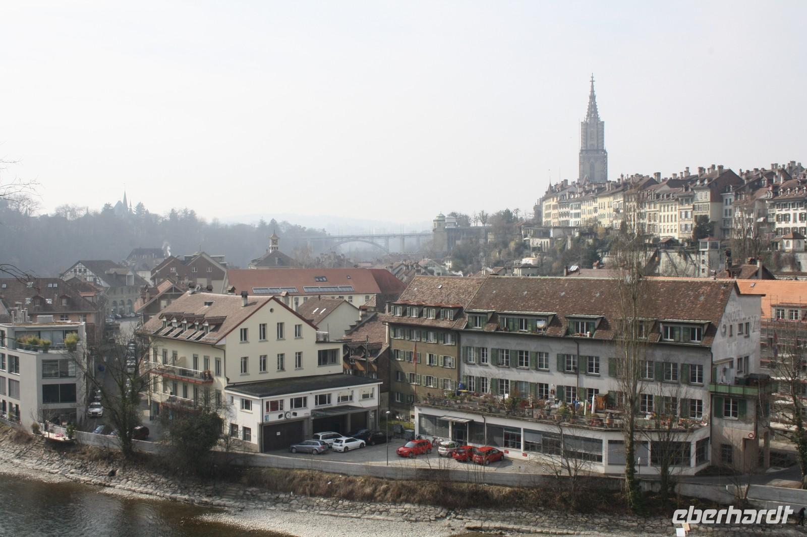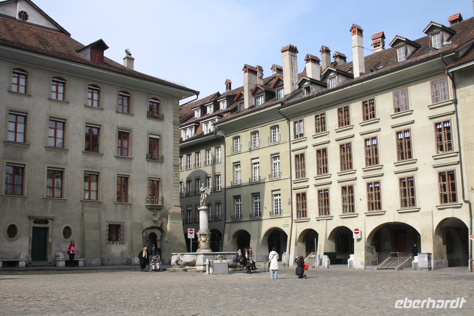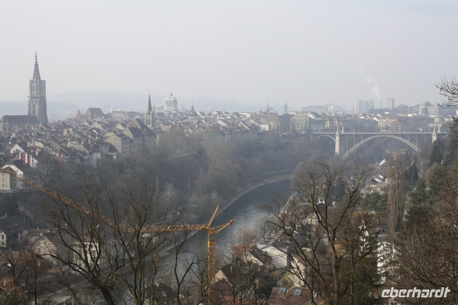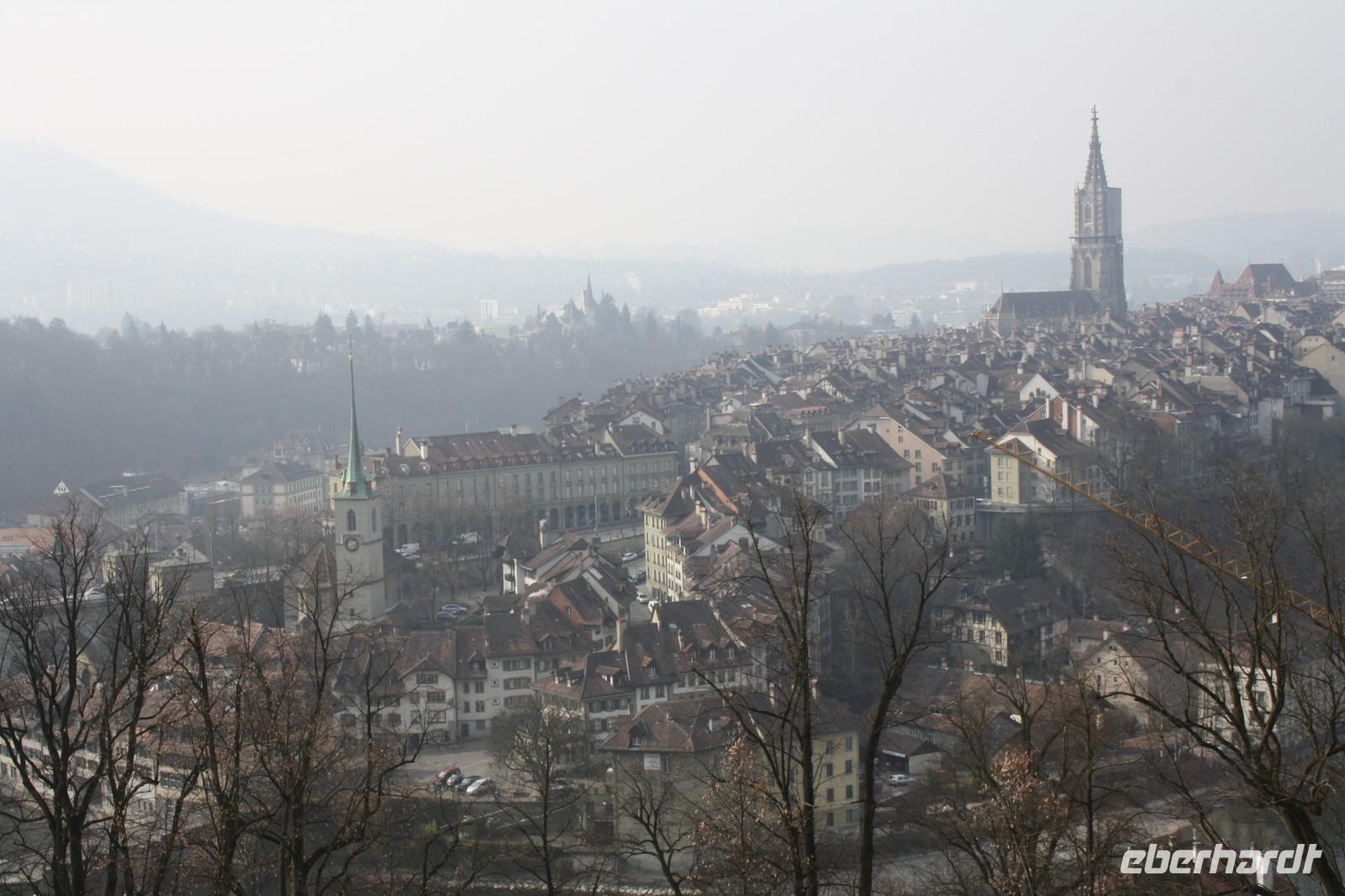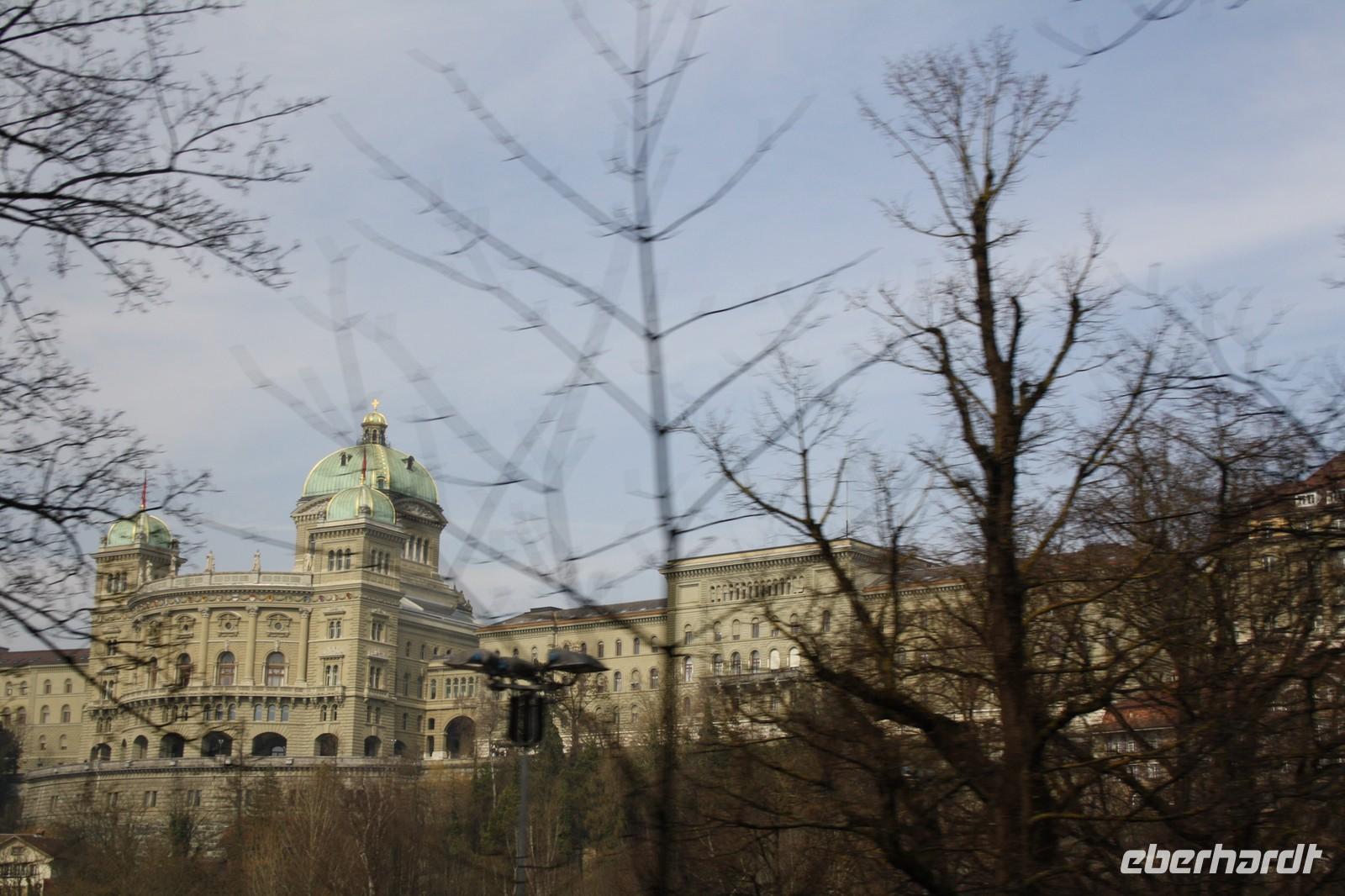 Mit dem Bus ging die Fahrt durch die Stadt weiter, vorbei am Bundeshaus. Im westlichen Teil des Bundesplatzes befindet sich ein Wasserspiel aus 26 Wasserfontänen, welche die 26 Kantone und Halbkantone der Schweizerischen Eidgenossenschaft symbolisieren, aber im Winter sind sie abgestellt. Die Fahrt ging weiter am Kornhaus vorbei, das ein ehemaliges Getreidelager war und heute ein Kulturzentrum ist. Das im neoklassizistischen Stil erbaute Stadttheater von Bern beherbergt eine Dreispartenbühne. Weiter ging es an der eidgenössischen Münzstätte vorbei.