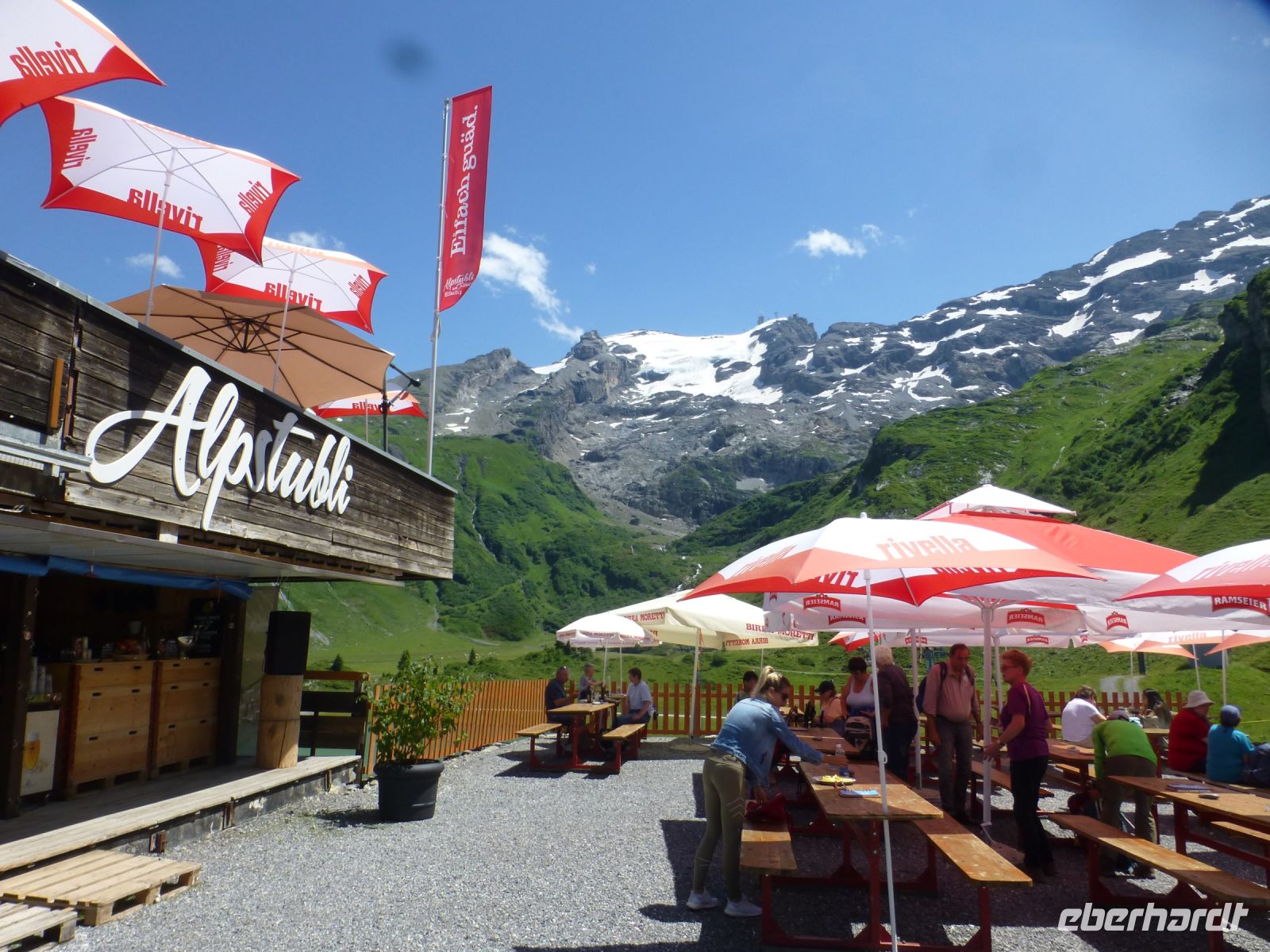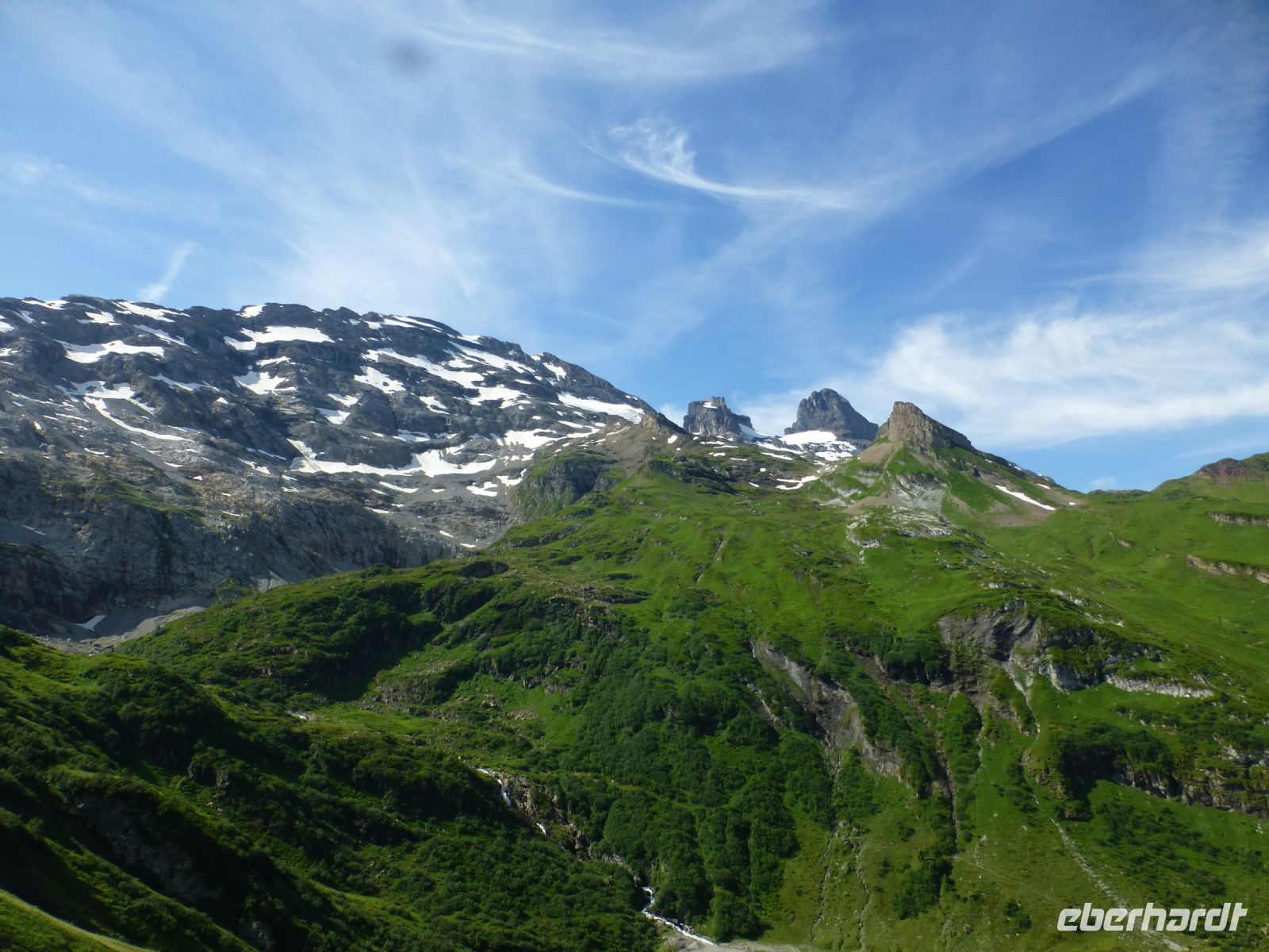 Vorbei am Zürichsee, durch das Steuerparadies Zug gelangen wir in den Kanton Luzern. Und werden über ein raffiniertes Tunnelsystem an Luzern und dem Vierwaldstättersee vorbeigeführt. Fast könnte man meinen „gucken verboten“, doch wir haben ja noch so viel zu schauen in den nächsten Tagen. Der Tunnel spuckt uns wieder aus, einmal rechts rum nach Engelberg und dann fahren wir durch sattes Grün, an den Hängen fällt regelrecht das Wasser zu Tal, die Talseiten werden steiler. In Kehren windet sich die Straße nach oben. Nach einer so langen Fahrzeit meistert Jan und sein Begleitteam – das sind wir – auch das. Und wir staunen schon, als wir nach dieser Straße, auf der wir recht alleine unterwegs sind, nach Engelberg kommen. Ein Städtchen mit Bahnanschluss, umgeben von Bergen, einer schöner als der andere. Herr Barmetlter, der Hotelinhaber des Schweizer Hof, nimmt uns in Empfang, die Schlüssel sind schon vorbereitet, alles geht ganz schnell. Jeder verschwindet aufs Zimmer, um um 19 Uhr zum Essen zu erscheinen. Quirlige Unterhaltung erfüllt die Stube. Die Gäste aus Berlin, die mit dem Zug gekommen sind, stoßen zu uns. Die Gruppe ist komplett, die Strapazen der Anfahrt liegen hinter uns. Jetzt beginnt der Urlaub und mit Zürcher Geschnetzeltem kann man es wohl angehen lassen.