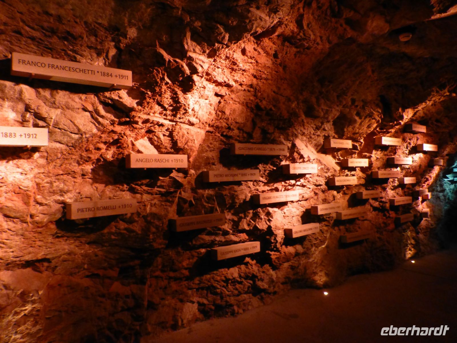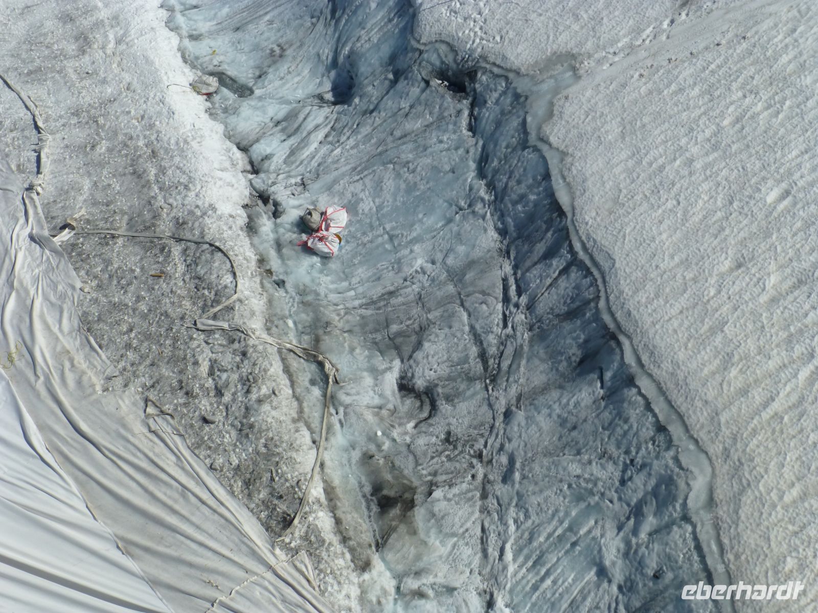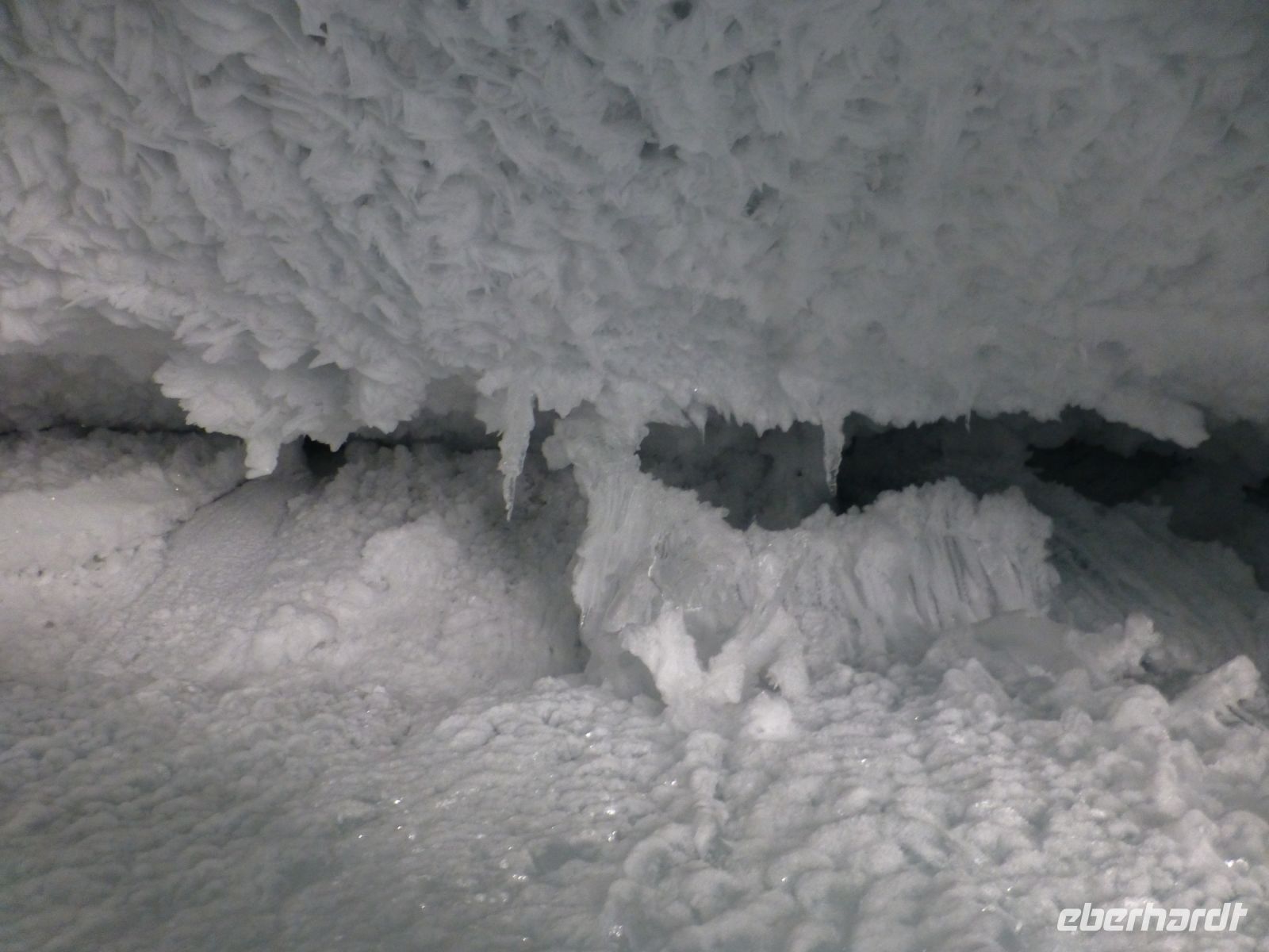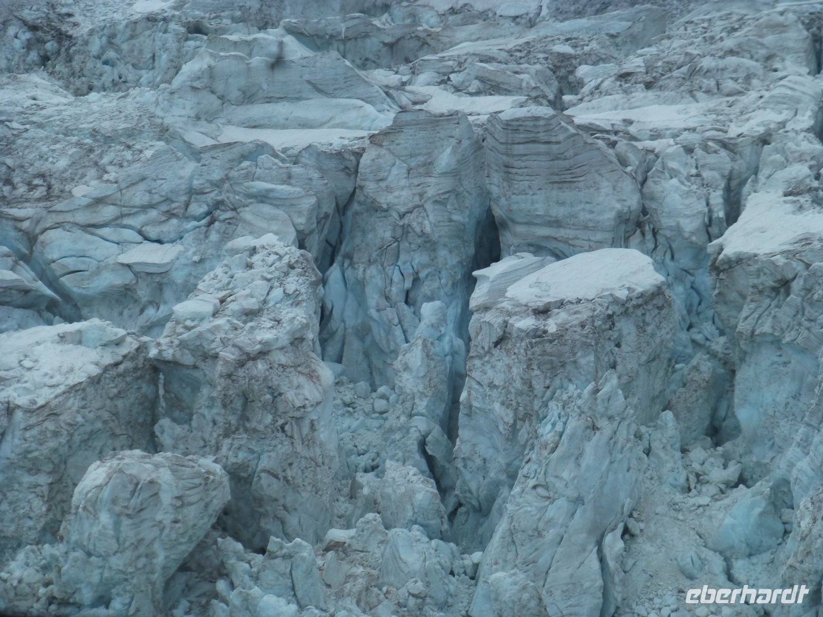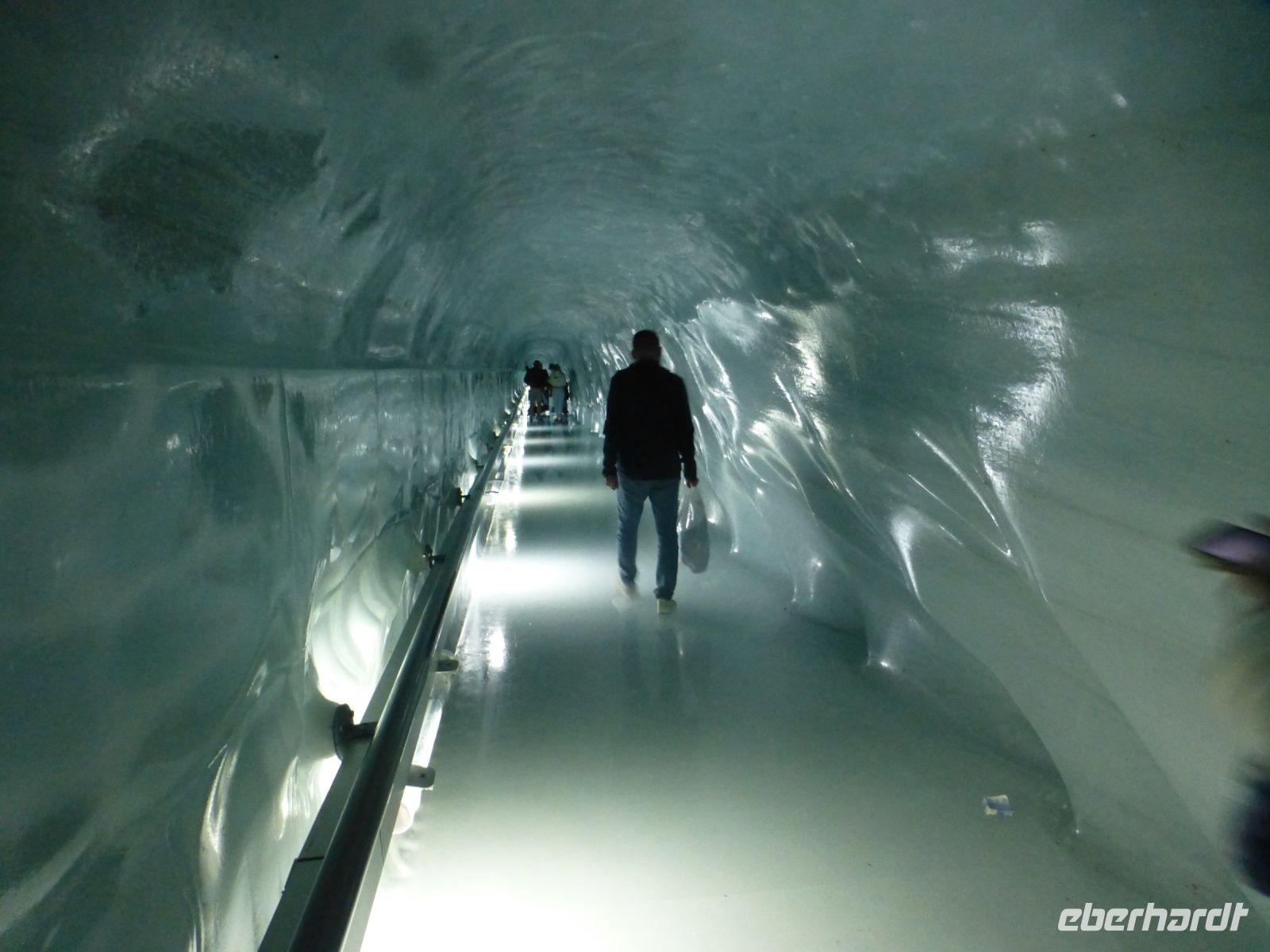 Der Gletscher-Palast ist sehr sehenswert und viele Tafeln informieren über den Gletscher, wie er entsteht, wie er sich bewegt. Eine Gletscherspalte kann man sich anschauen und friert beim Anblick noch ein bisschen mehr. Hier unten bewegen wir uns in Tunneln aus Jahrhunderte altem Eis, frieren und oben schmilzt der Gletscher.