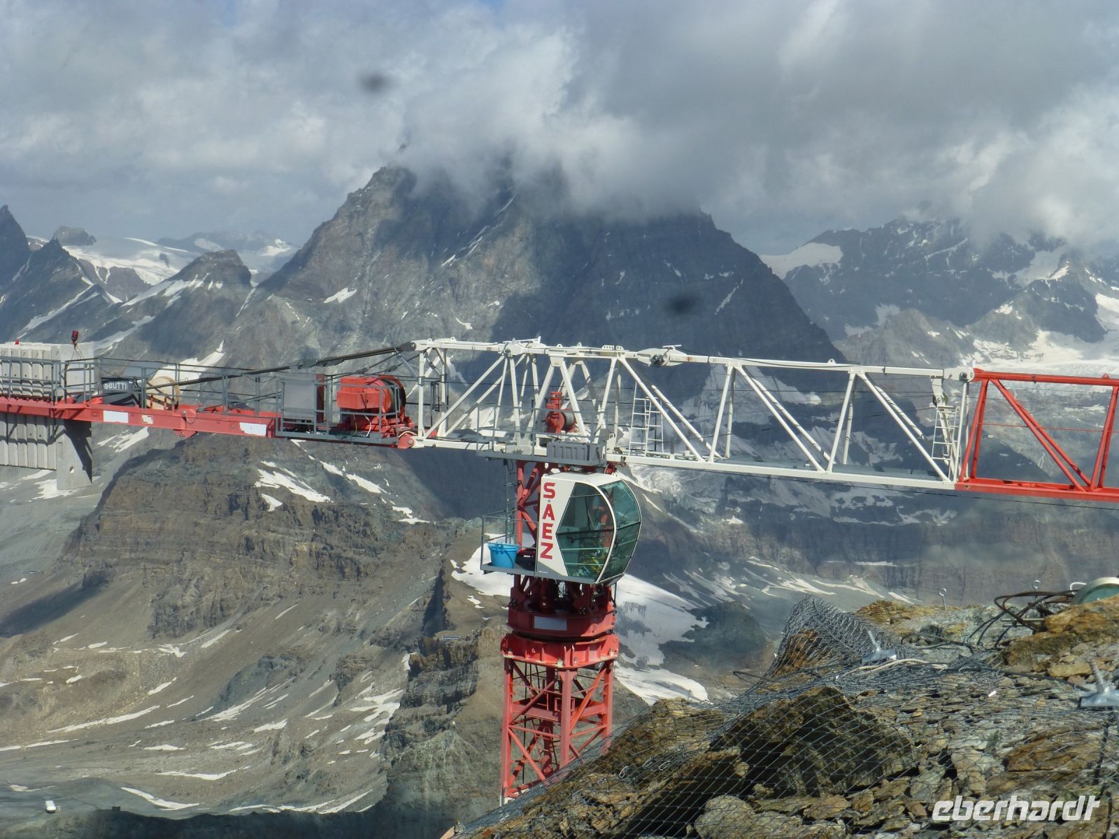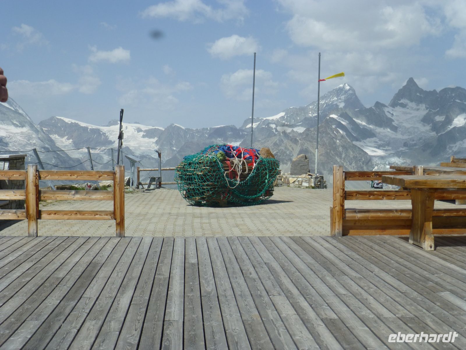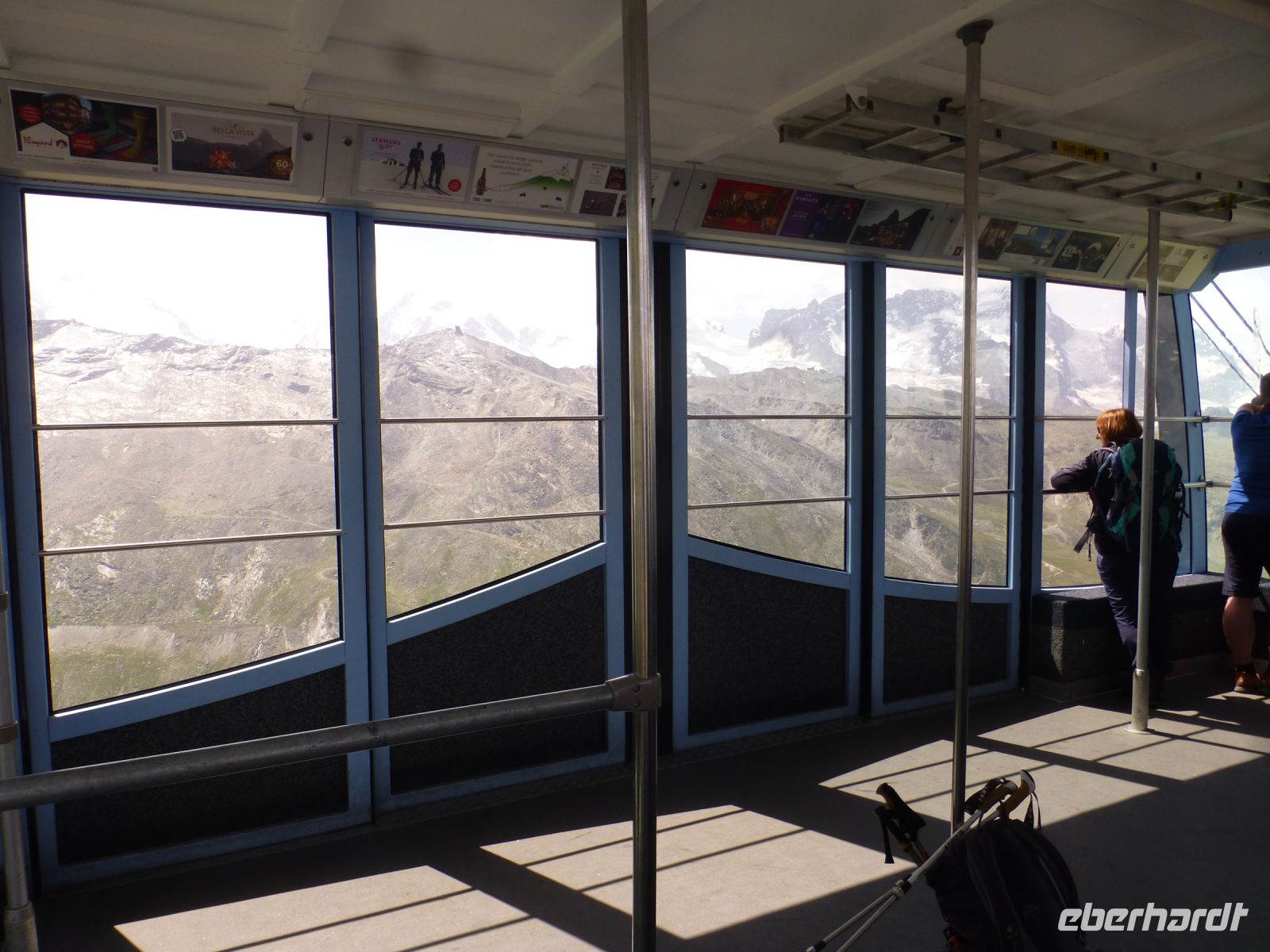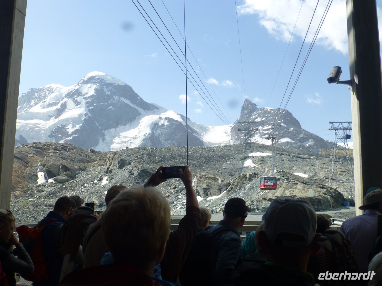 Dann geht es mit der großen Gondel aufs Kleine Matterhorn. Wir überqueren einen Gletscher, schauen in Gletscherspalten, auf Moränen und erfahren von einem erfahrenen Gast, dass der Gletscher vor fünf Jahren bis zur Station reichte. Jetzt fehlen etliche Meter. Diese Wunderwelt aus Bergen, Gletscher, reißenden Bächen und Wasserfällen bestaunen wir nun jeden Tag und es immer wieder aufs Neue schön und faszinierend. Vom Ausguck des Berges schauen wir aufs Breithorn, auf dem sich wie auf einer Ameisenstraße die Seilschaften nach oben und unten in einem Kreis bewegen. Das Matterhorn zeigt die Spitze immer wieder in Wolken, doch es gibt ja so viel anderes zu gucken. Mit uns sind drei Zollbeamte hochgefahren. Mit dem neuen Lift, der von Italien hier herauffährt, haben die drei Männer nun einen neuen Arbeitsplatz in luftiger Höhe.