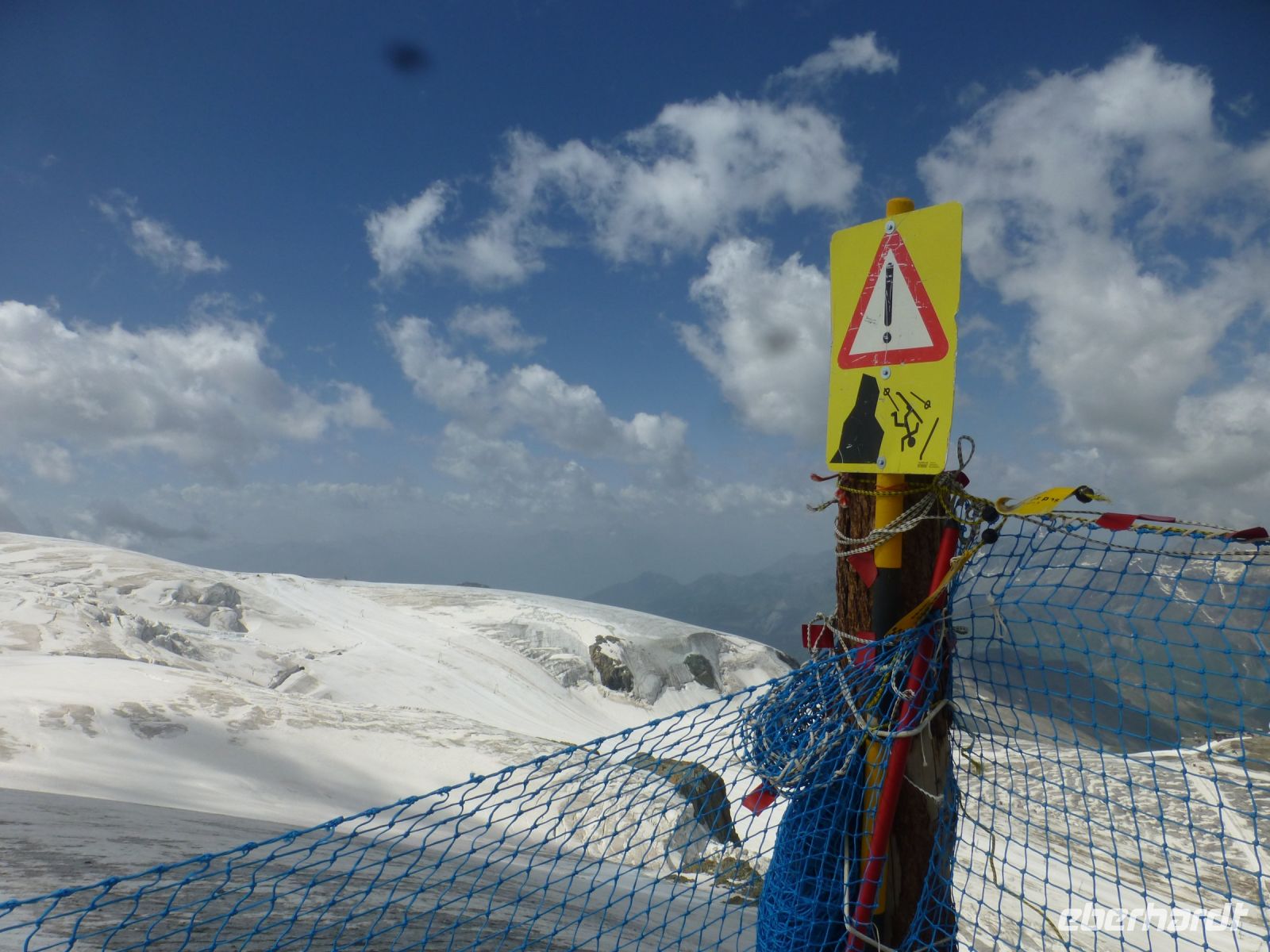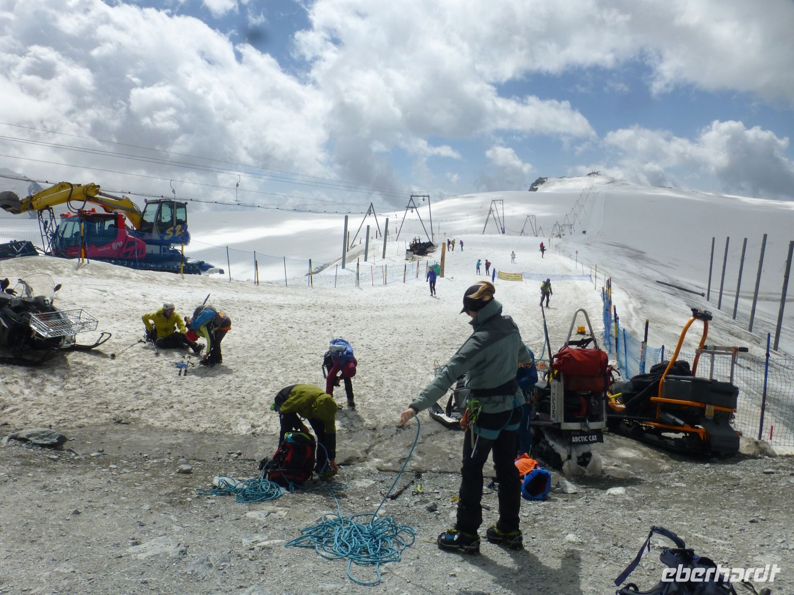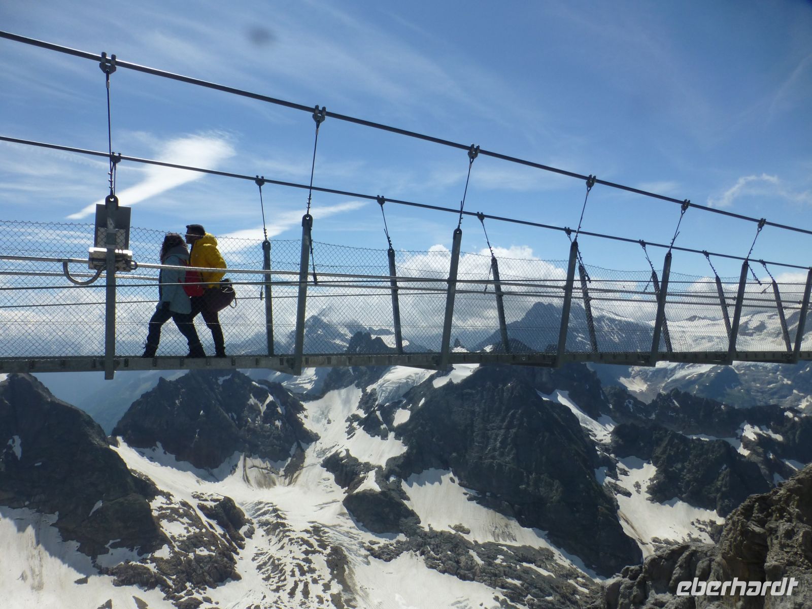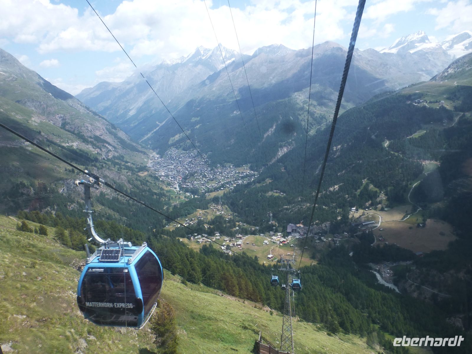 Dann geht es mit der großen Gondel aufs Kleine Matterhorn. Wir überqueren einen Gletscher, schauen in Gletscherspalten, auf Moränen und erfahren von einem erfahrenen Gast, dass der Gletscher vor fünf Jahren bis zur Station reichte. Jetzt fehlen etliche Meter. Diese Wunderwelt aus Bergen, Gletscher, reißenden Bächen und Wasserfällen bestaunen wir nun jeden Tag und es immer wieder aufs Neue schön und faszinierend. Vom Ausguck des Berges schauen wir aufs Breithorn, auf dem sich wie auf einer Ameisenstraße die Seilschaften nach oben und unten in einem Kreis bewegen. Das Matterhorn zeigt die Spitze immer wieder in Wolken, doch es gibt ja so viel anderes zu gucken. Mit uns sind drei Zollbeamte hochgefahren. Mit dem neuen Lift, der von Italien hier herauffährt, haben die drei Männer nun einen neuen Arbeitsplatz in luftiger Höhe.