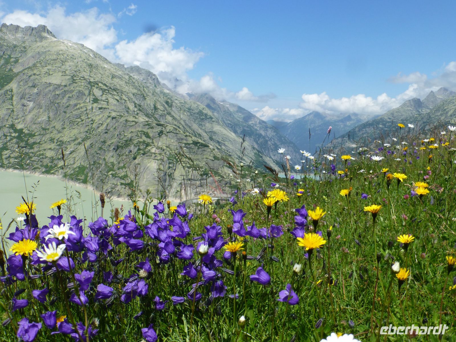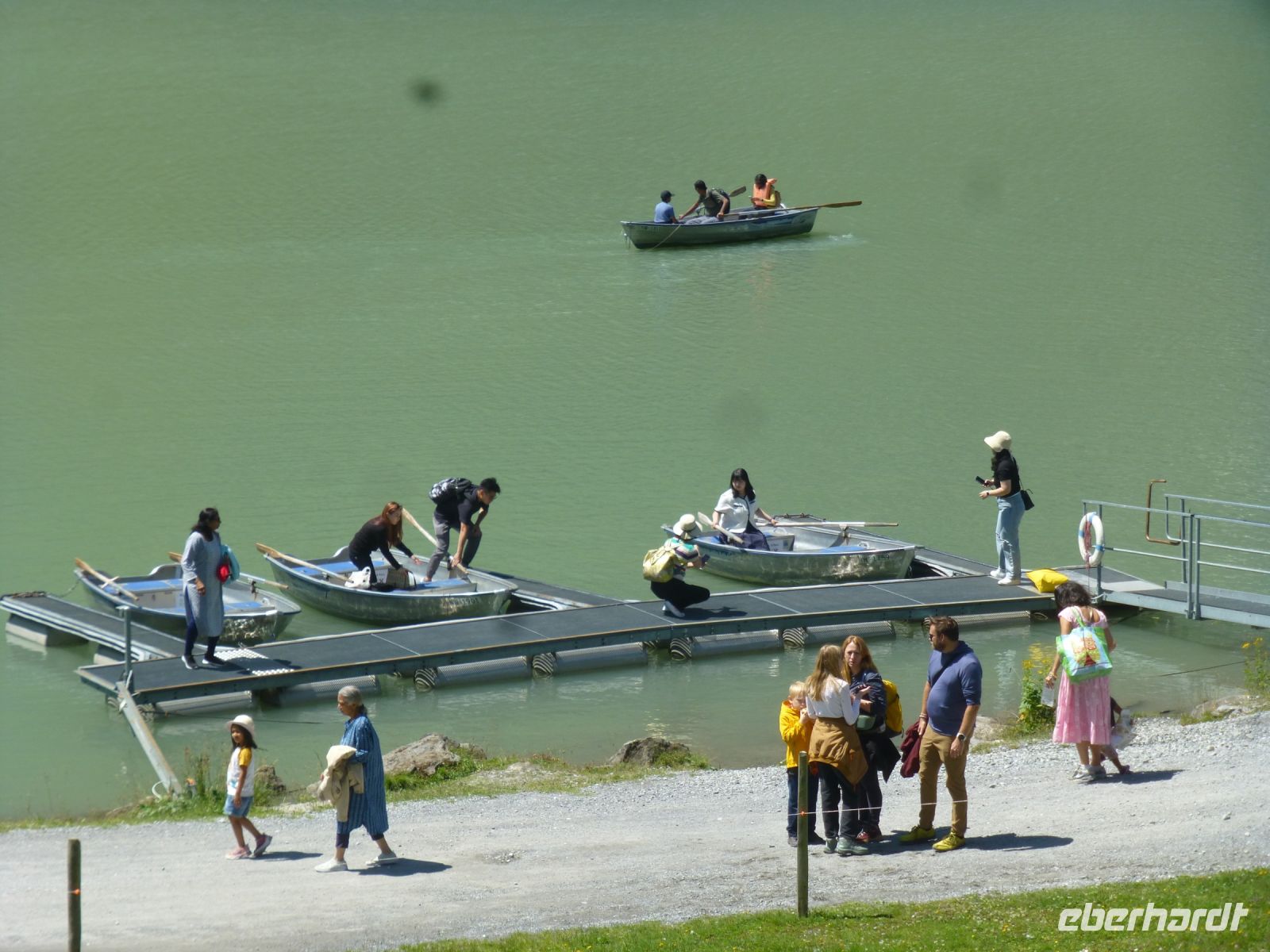 Wir umrunden den See. Kleine Tafel erläutern die Blumen entlang unseres Weges. Auf dem See fahren Ruderboote, die Bergwelt um uns ist eine Kulisse, an der man sich nicht satt sehen kann. Der See wird vom Gletscher gespeist, in der Ferne ergießt sich ein Wasserfall. So viel Wasser von einem Gletscher, der keinen Zufluss hat, sondern nur aus ewigem Eis besteht.