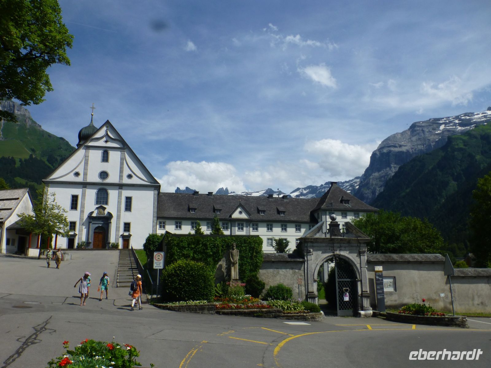 Eine Pause mit Eis, Kuchen oder Flammkuchen am Alpstubli, dann fahren wir mit der Gondel wieder zurück nach Engelberg. Runter zu scheint es steiler zu sein als nach oben. Der Ort kommt näher und näher. Nochmal das Kloster von oben, bevor wir dorthin laufen. Unten angekommen, weist uns das Flüßchen Aa den Weg zum Kloster. Das Bachbett ist gut gefüllt, es rauscht mächtig. Ebenso mächtig ist die Klosteranlage. 1120 ist es gegründet worden, wurde groß. Nach einem Brand 1729 wurde es barock wieder aufgebaut. Die Kirche ist hell und licht, Maria Himmelfahrt als Altarbild. Das Motiv passt zu unserem heutigen Tag sehr gut.