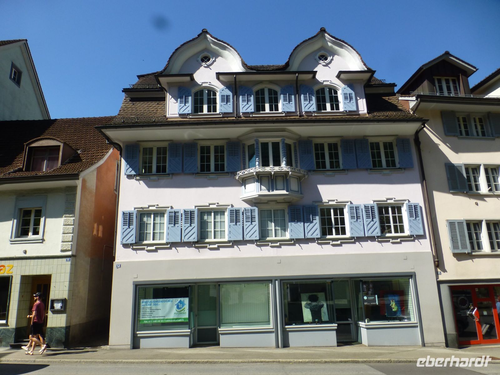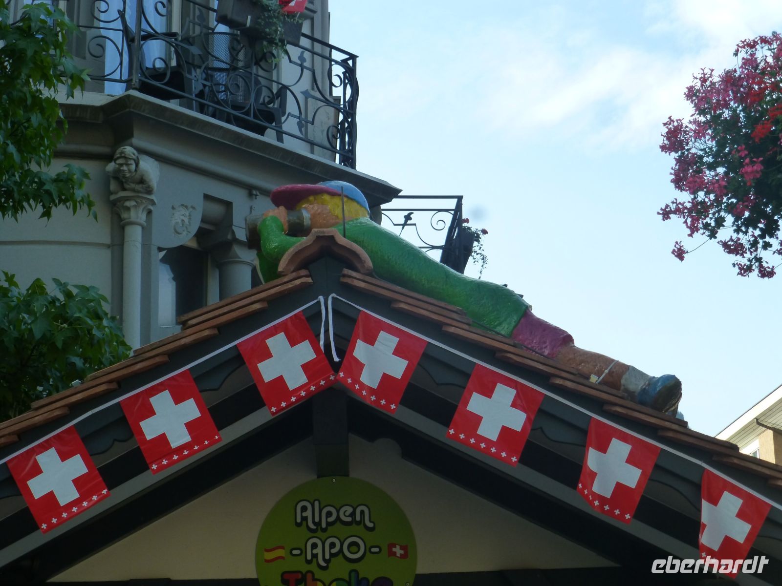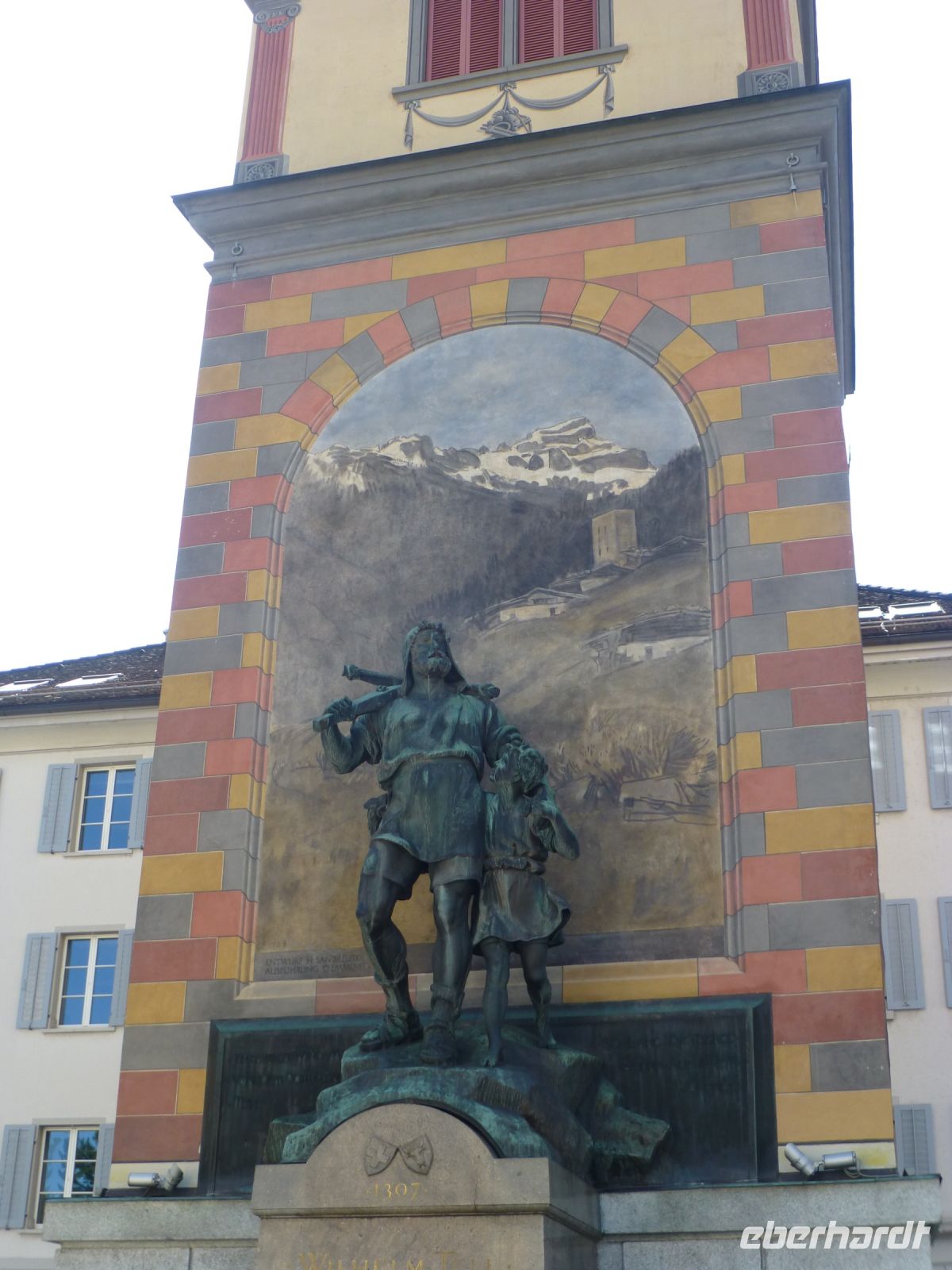 In Altdorf kommen wir in den Verkehr, des Samstagsvormittageinkaufs. Das würden wir zu Hause wohl auch so machen, wenn wir nicht auf Reisen wären. Ganz entspannt sind wir, im kühlen Bus. Das Wilhelm-Tell-Denkmal schauen wir uns an, klettern auf den Uhrenturm und bekommen über ein Tonband Auskunft über den Ort und die nahegelegenen Häuser. Altdorf hat vom Gotthardpass sehr profitiert, denn als Anfangs- bzw. Endpunkt hatte es eine politische und wirtschaftliche Bedeutung.