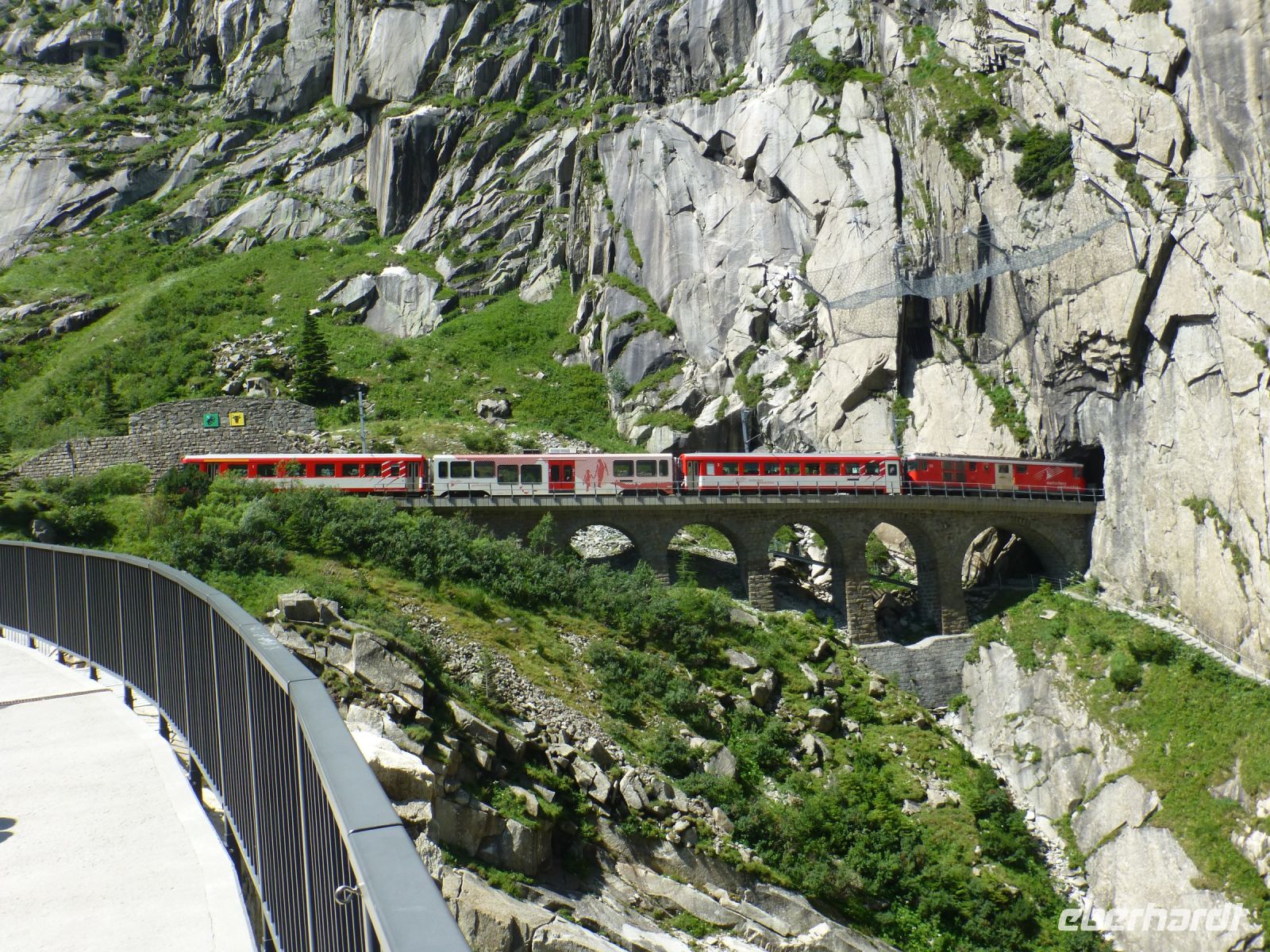 Die Teufelsbrücke kommt dann ganz unvermittelt. Diese Stelle wurde erst 1230 über eine Brücke passierbar. Steile Wände links und rechts, wo da einen Übergang schaffen? Der Teufel hat geholfen, laut Legende. Doch heute bekommen wir den Eindruck, die Schweizer sind überhaupt mit dem Teufel im Bund. Denn durch das ganze Tal verweben sich Autobahn, Eisenbahn, die alte Passstraße und Wanderwege. Auf dem Weg vom Gotthard zum Nufenen weiten sich die Kurven in die Landschaft, gehalten nur von leichten Stützen. Es sieht aus wie ein Autokarussell.