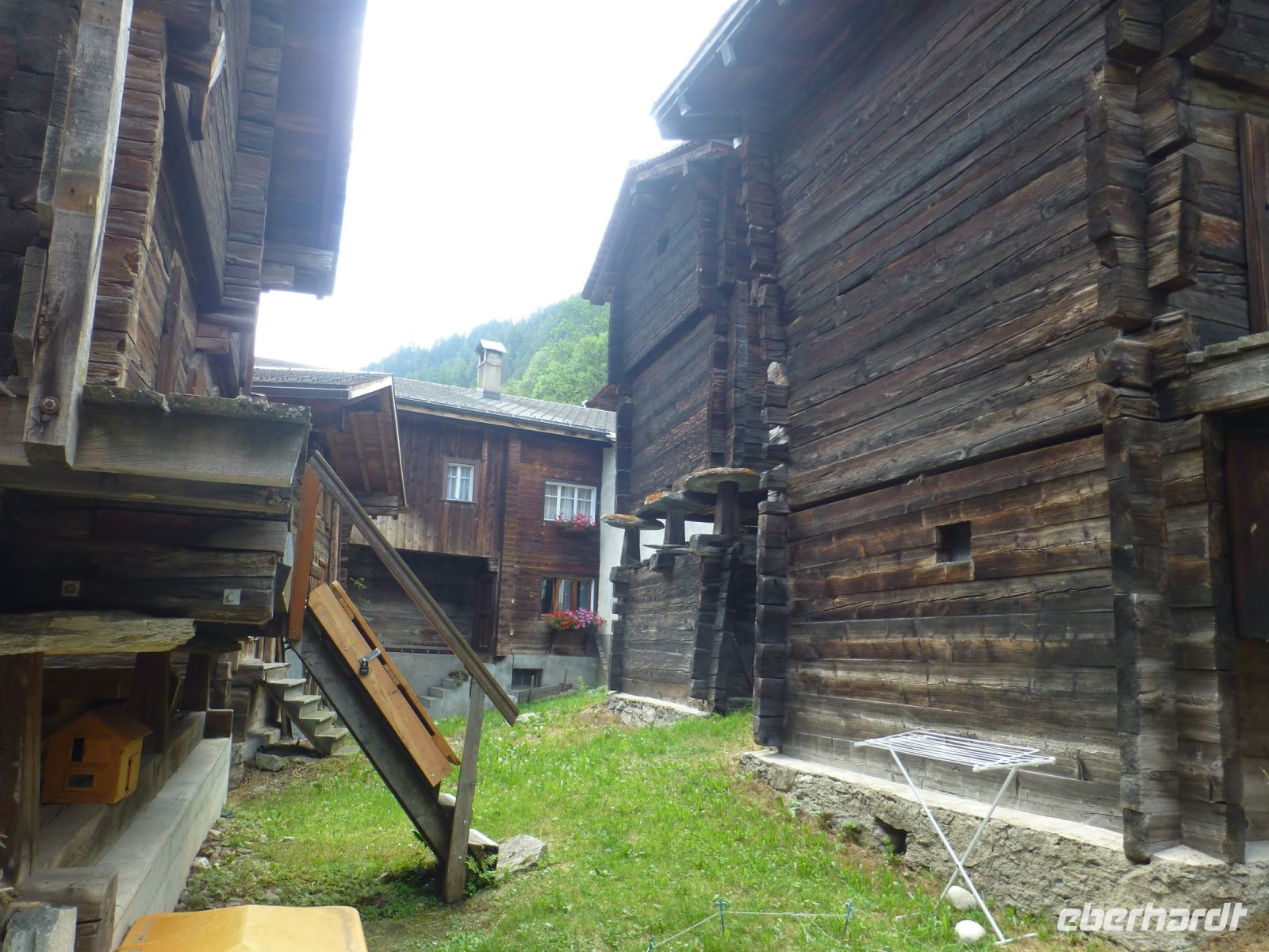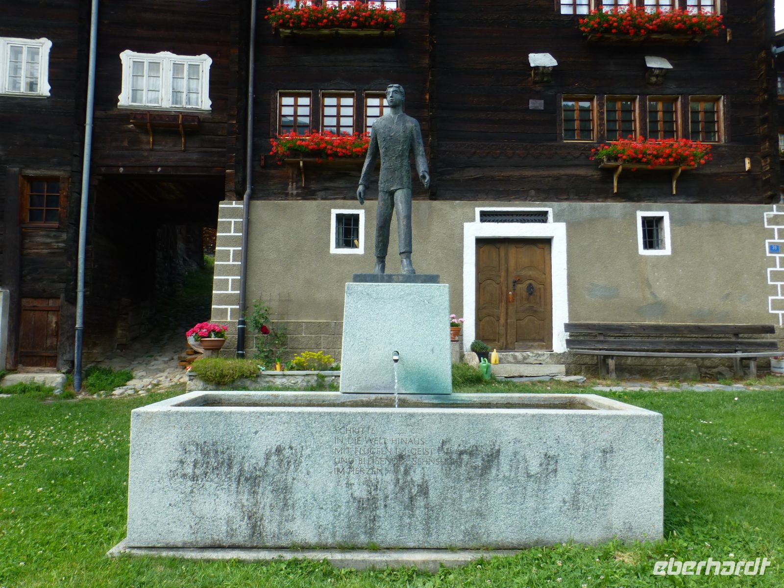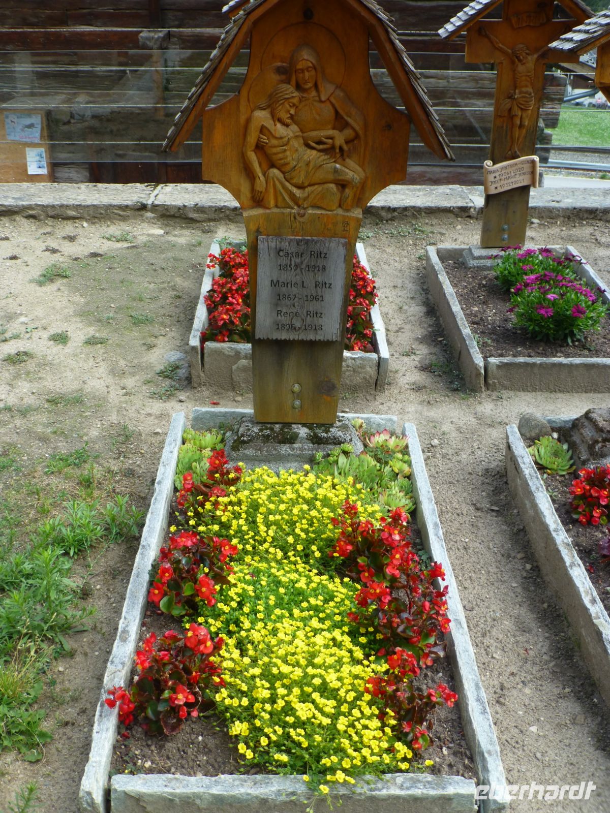 Wir kommen ins Gomstal, durch das die Rhone fließt. Die Orte wirken wie Museumsdörfer. Die Holzhäuser im Walliser Stil mit Blumenkästen geschmückt. Die Schober auf Stelzen, Steinteller schützen das eingelagerte Gut vor hungrigen Nagern. Wir steigen in Niederwald aus, wo César Ritz geboren worden ist. Im Ort bescheinigte man ihm, dass er es aufgrund seiner Faulheit zu nichts bringen würde. Doch er hatte den richtigen Riecher, dann die richtigen Kontakte und eine große Portion an Zutrauen, um ein Luxushotel nach dem anderen nach seinen Vorstellungen zu eröffnen – mit eigenem Badezimmer, Beleuchtung und ausgesuchtem Mobiliar. Er liegt auf dem kleinen Friedhof mit seiner Familie begraben. Ein Grab, das sich nicht hervortut und in Reihe mit den anderen liegt.