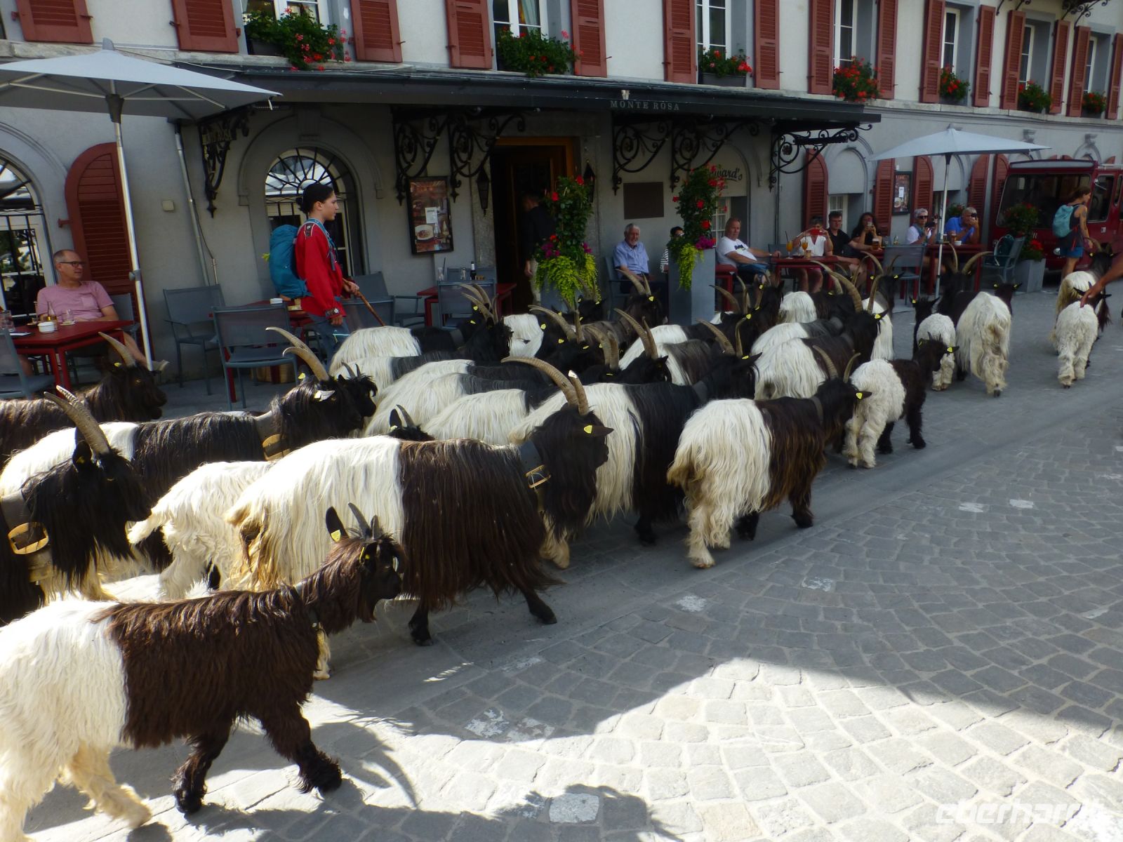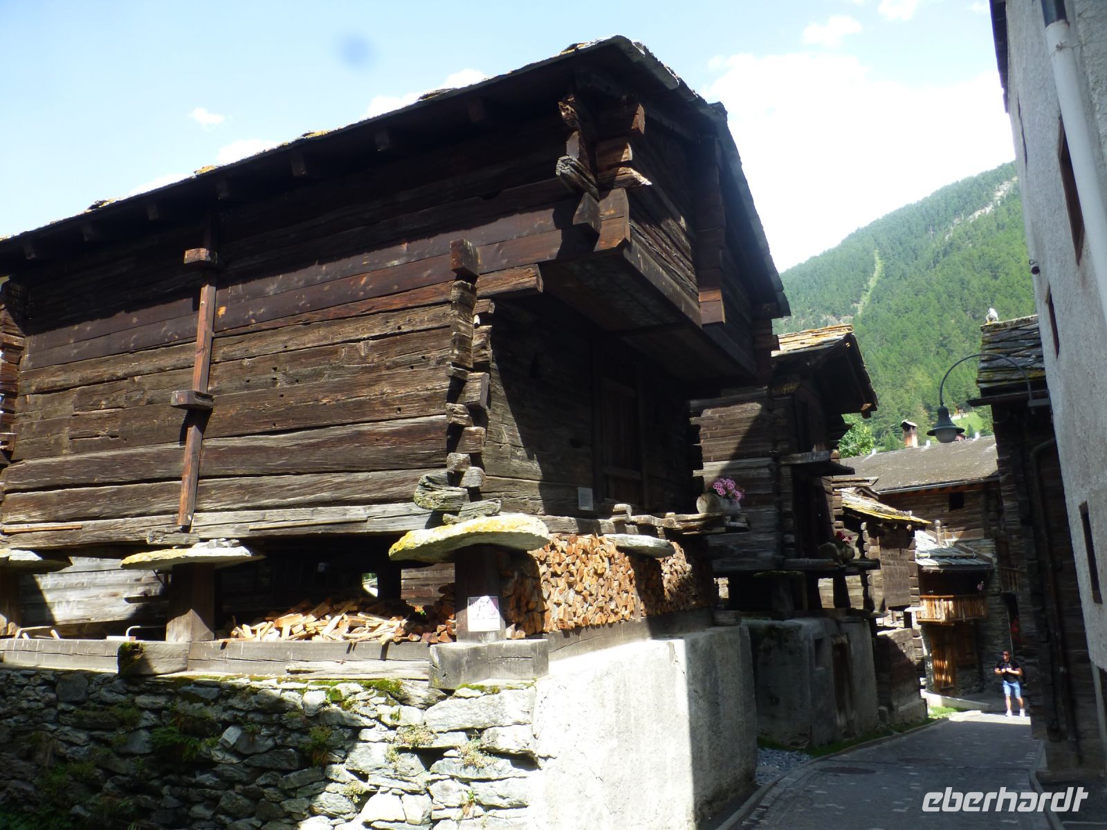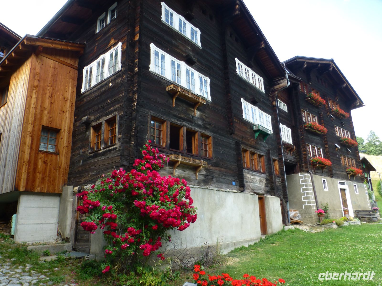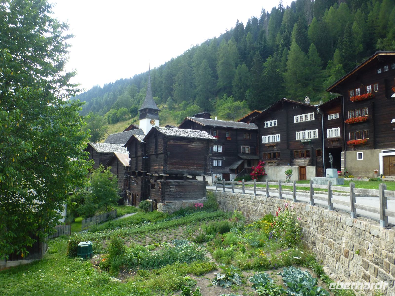 Wir kommen ins Gomstal, durch das die Rhone fließt. Die Orte wirken wie Museumsdörfer. Die Holzhäuser im Walliser Stil mit Blumenkästen geschmückt. Die Schober auf Stelzen, Steinteller schützen das eingelagerte Gut vor hungrigen Nagern. Wir steigen in Niederwald aus, wo César Ritz geboren worden ist. Im Ort bescheinigte man ihm, dass er es aufgrund seiner Faulheit zu nichts bringen würde. Doch er hatte den richtigen Riecher, dann die richtigen Kontakte und eine große Portion an Zutrauen, um ein Luxushotel nach dem anderen nach seinen Vorstellungen zu eröffnen – mit eigenem Badezimmer, Beleuchtung und ausgesuchtem Mobiliar. Er liegt auf dem kleinen Friedhof mit seiner Familie begraben. Ein Grab, das sich nicht hervortut und in Reihe mit den anderen liegt.
