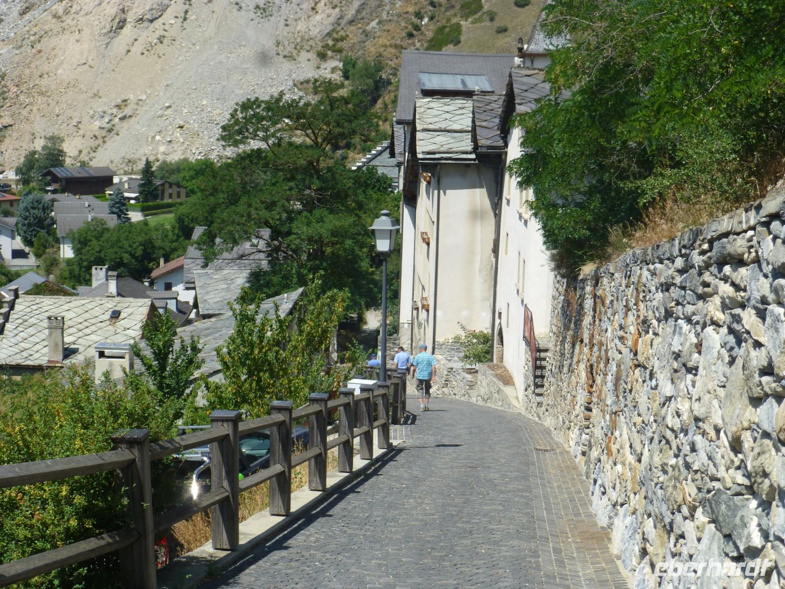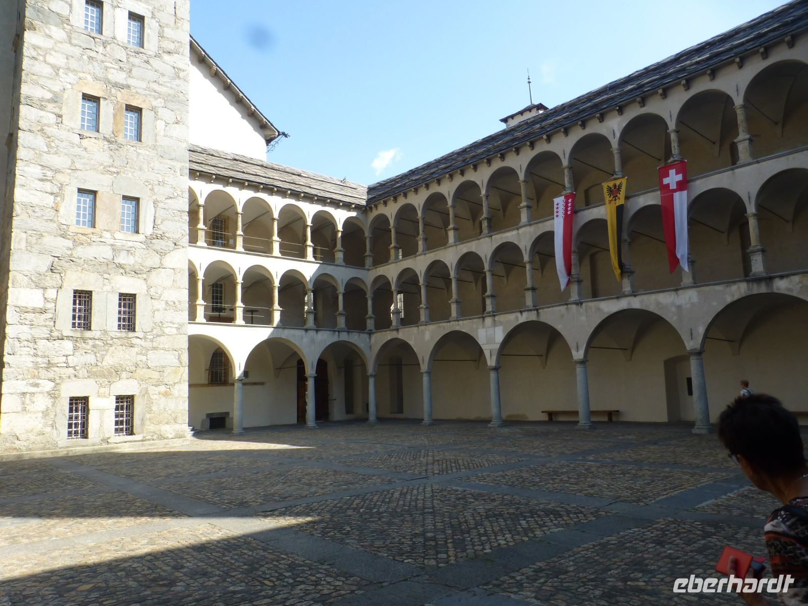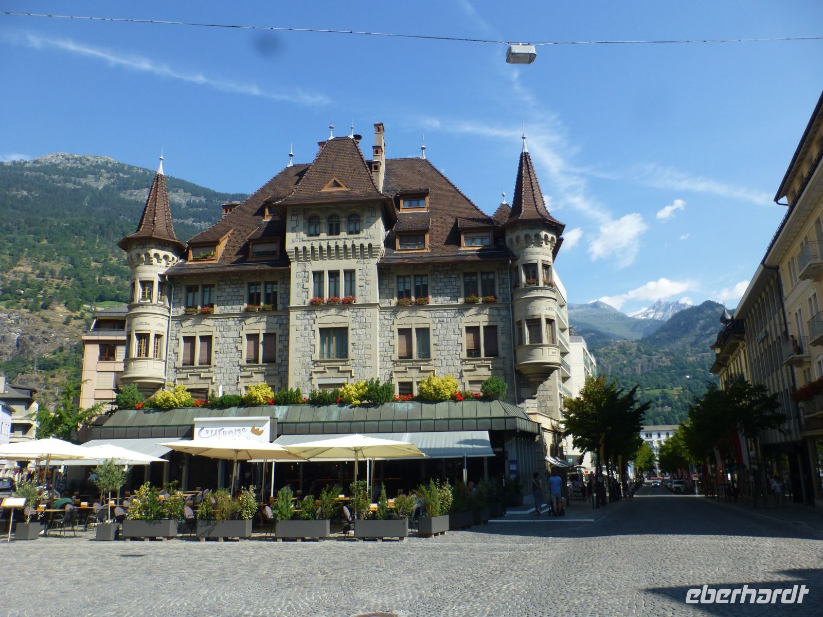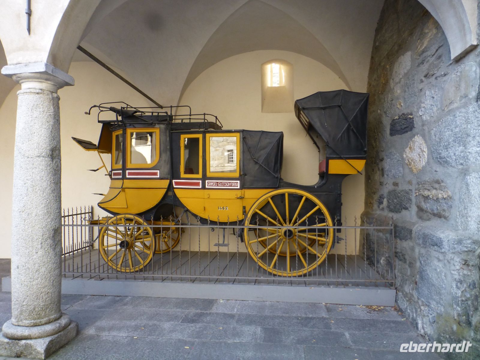Unsere Koffer hievt Jan in den Bus, dann geht es weiter nach Brig. Ein wichtiger Verkehrsknotenpunkt, ähnlich Altdorf, die Kopfstation des Simplonpasses. Herr Stockalp hat gut verdient daran, an seinem Postkutschenmonopol und wohl noch an dem einen und anderen. Sein Palais, das größte weltliche Barockgebäude der Schweiz, mit hohen Türmen und dem weiten, von Arkaden gesäumten Innenhof steht an der alten Simplonstraße und demonstriert Macht. Im Hof steht eine Postkutsche und wir können uns ein Bild vom damaligen Reisen machen. Unser Reisebus ist auch gelb und eine höchst bequeme Kutsche. Brig scheint um 10 Uhr noch gar nicht richtig wach zu sein; ein ruhiger, sehr gepflegter Ort.