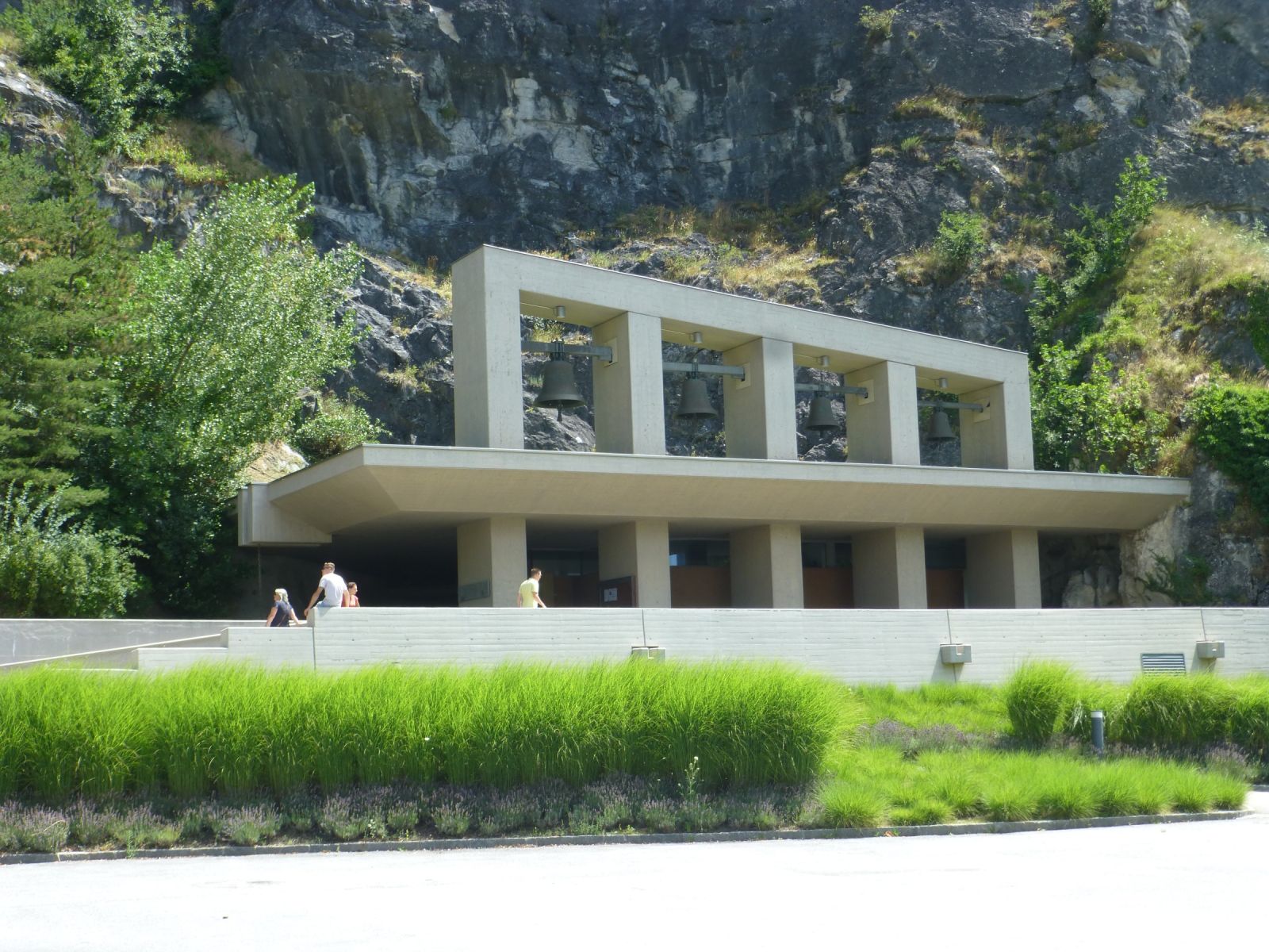 Es geht weiter nach Raron, bedeutsam durch seine moderne Felsenkirche, 1974 geweiht, und das Grab von Rainer Maria Rilke. Die Kirche mit ihren 500 Sitzplätzen, gänzlich von Fels umhüllt, ist beeindruckend. An diesem heißen Tag erfrischt uns auch die Kühle. 10 Unentwegte nehmen auch den steilen Anstieg zur Kirche auf sich, die genau über der Felsenkirche liegt. Hier steht eine Burg, das ehemalige Pfarrhaus und eine sehr schöne Kirche mit alten Wandfresken, die das Jüngste Gericht mit Fabelwesen zeigen. An der Südseite der Kirche mit Blick ins Tal liegt der Dichter Rilke. Mit 51 – 1926 – starb er an Leukämie und wollte hier begraben werden. Der Grabspruch stammt von ihm „Rose, oh reiner Widerspruch, Lust, Niemandes Schlaf zu sein unter soviel Lidern.“ Ein wenig mehr Zeit wäre schön, es gibt ein kleines Museum zur hiesigen Burg und Rilke, doch unsere Gruppe wartet auf uns und so eilen wir nach unten. Die Pause wurde nicht lang, auf Bänken unter Bäumen und wir winkten uns hier und dort auch zu, von der Höhe nach unten und wieder hinauf.