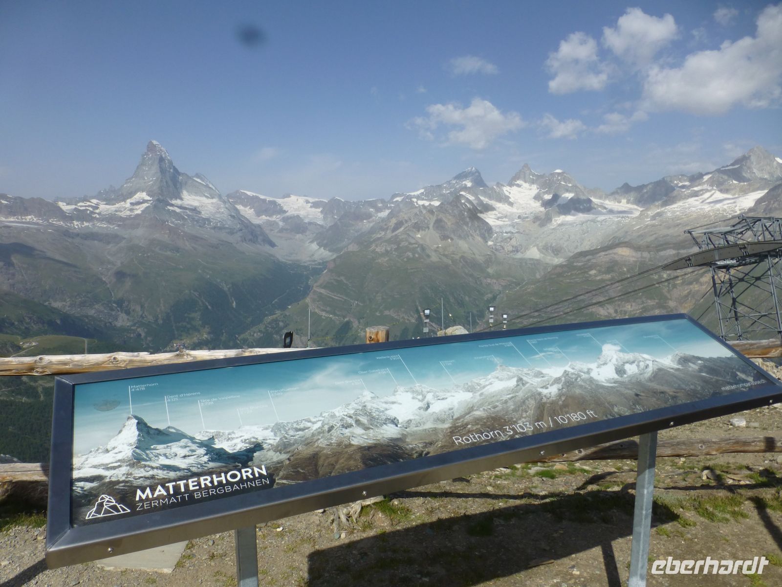 Die Standseilbahn bringt uns durch einen 1500 m langen Tunnel auf die Sunnega. Aussteigen zum Akklimatisieren. Und sehr gerne bleiben wir erst einmal hier, denn der Blick auf das Matterhorn ist überwältigend. Dann geht es weiter mit Kabinenbahn und Gondel über Blauherd aufs Rothorn, 3103 m hoch. Auf dem Gipfel sind alle Berge in Sichtweite genannt mit ihren jeweiligen Erstbesteigern und den Bergführern, ohne die diese Leistung nicht möglich gewesen wäre. Wir sehen unser morgiges Ziel, das Kleine Matterhorn. Das Gornergrat, die Hörnlihütte, das Basislager für die Erklimmung des Matterhorns – all das ist in unserem Blick.
