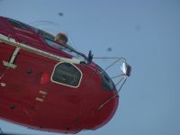 Als wir aufbrechen wollen, werden Vorbereitungen getroffen, das schwere Bündel, das auf der Restaurantterrasse liegt, für den Abflug vorzubereiten. Der Hubschrauber kommt, nimmt die Last an den Haken und – bricht ab. Das Paket ist zu schwer und das ziemlich. Der Hubschrauber kann 700 kg fliegen, das Gut wiegt jedoch 1000 kg. Da hat sich jemand ordentlich verschätzt.