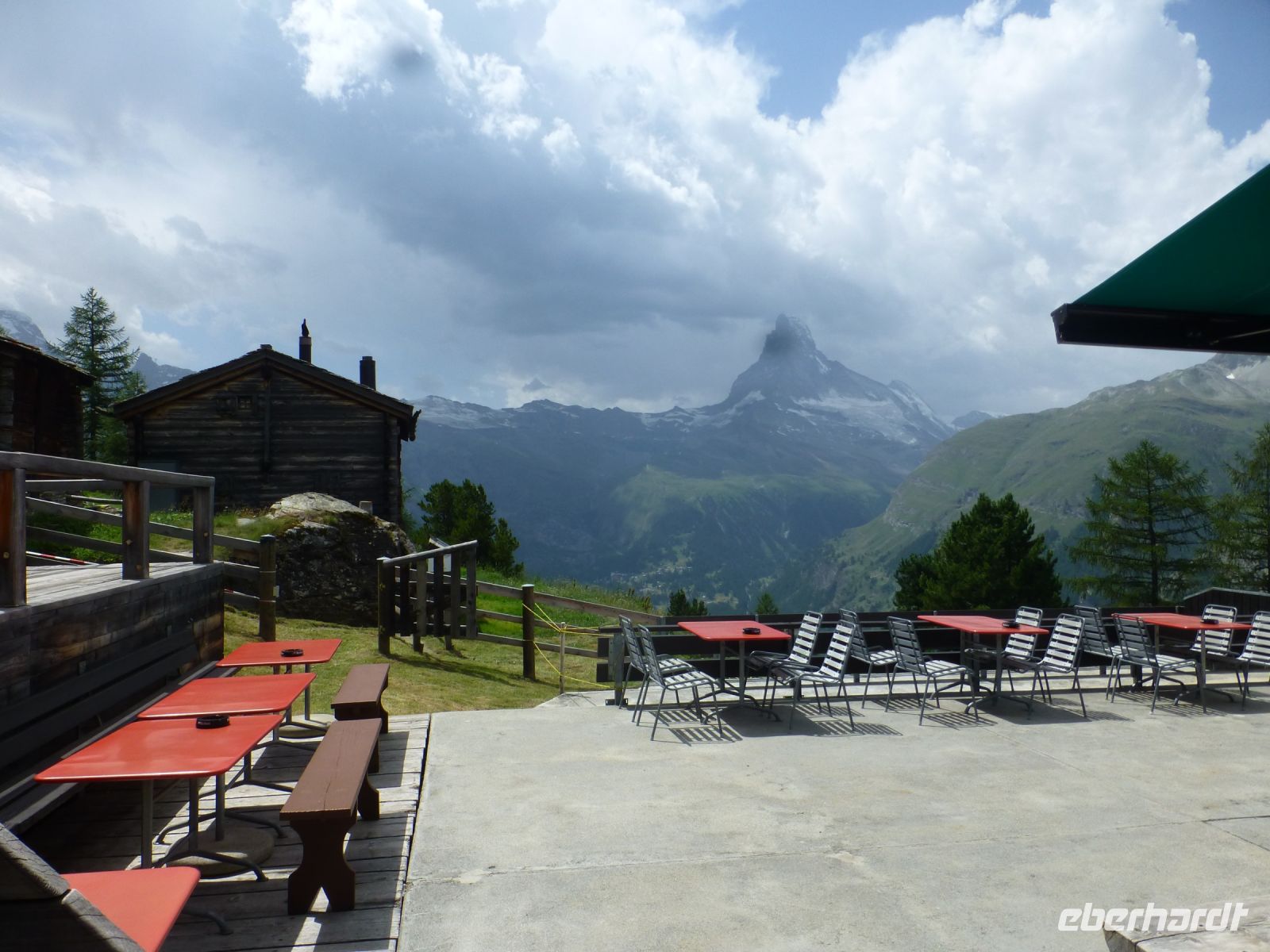 Wir fahren runter zum Blauherd und unternehmen von dort die Wanderung auf dem Blumenweg. Über die blühende Alp führt der Weg, entlang von Hinweistafeln, die einzelne Blumen, die wir sehen, beschreiben. Blumen und Ausblick buhlen um unsere Aufmerksamkeit. Wir erreichen Tufteren, ein Ausflugslokal mit einer schönen Terrasse und – einem grandiosen Blick auf das Matterhorn. Dieser markante Berg ist omnipräsent und allzugerne schaut man ihn an. Stärkung mit Kaffee Fertig, Kuchen, Bier – wir bleiben sitzen und genießen.